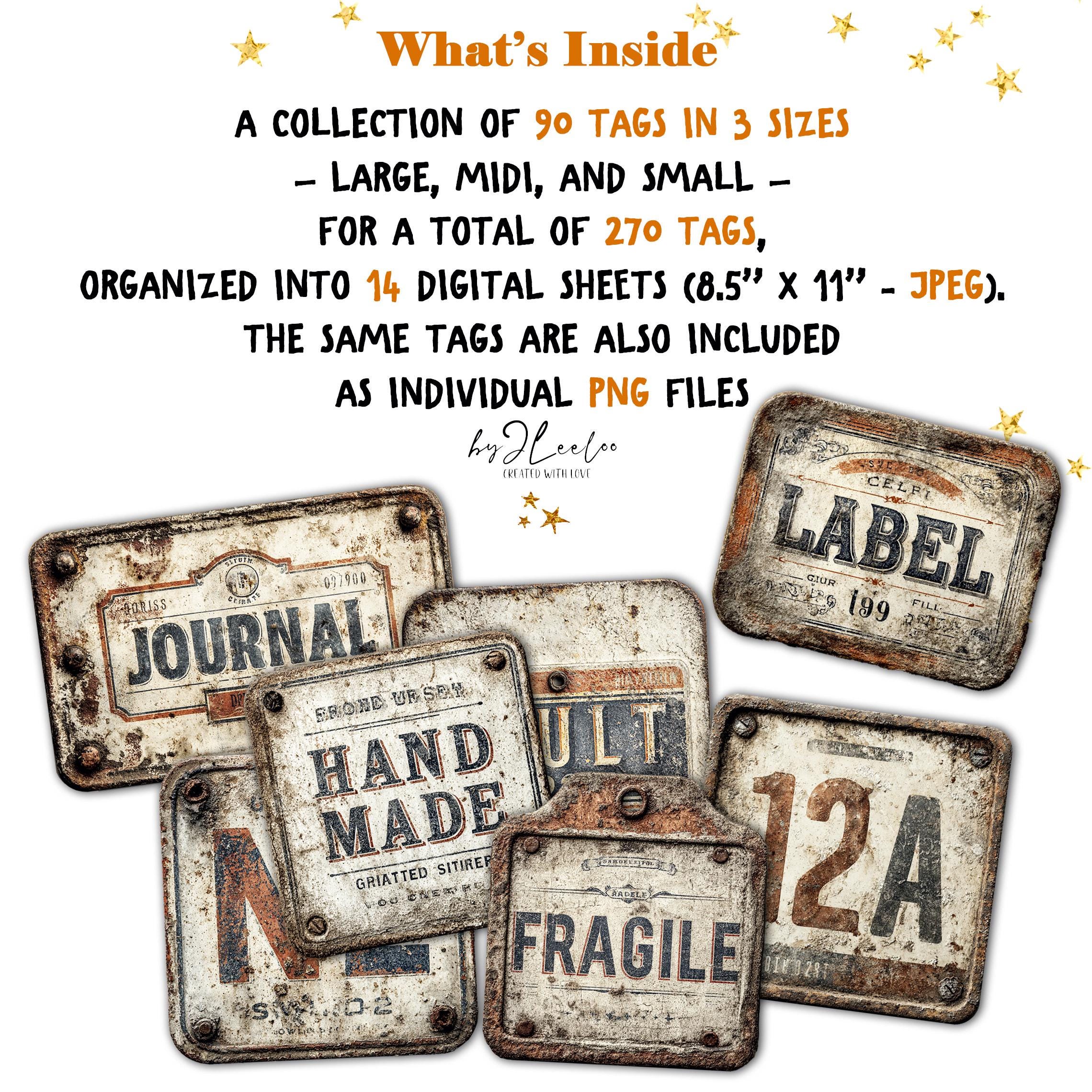 ● 90 industrial-style vintage tags created in 3 sizes for a total of 270 labels