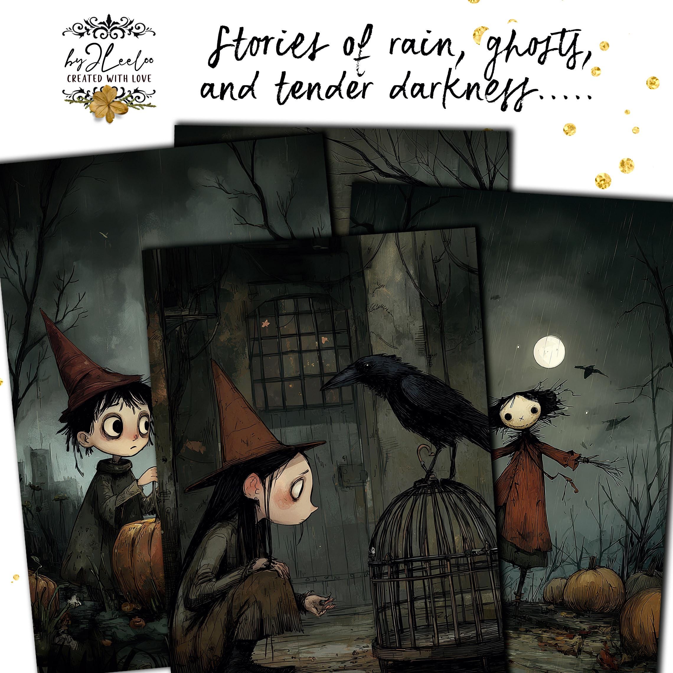 Tiny souls wander through forgotten paths, stitched dolls hold broken umbrellas, and ghostly friends share quiet moments beneath the weeping sky.