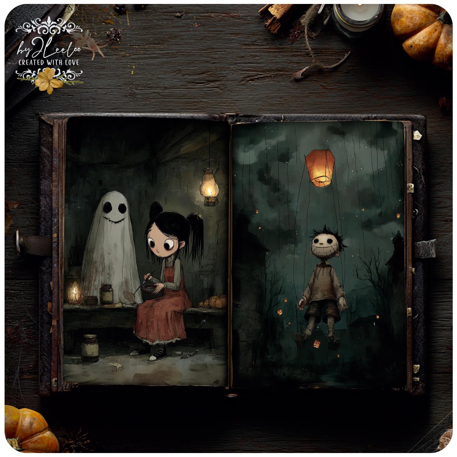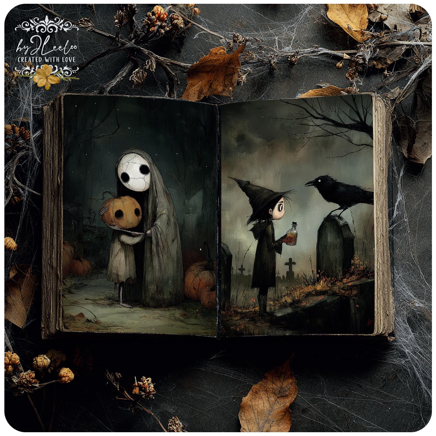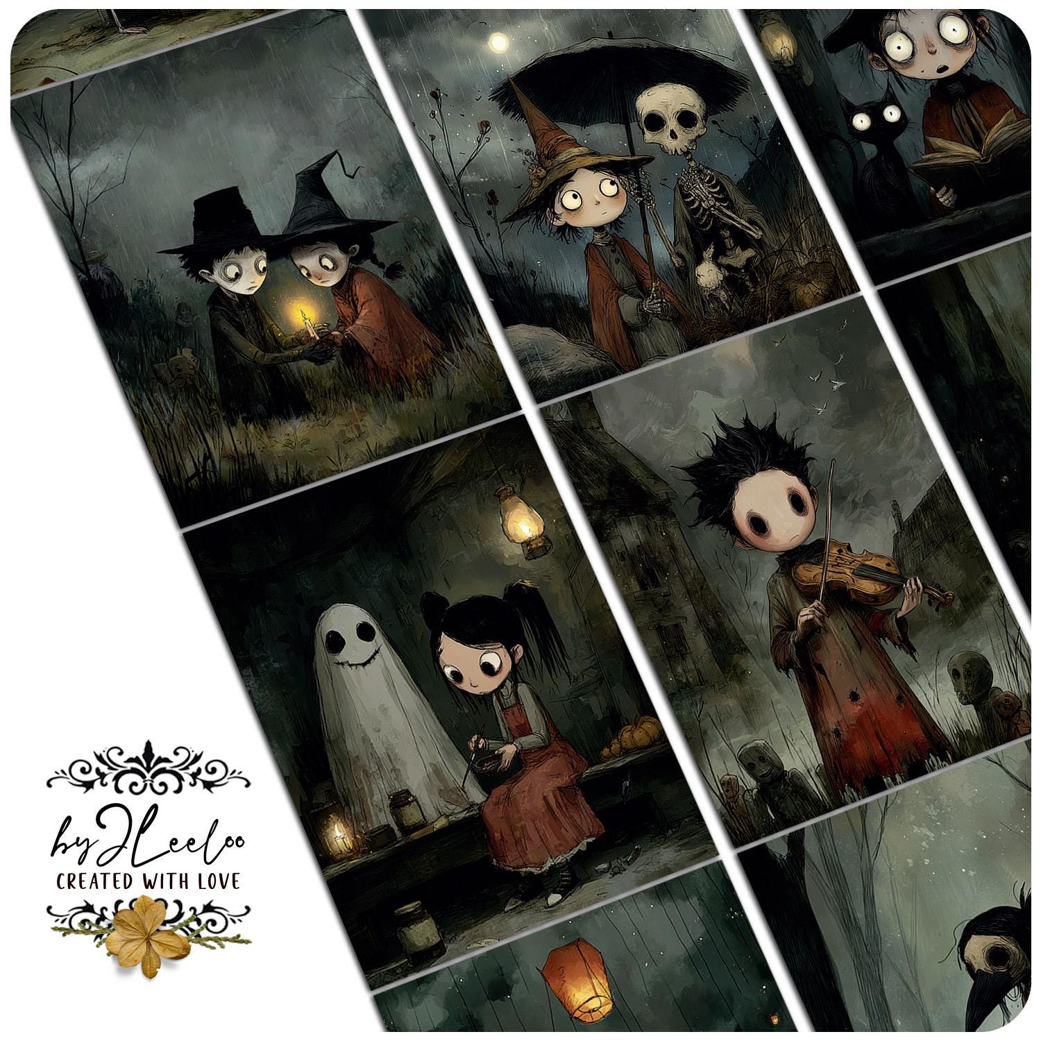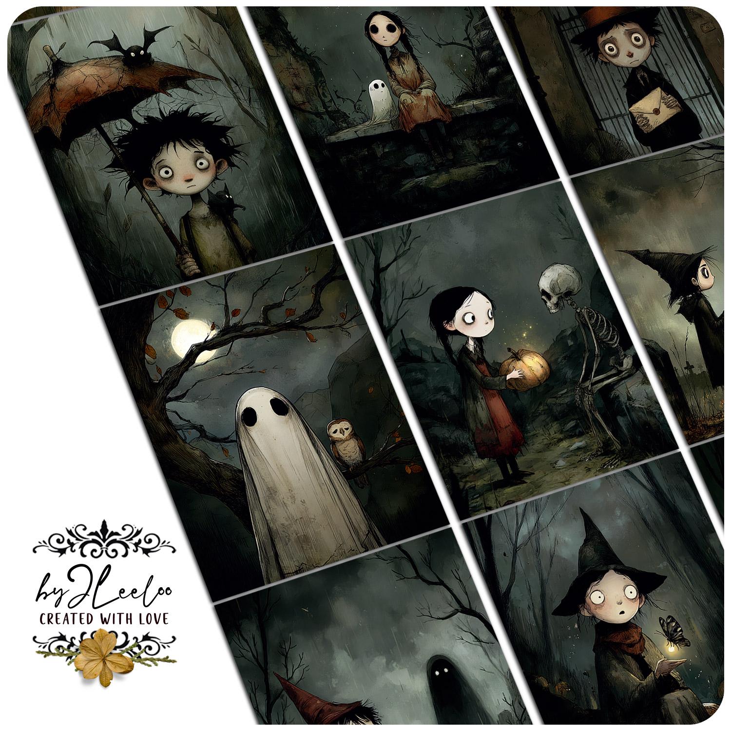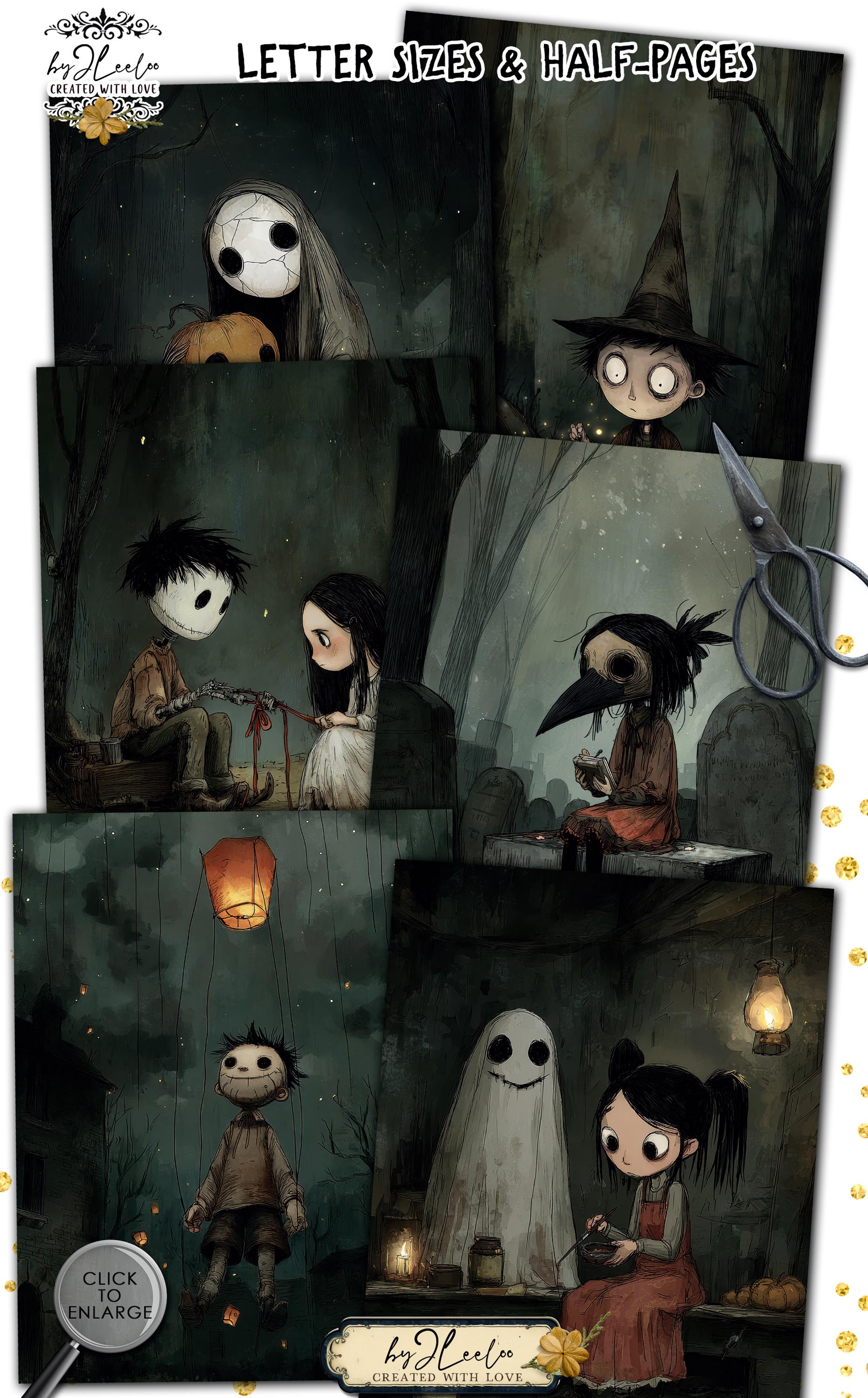 Each image captures the bittersweet charm of a whimsical Halloween โ haunting yet tender, strange yet full of heart.