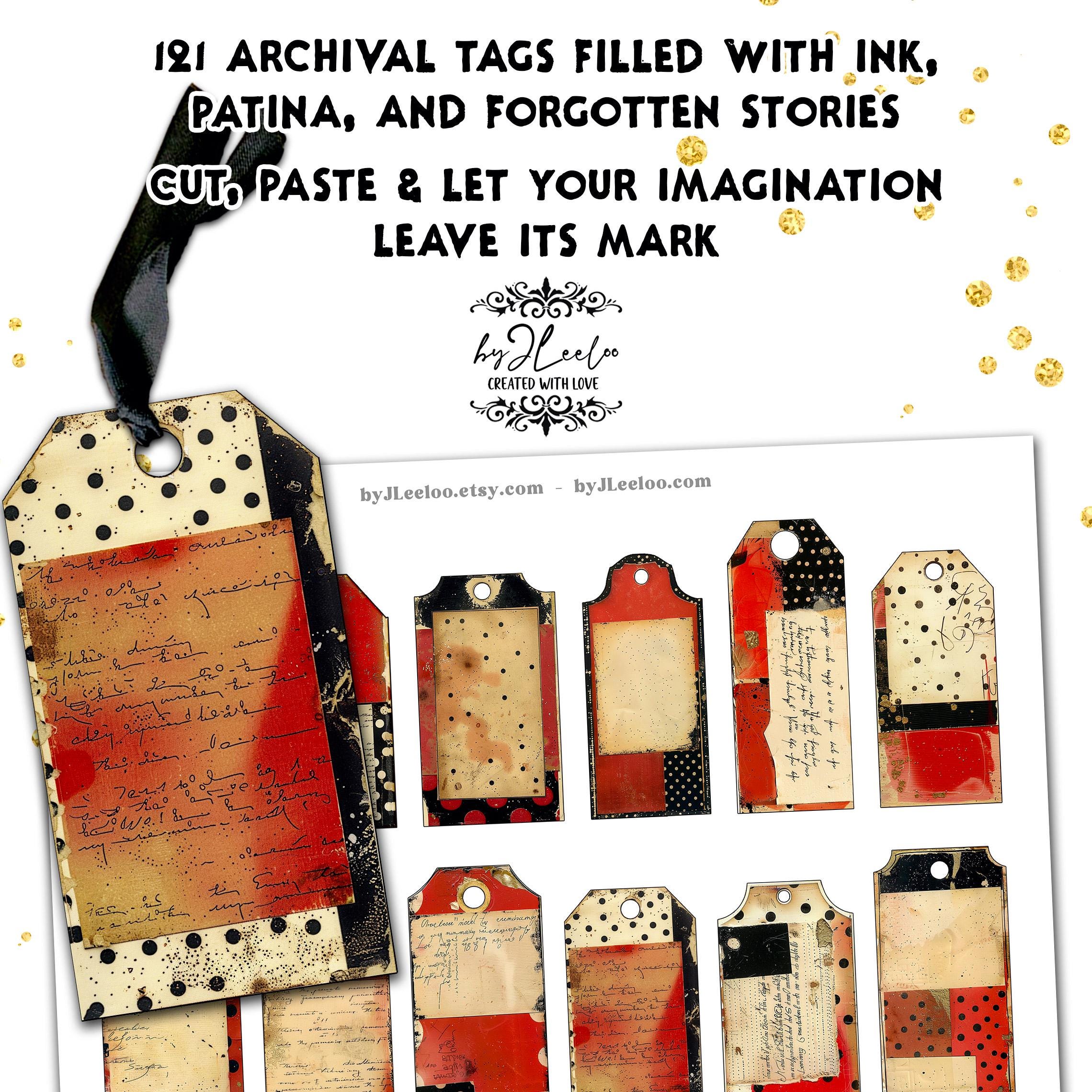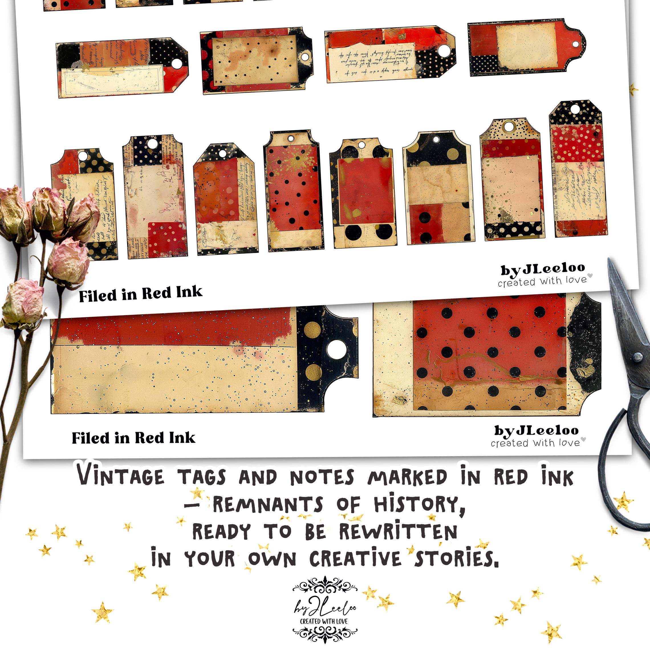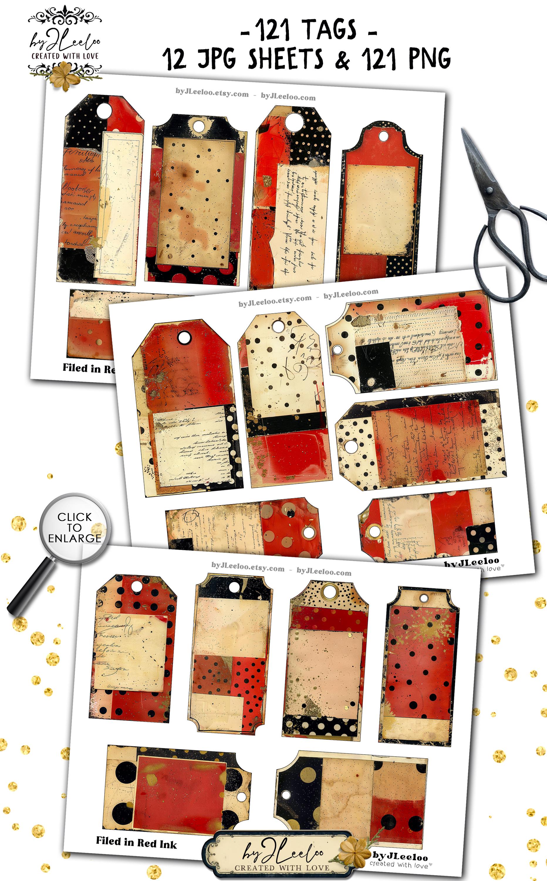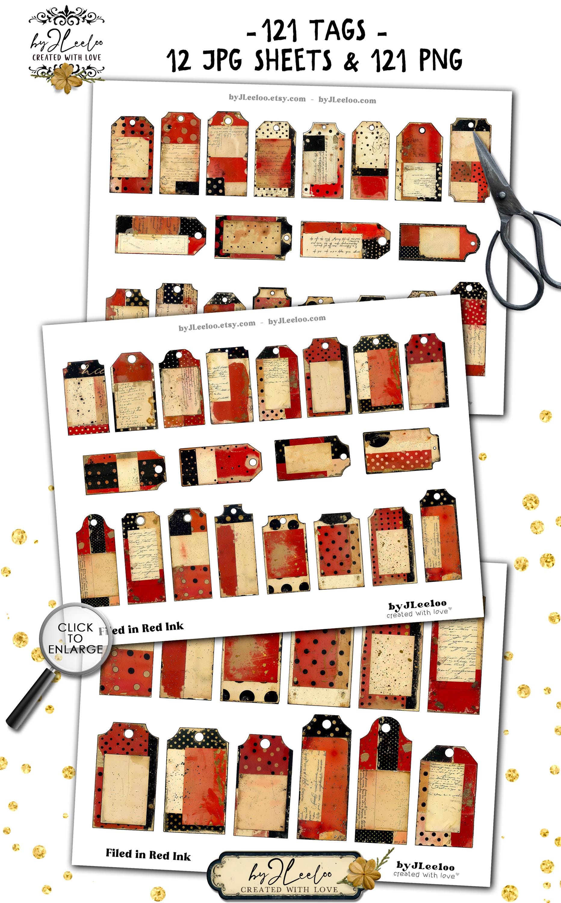 FILED IN RED INK – 121 Vintage Tags for Junk Journals & Collage | Scrapbooks Crafts Grunge Ephemera Labels with Aged Ink Texture | tl357