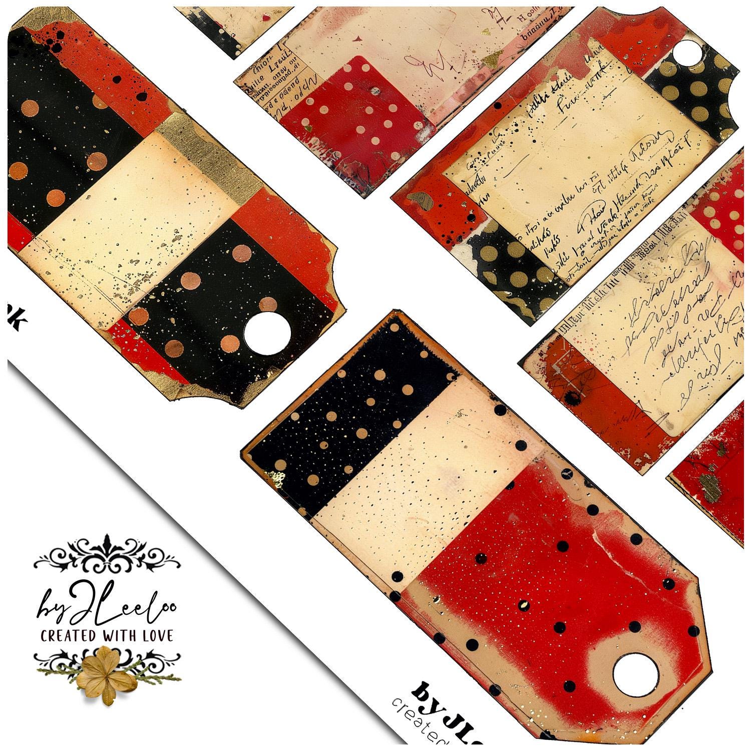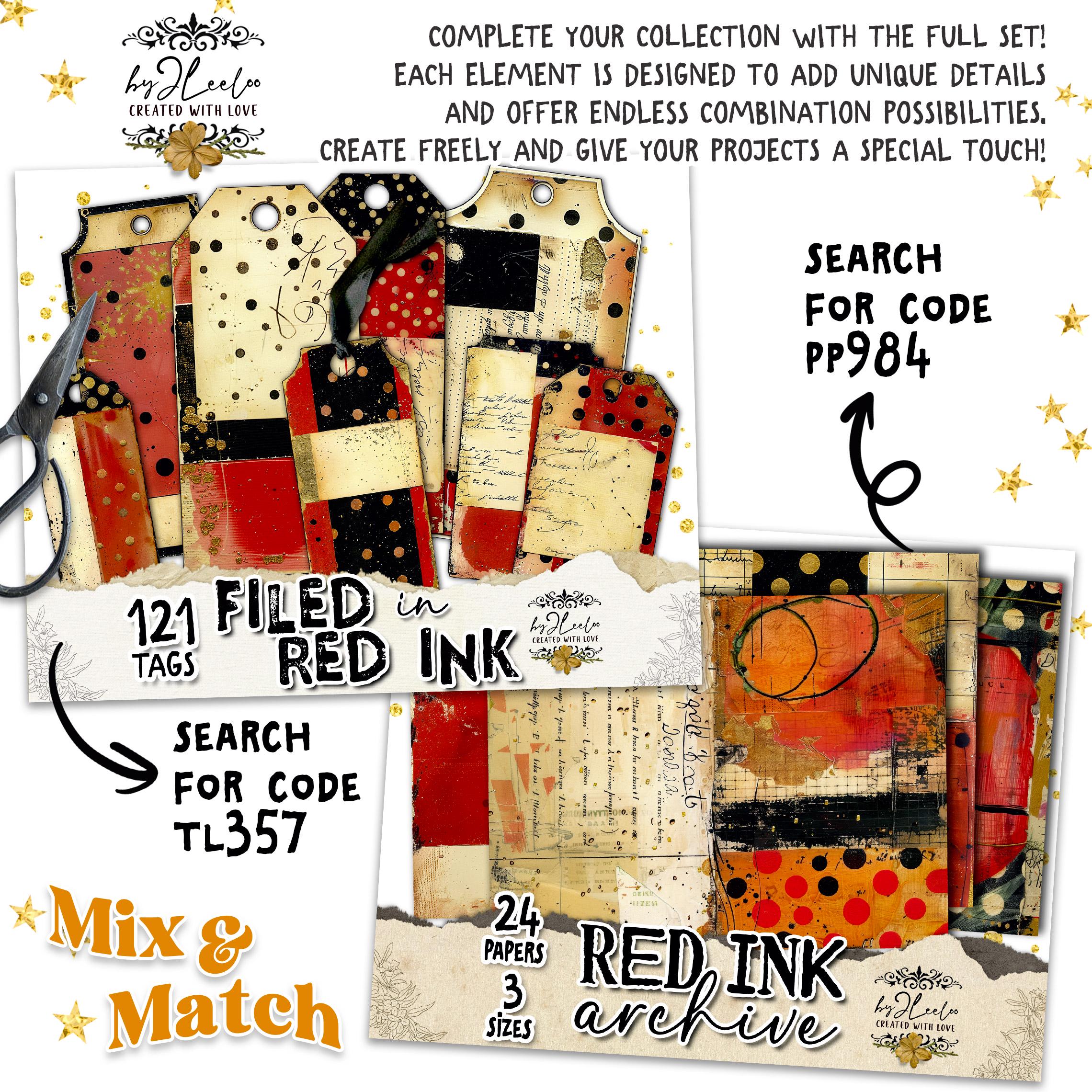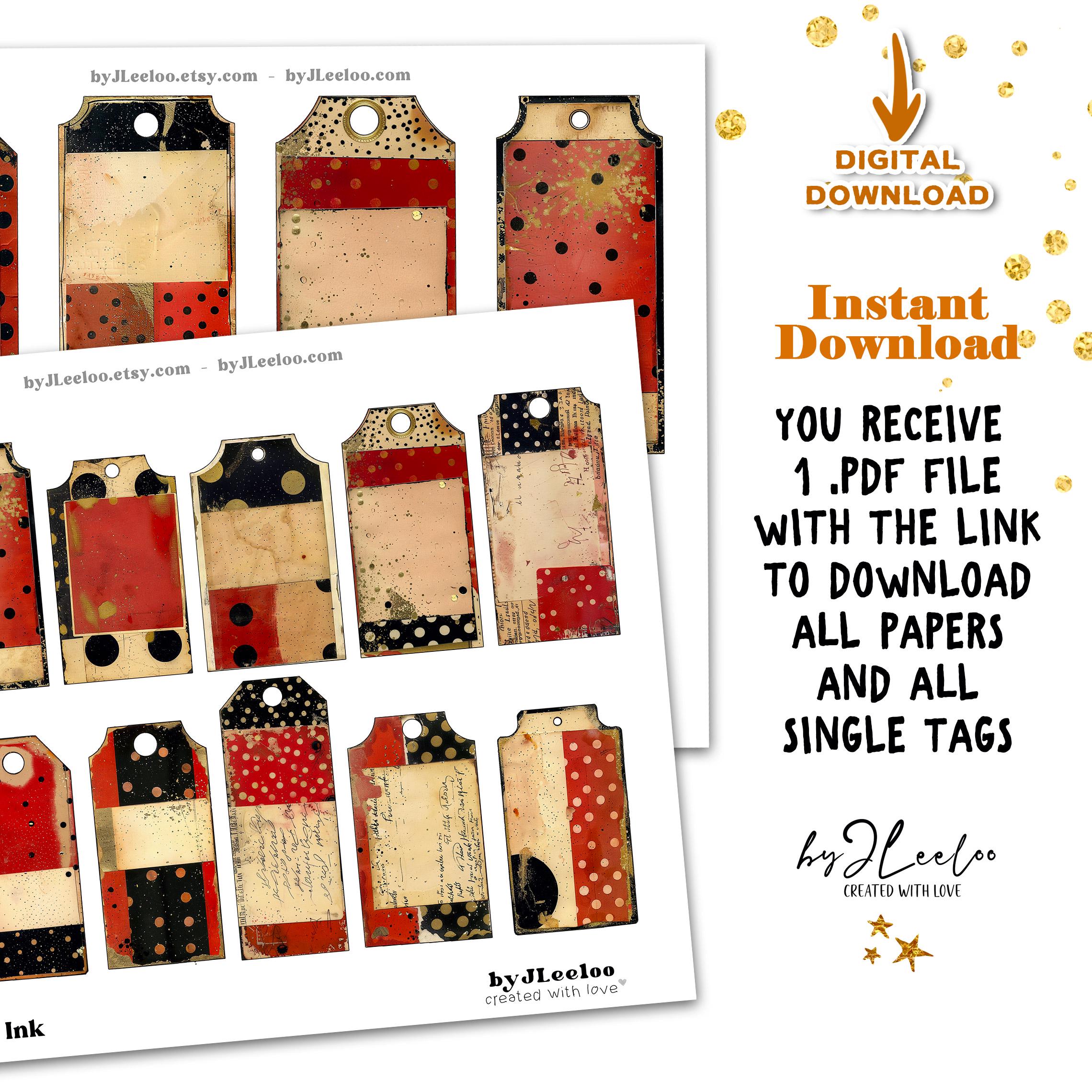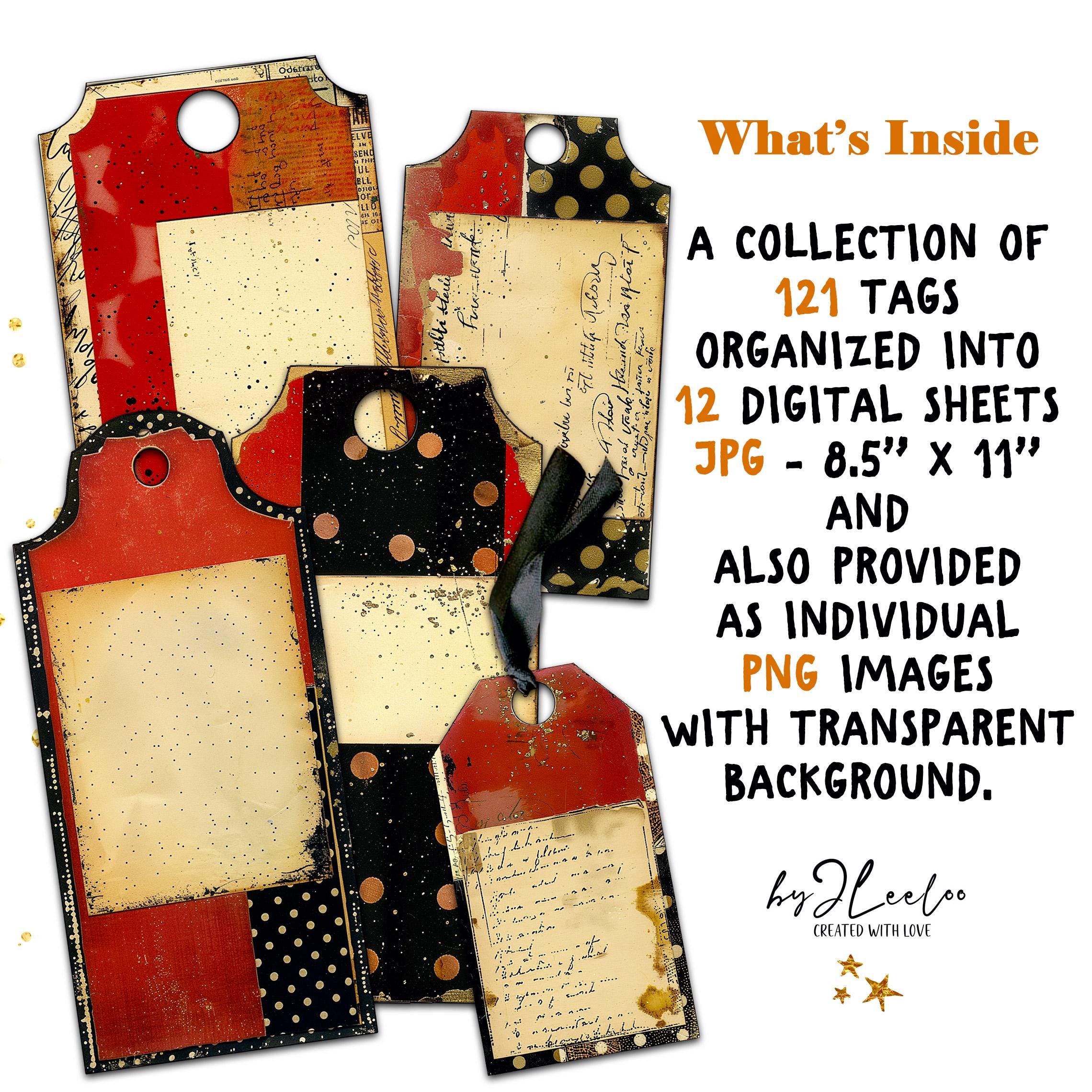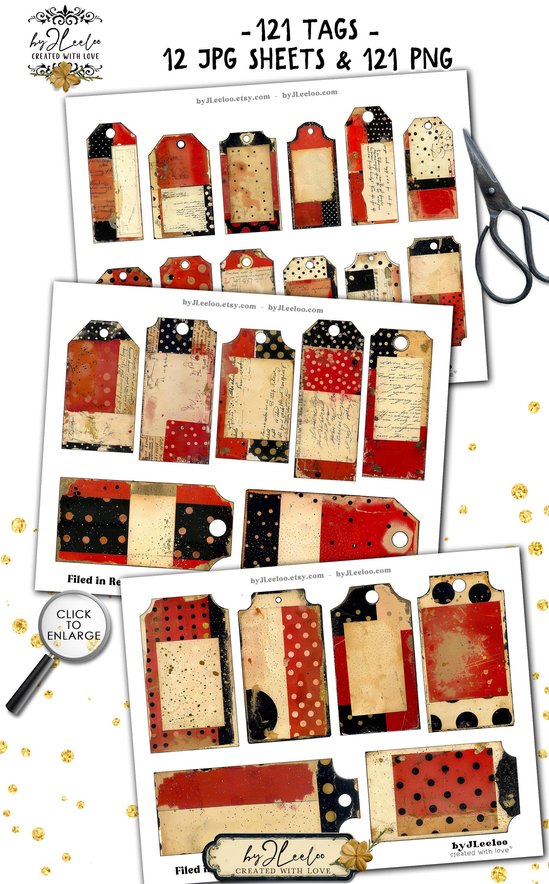 FILED IN RED INK – 121 Vintage Tags for Junk Journals & Collage | Scrapbooks Crafts Grunge Ephemera Labels with Aged Ink Texture | tl357