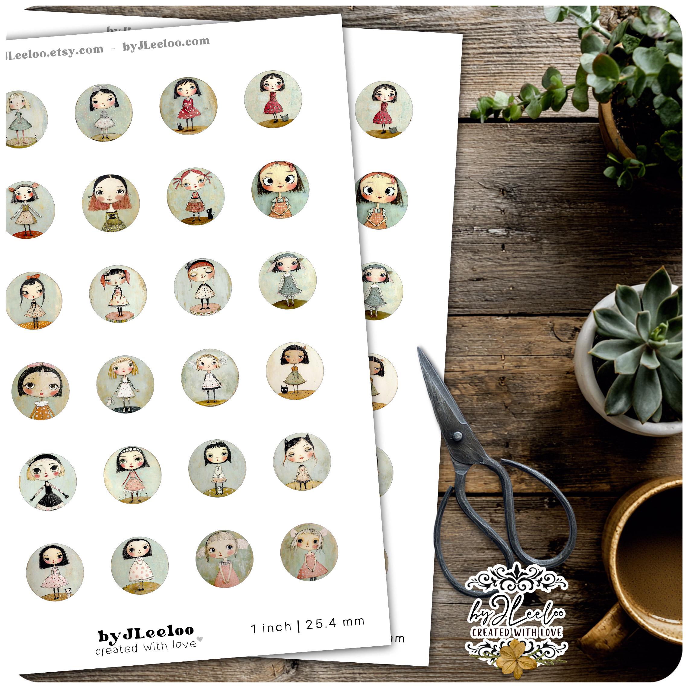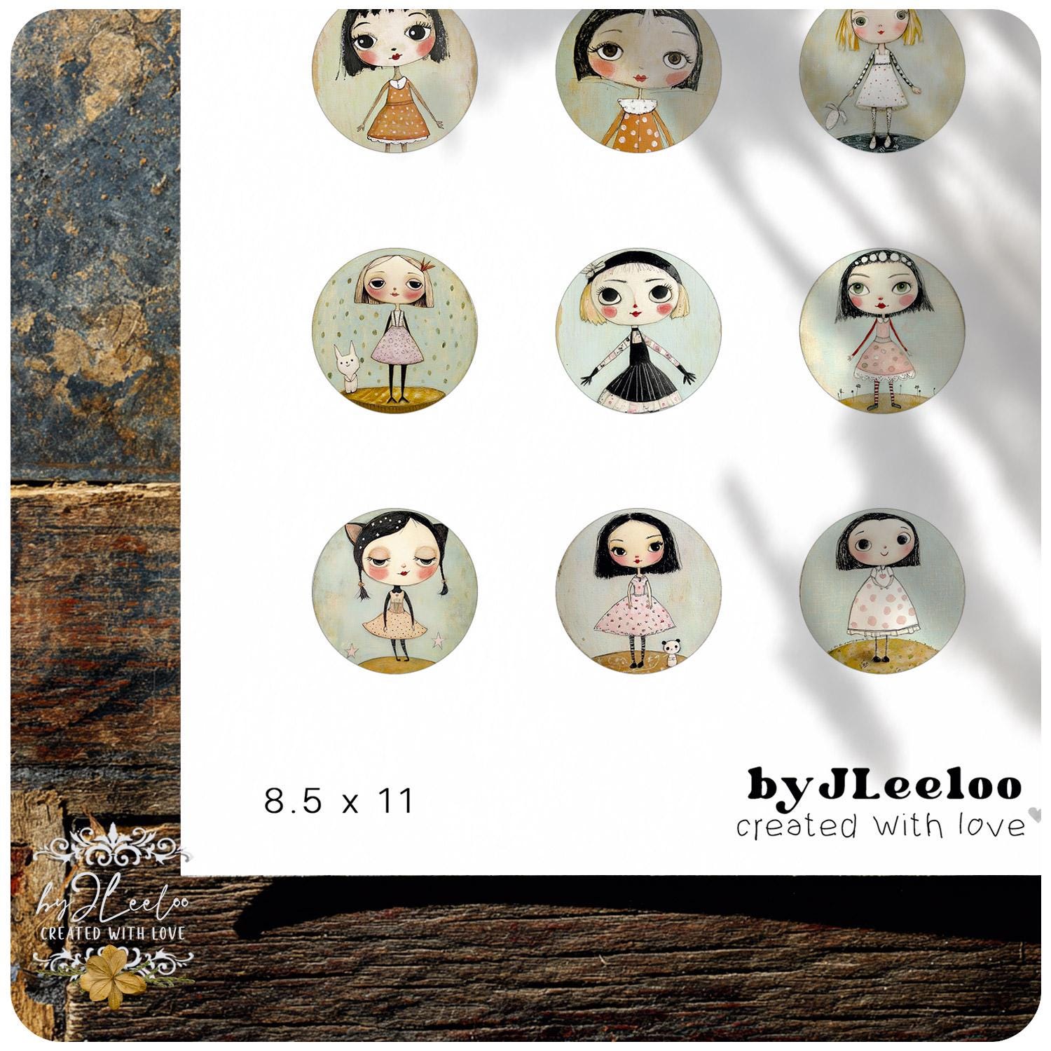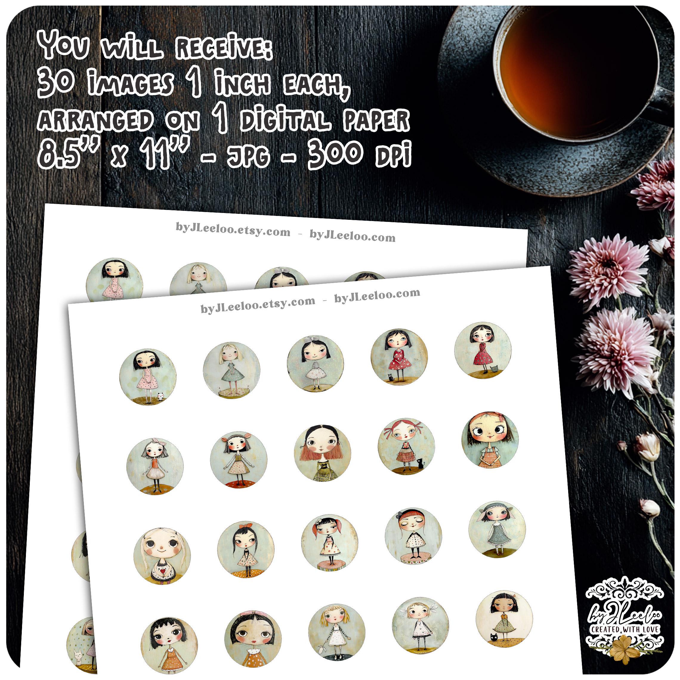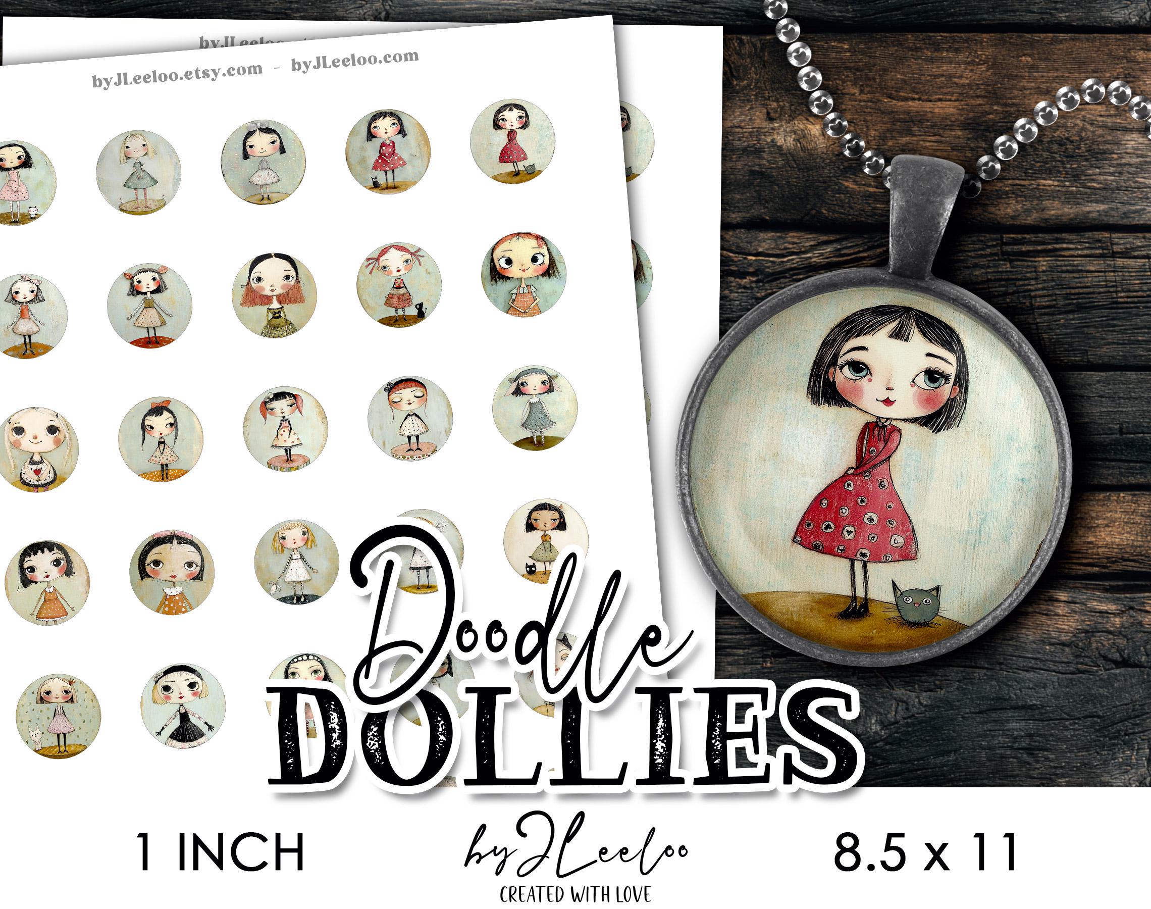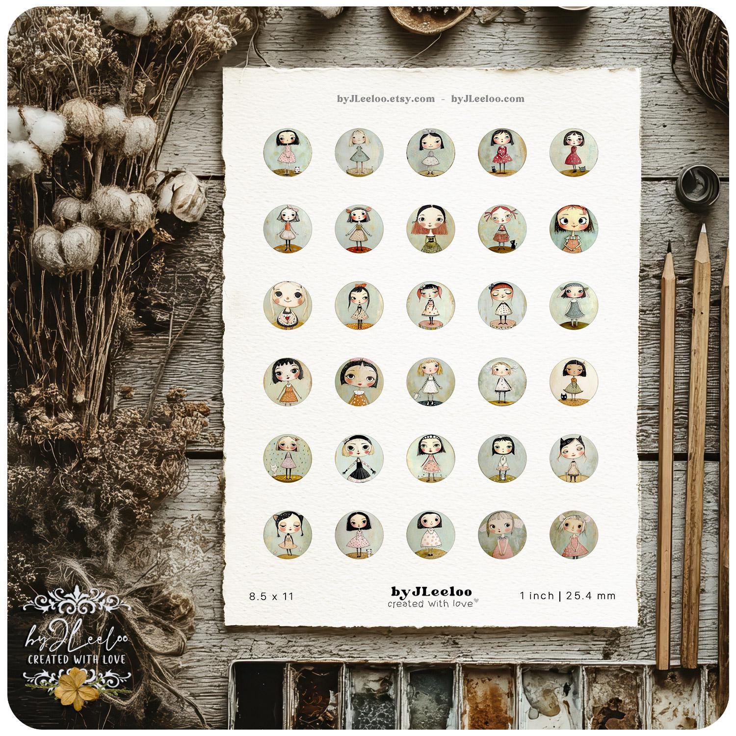 DOODLE DOLLIES 30 whimsical 1 inch round images vintage girls | printable circles for jewelry, crafts, inchies & journalsMixed media | tn844