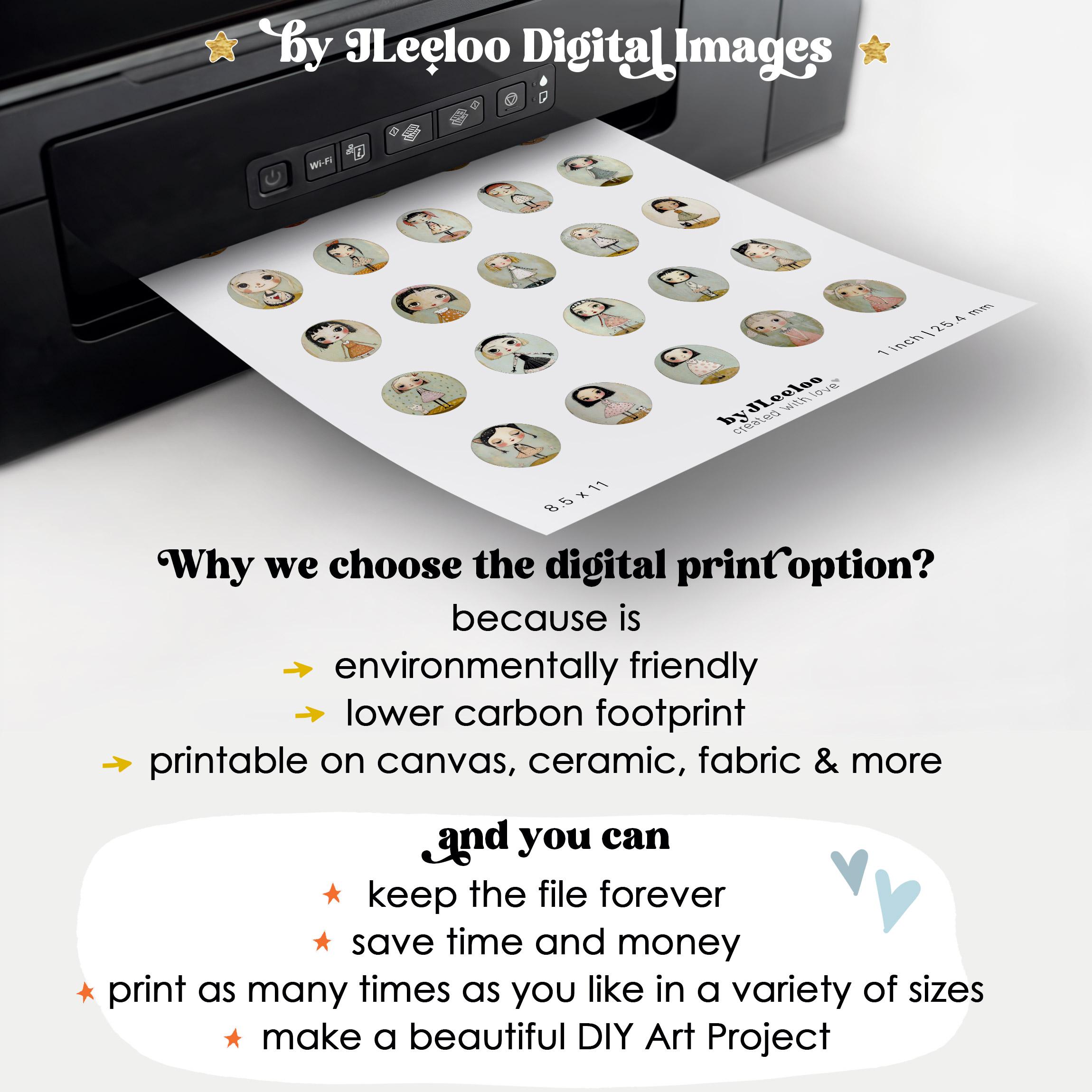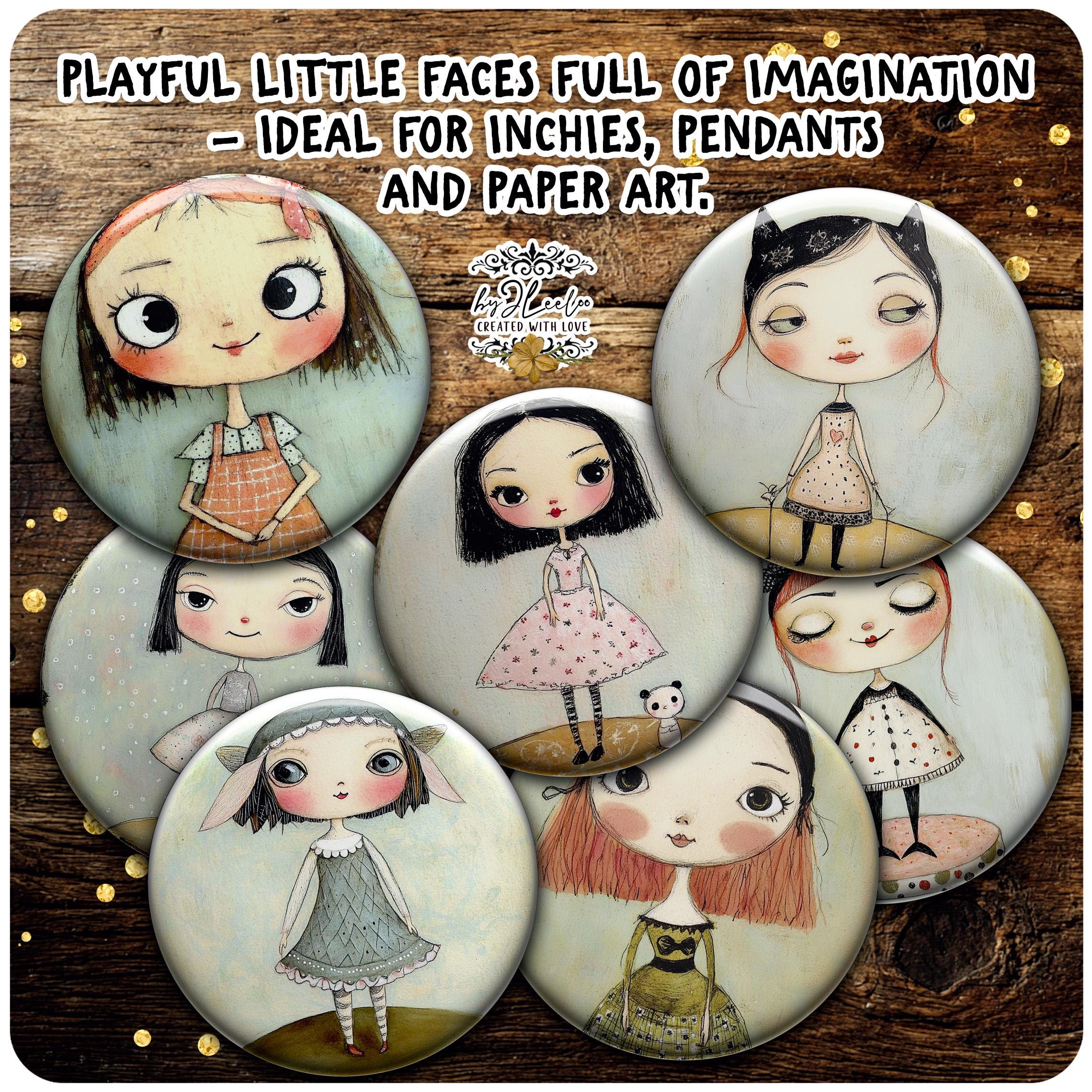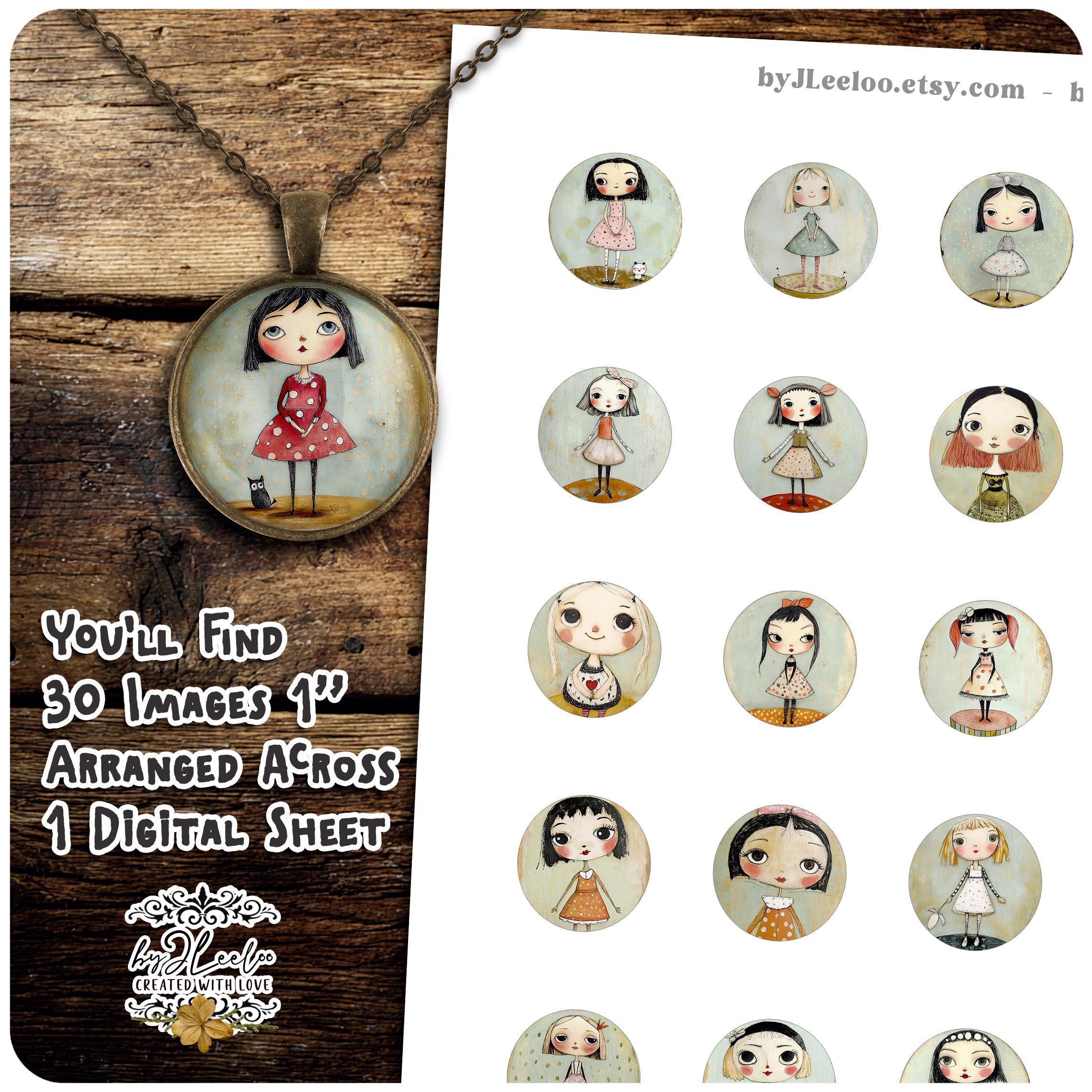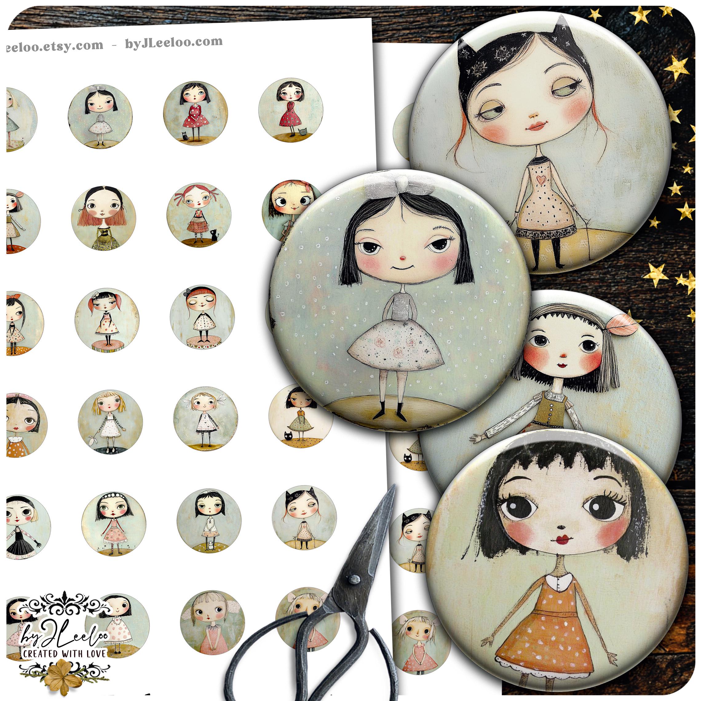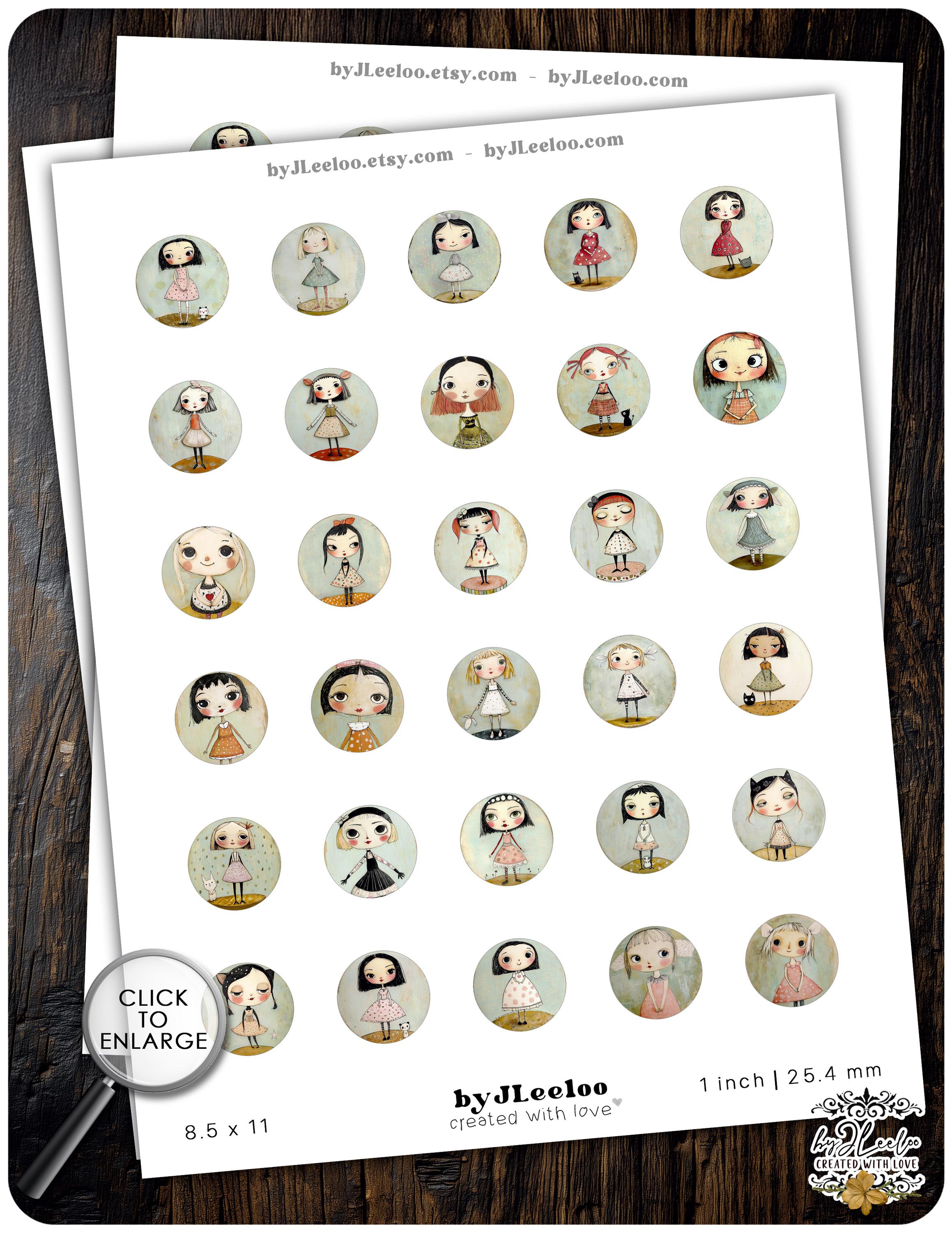 DOODLE DOLLIES 30 whimsical 1 inch round images vintage girls | printable circles for jewelry, crafts, inchies & journalsMixed media | tn844