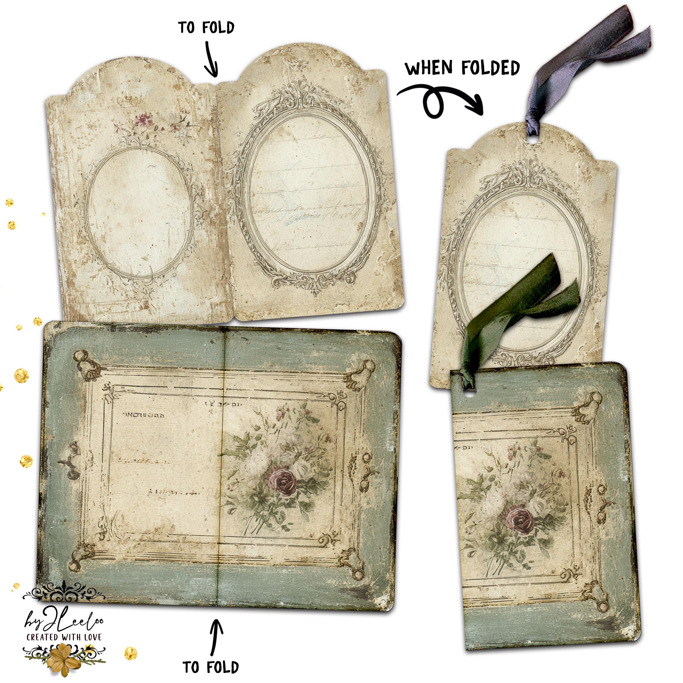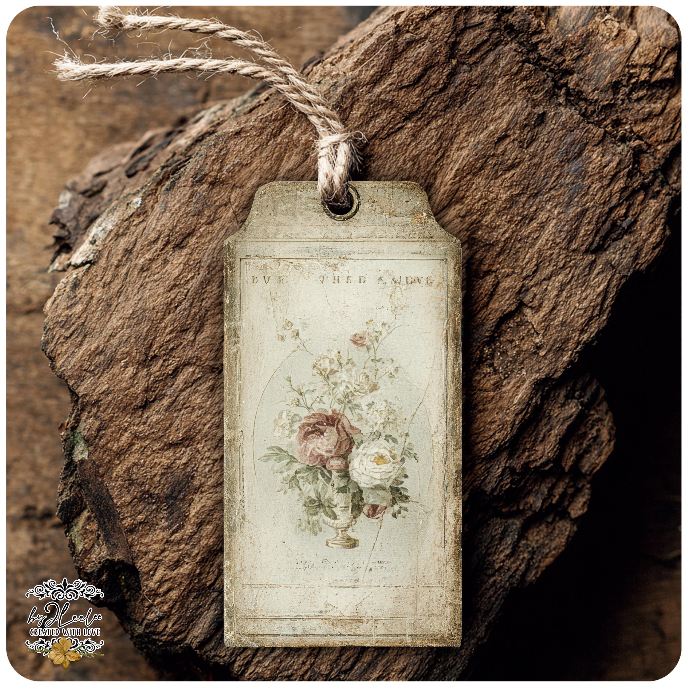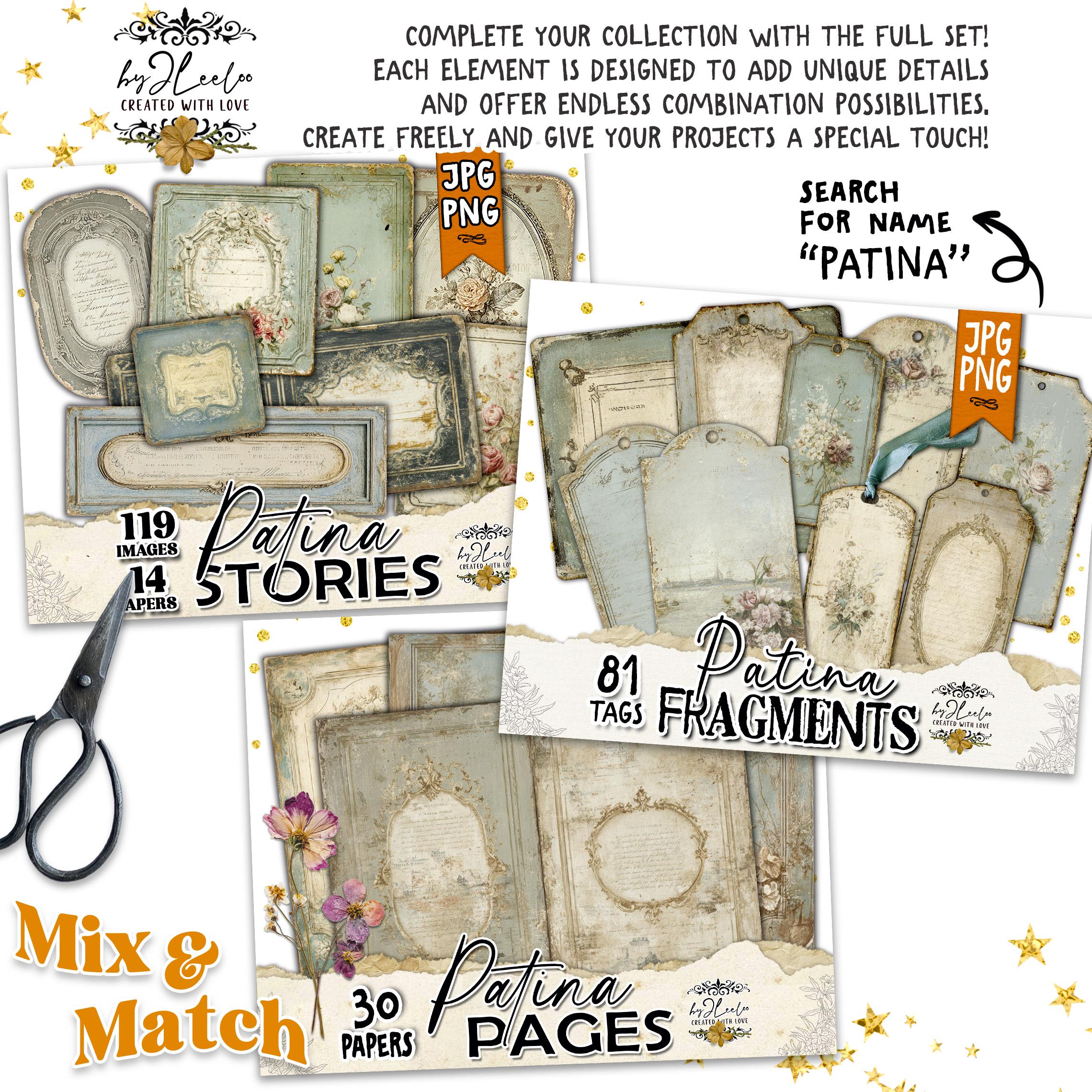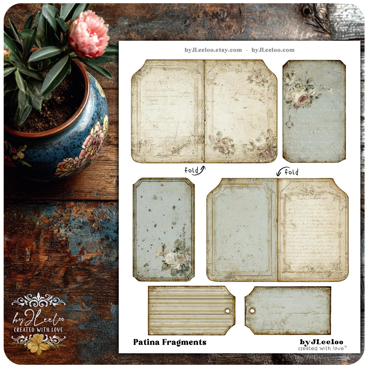 Patina Fragments gathers delicate tags in soft hues of blue and parchment, adorned with faint florals and aged script — each one a small relic of forgotten letters and quiet dreams.