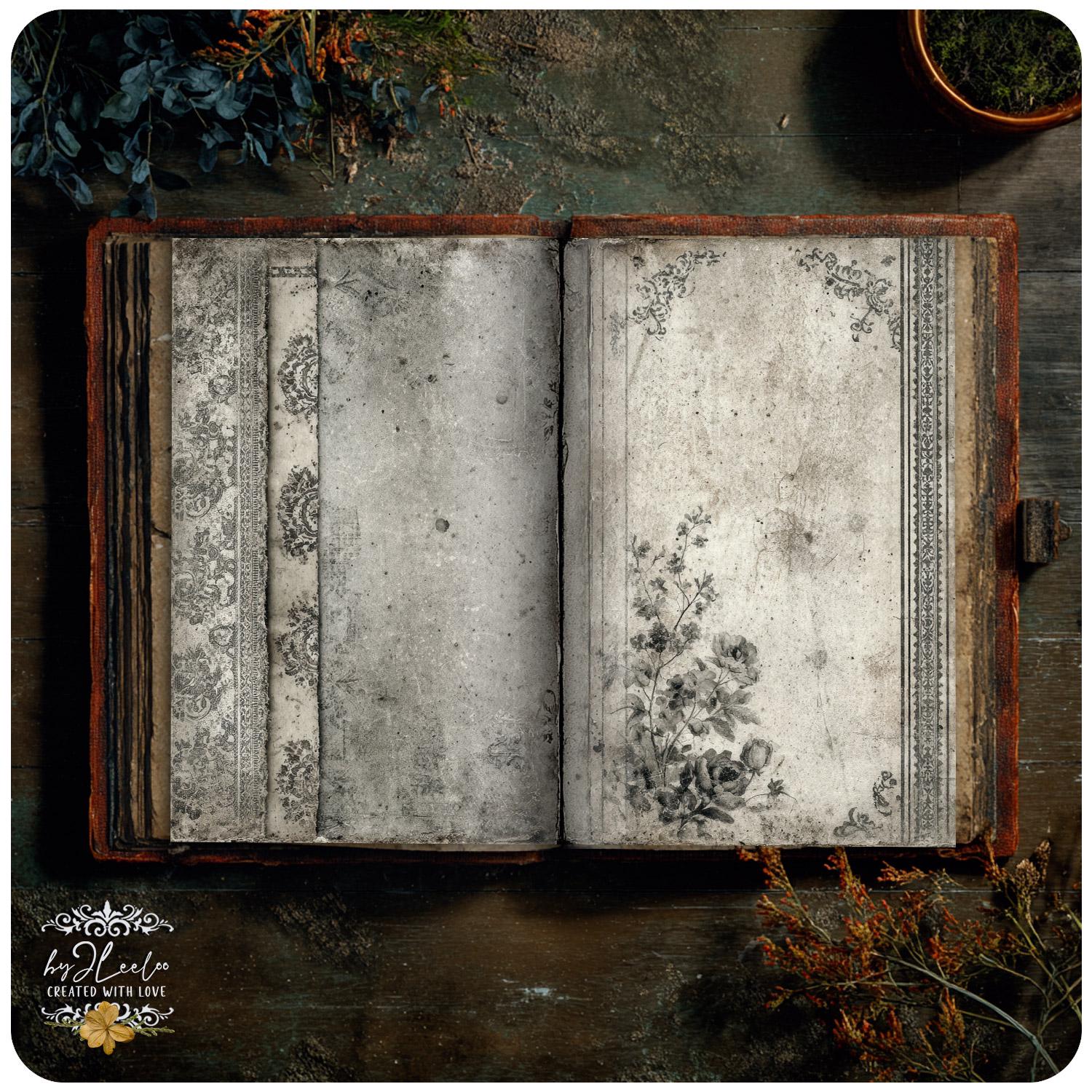 The Pale Ledger gathers softly aged papers in muted shades of grey, ivory, and ash — weathered textures that speak of forgotten pages and delicate decay.