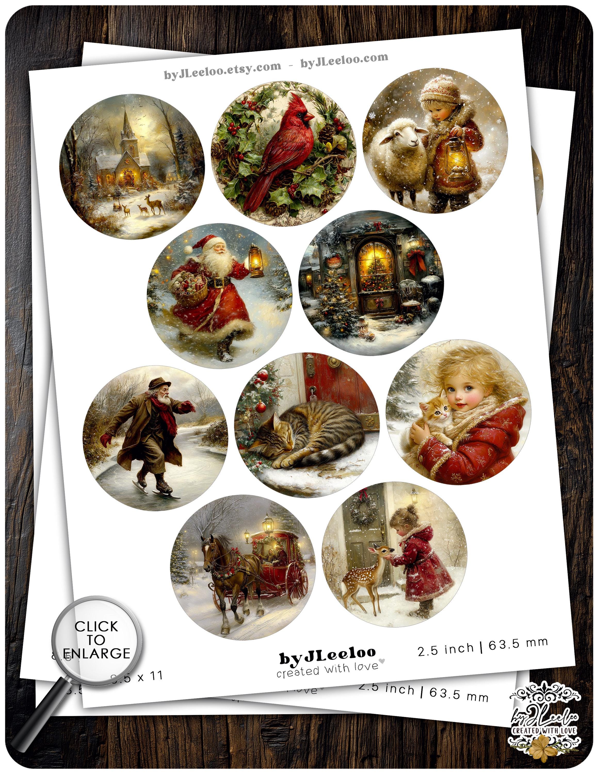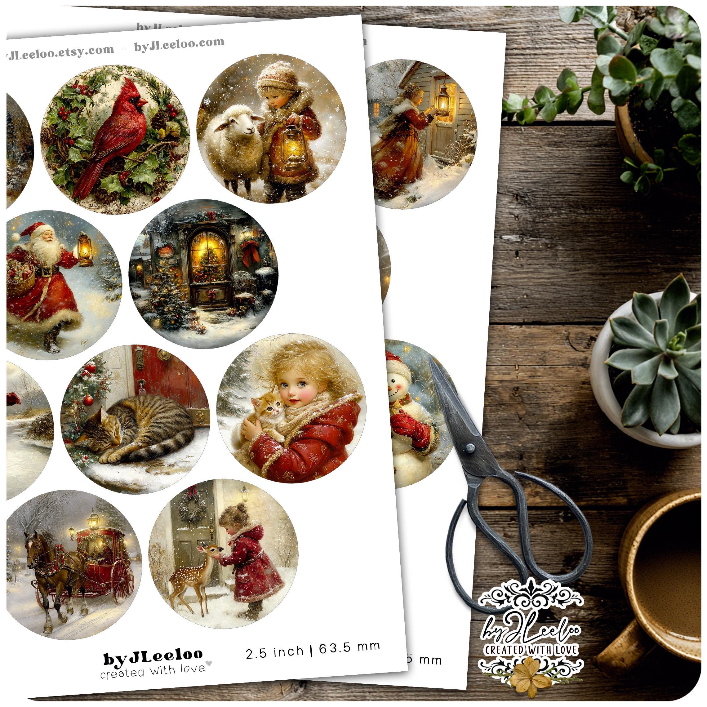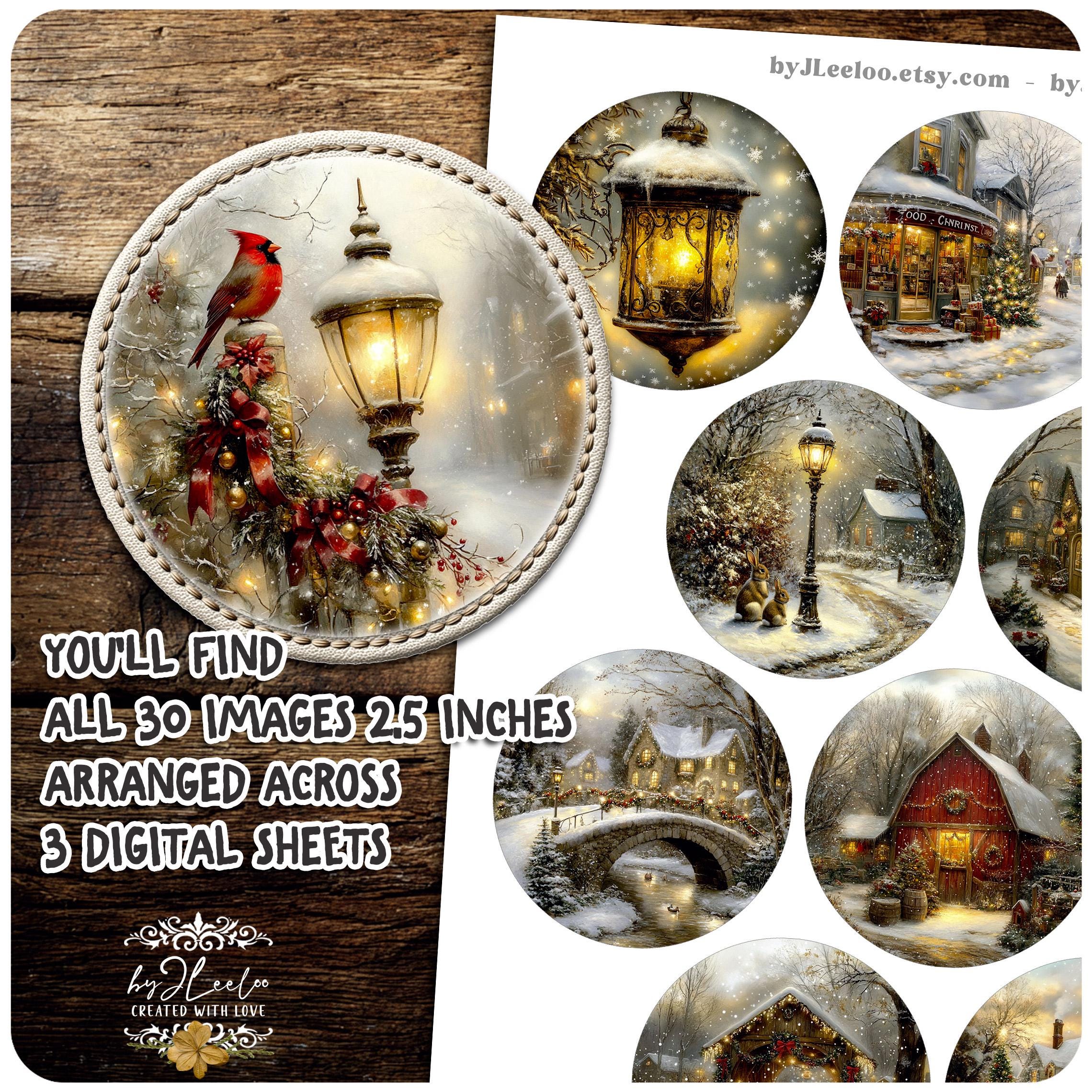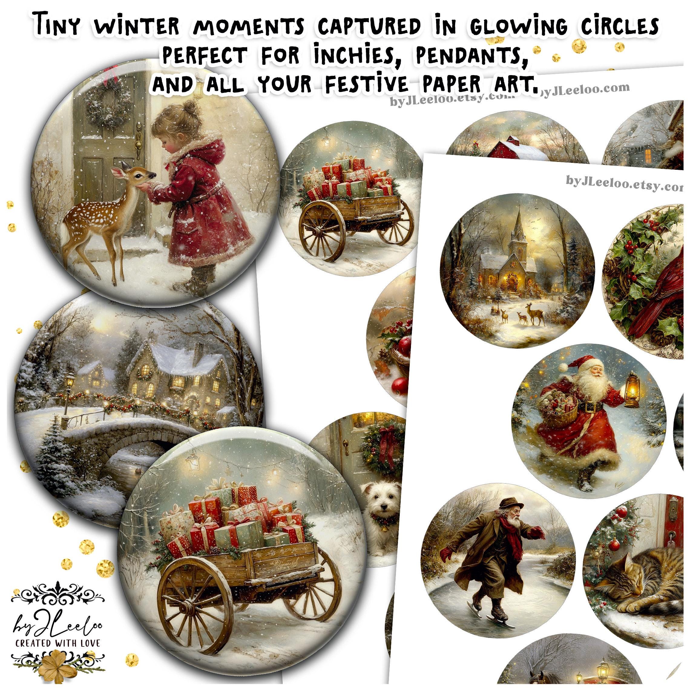 Snow Ornaments brings you a curated set of 2.5-inch round fine-art Christmas images — glowing cottages, snowy paths, Victorian children bundled in wool, gentle winter animals, and warm lantern-lit scenes that feel like tiny stories.