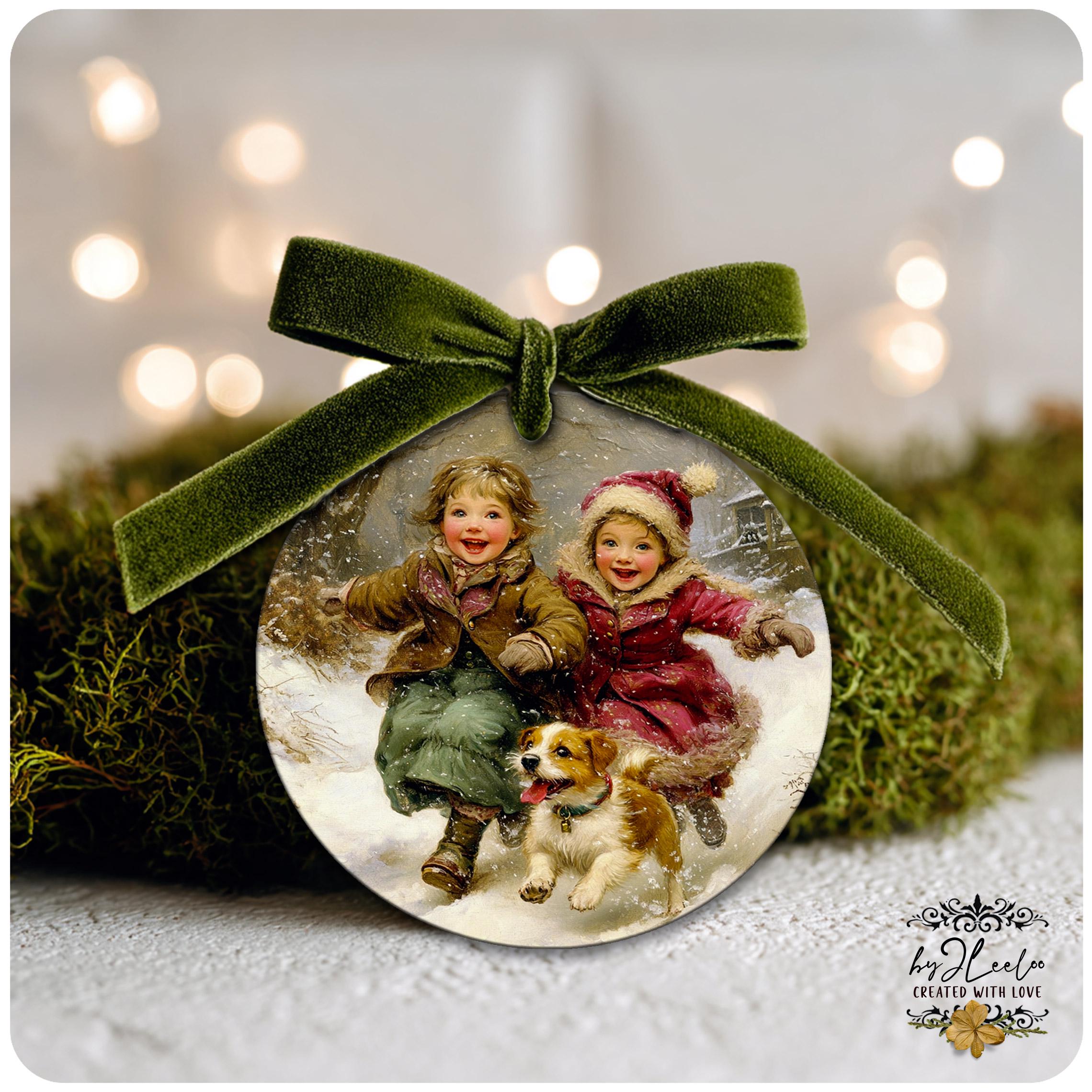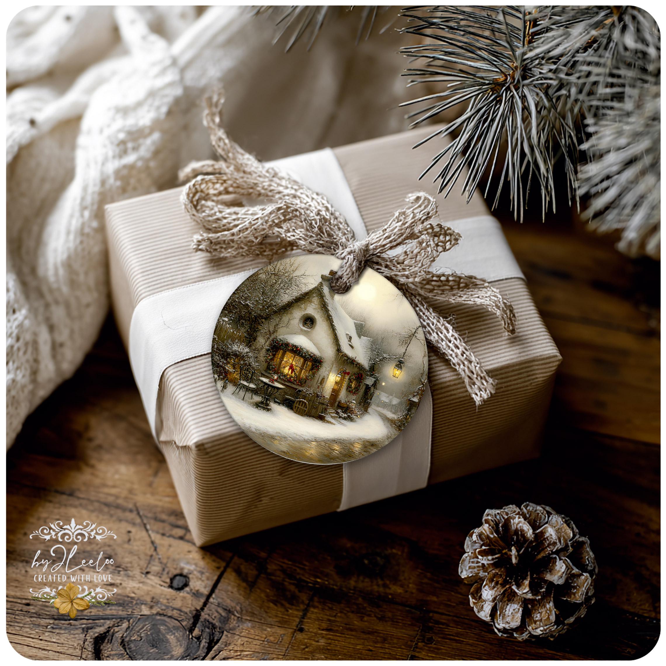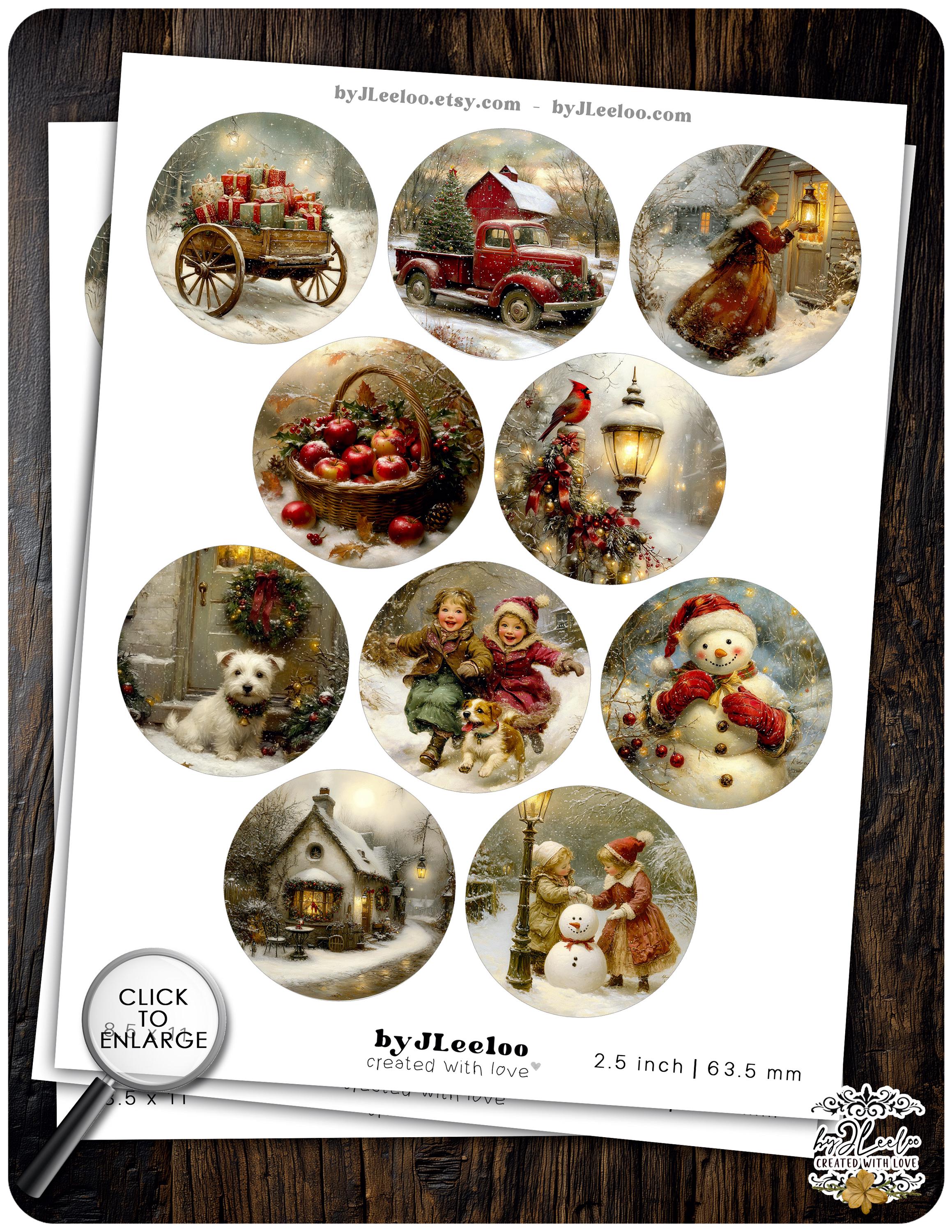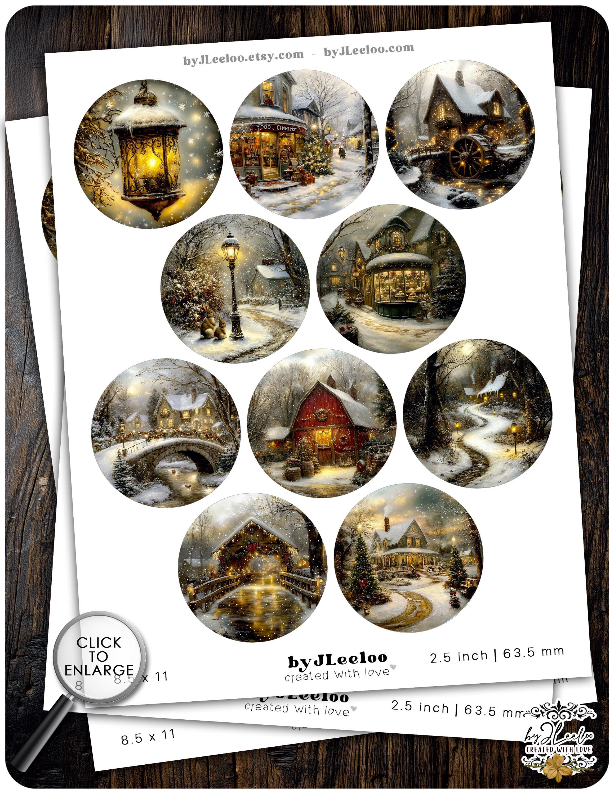 Snow Ornaments brings you a curated set of 2.5-inch round fine-art Christmas images — glowing cottages, snowy paths, Victorian children bundled in wool, gentle winter animals, and warm lantern-lit scenes that feel like tiny stories.