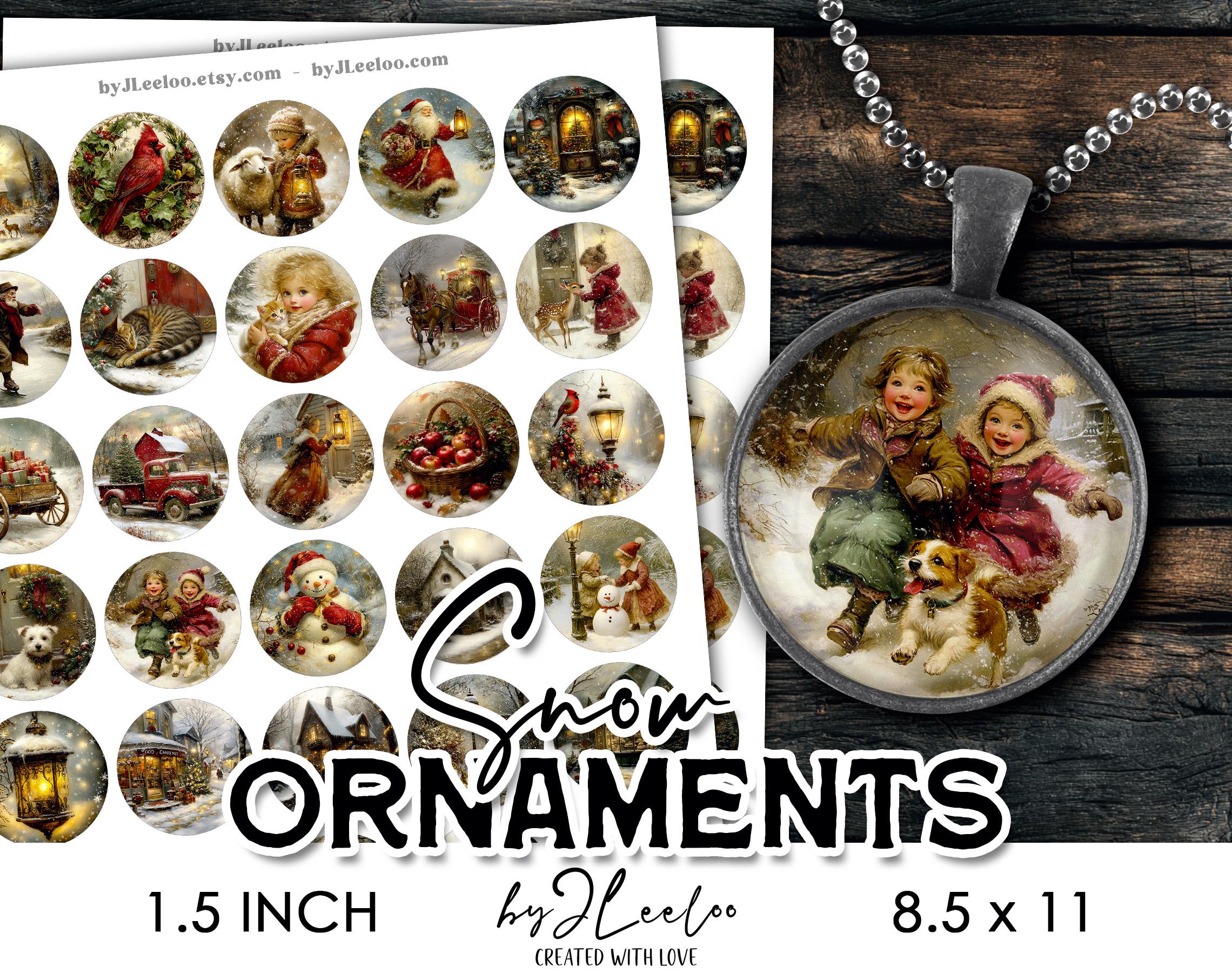 SNOW ORNAMENTS โ 1.5 Inch Christmas Round Fine Art Images for Jewelry, Pins, Crafts, Vintage Holiday Circles, Printable Ephemera | tn846