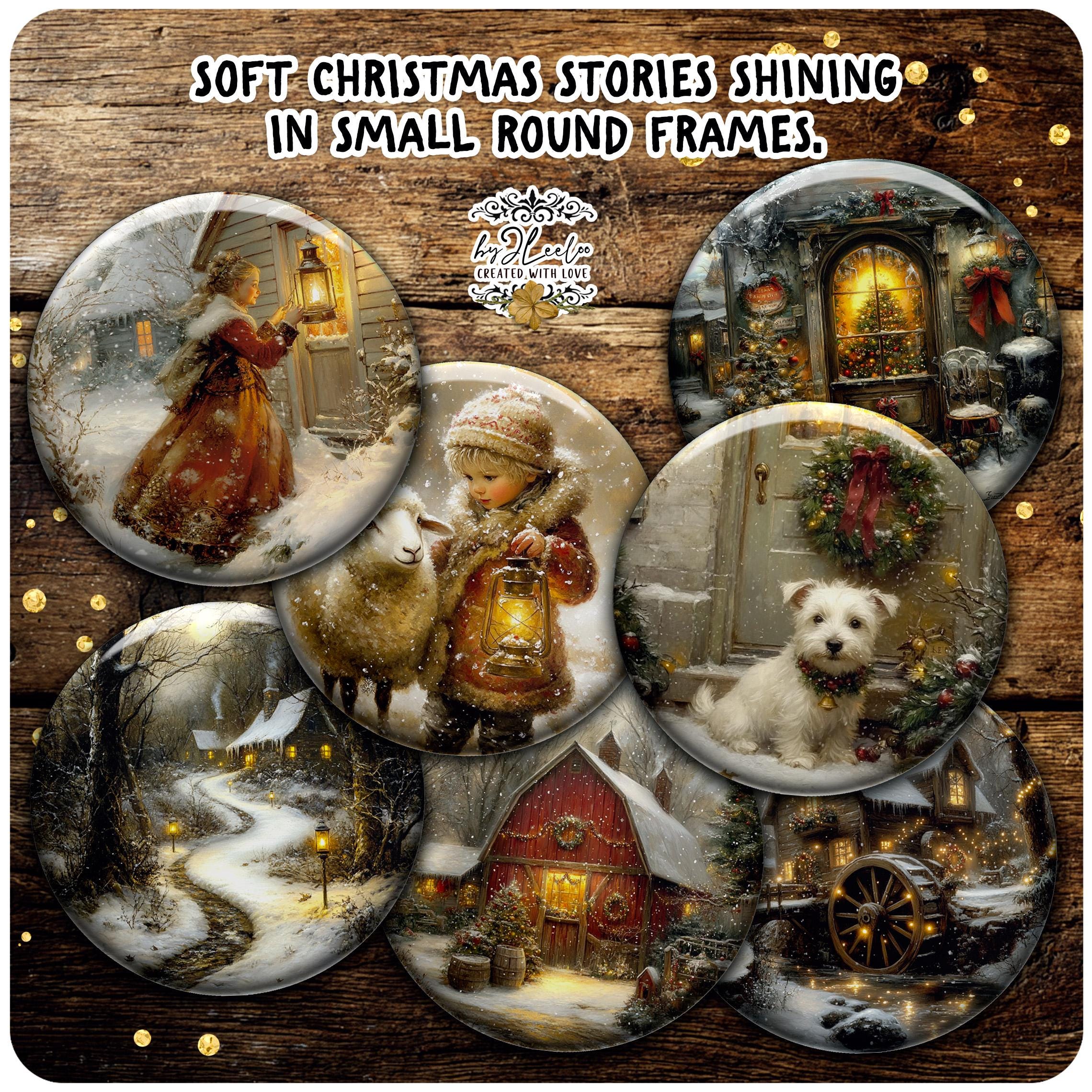 Snow Ornaments brings you a collection of 1.5-inch round fine-art Christmas images โ detailed snowy scenes, glowing cottages, gentle animals, Victorian children in wool coats, and those quiet little winter moments that feel like a story unfolding.
