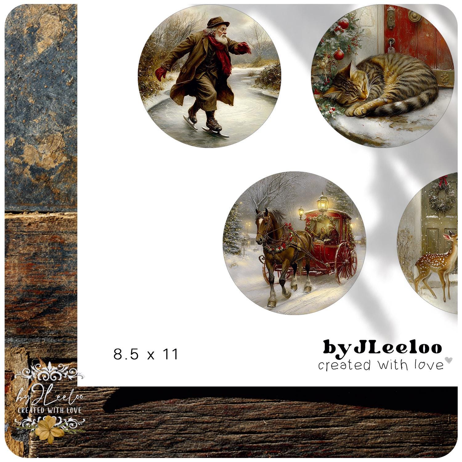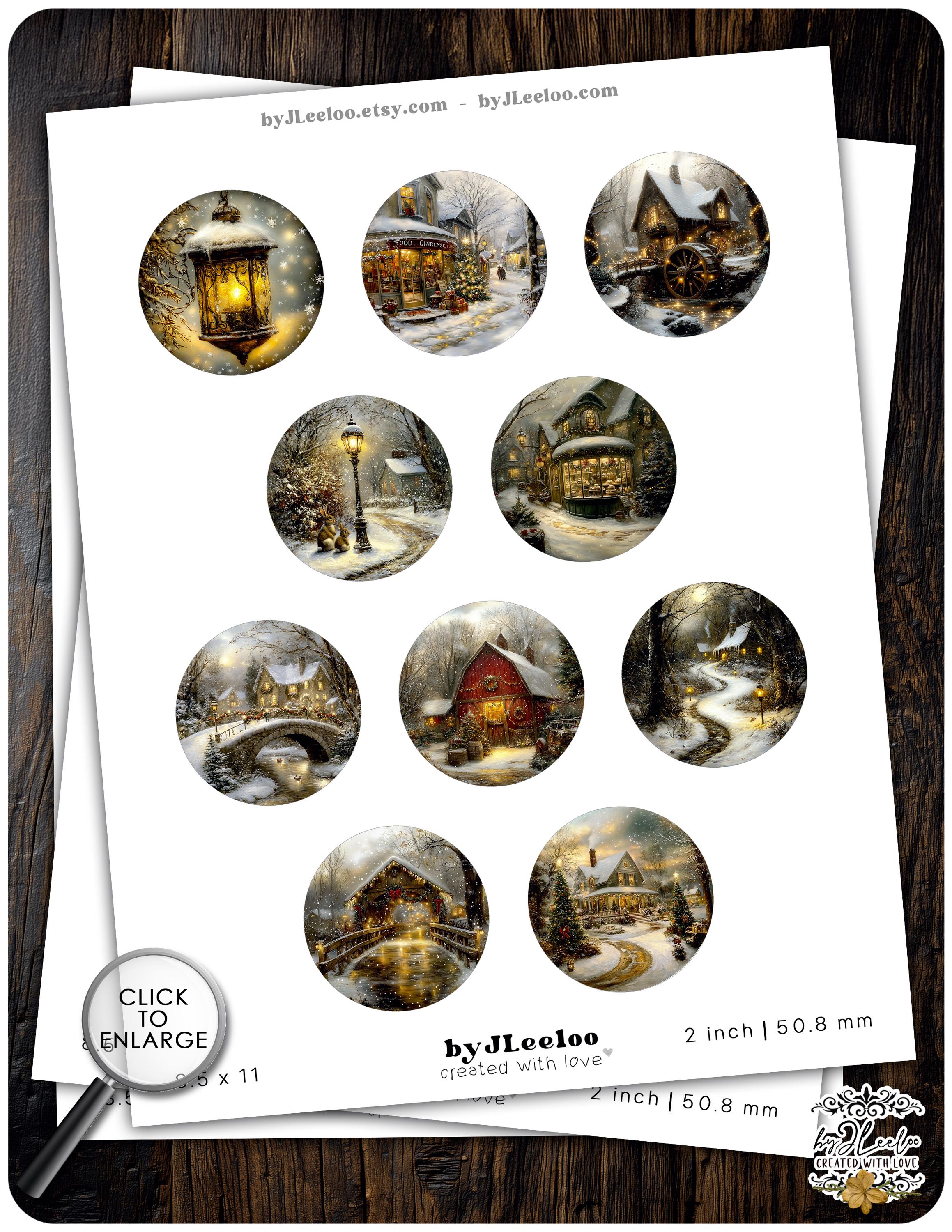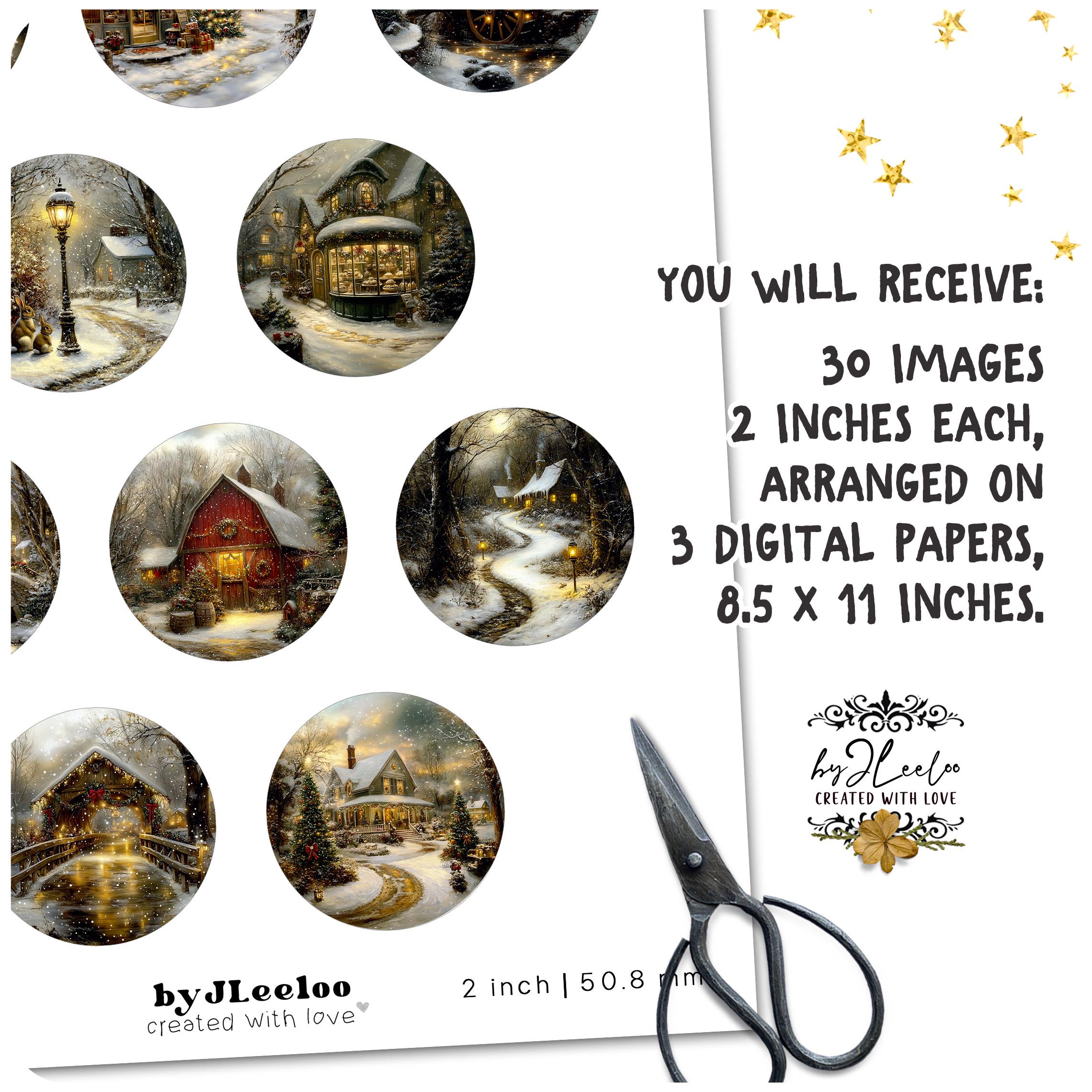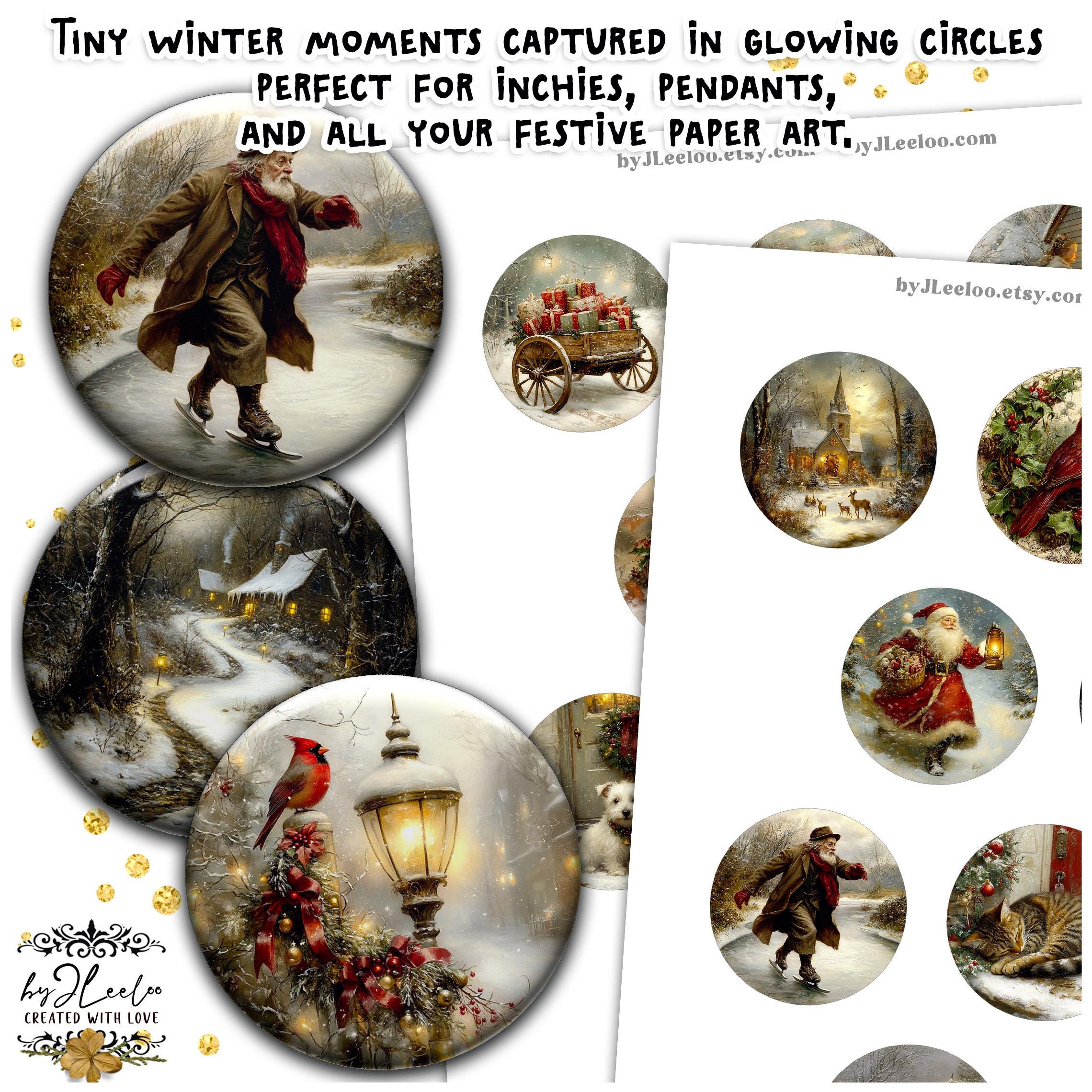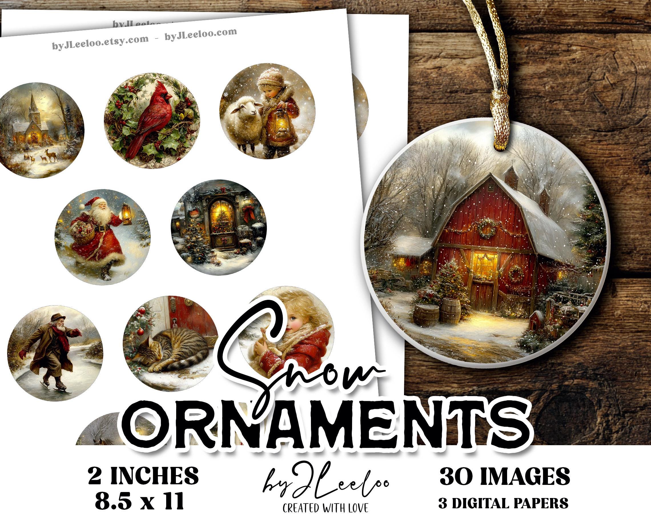 Snow Ornaments brings you a beautiful set of 2-inch round fine-art Christmas images — glowing cottages, snowy nights, Victorian children, gentle animals, warm lanterns, and all those small vintage moments that feel like a story you can hold.