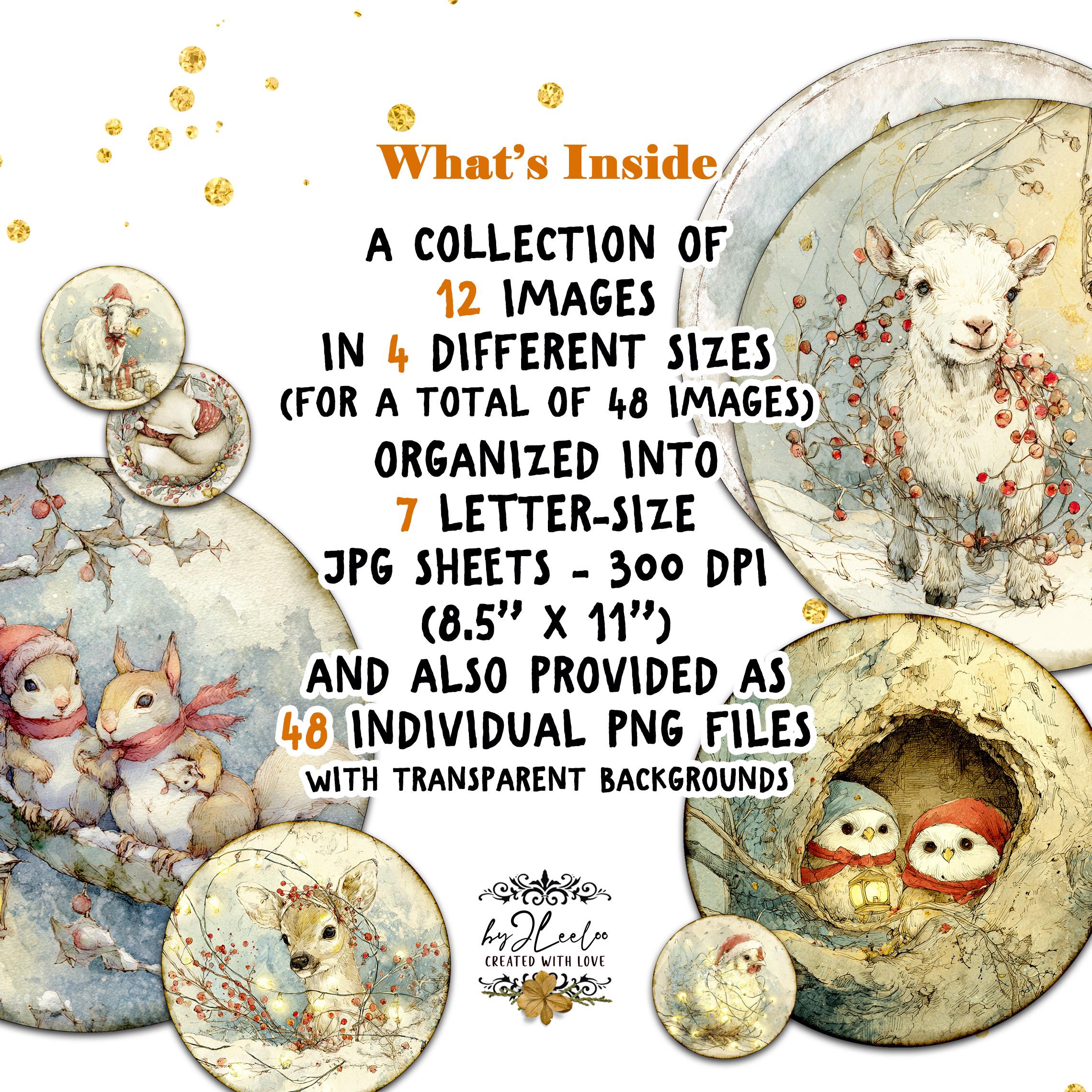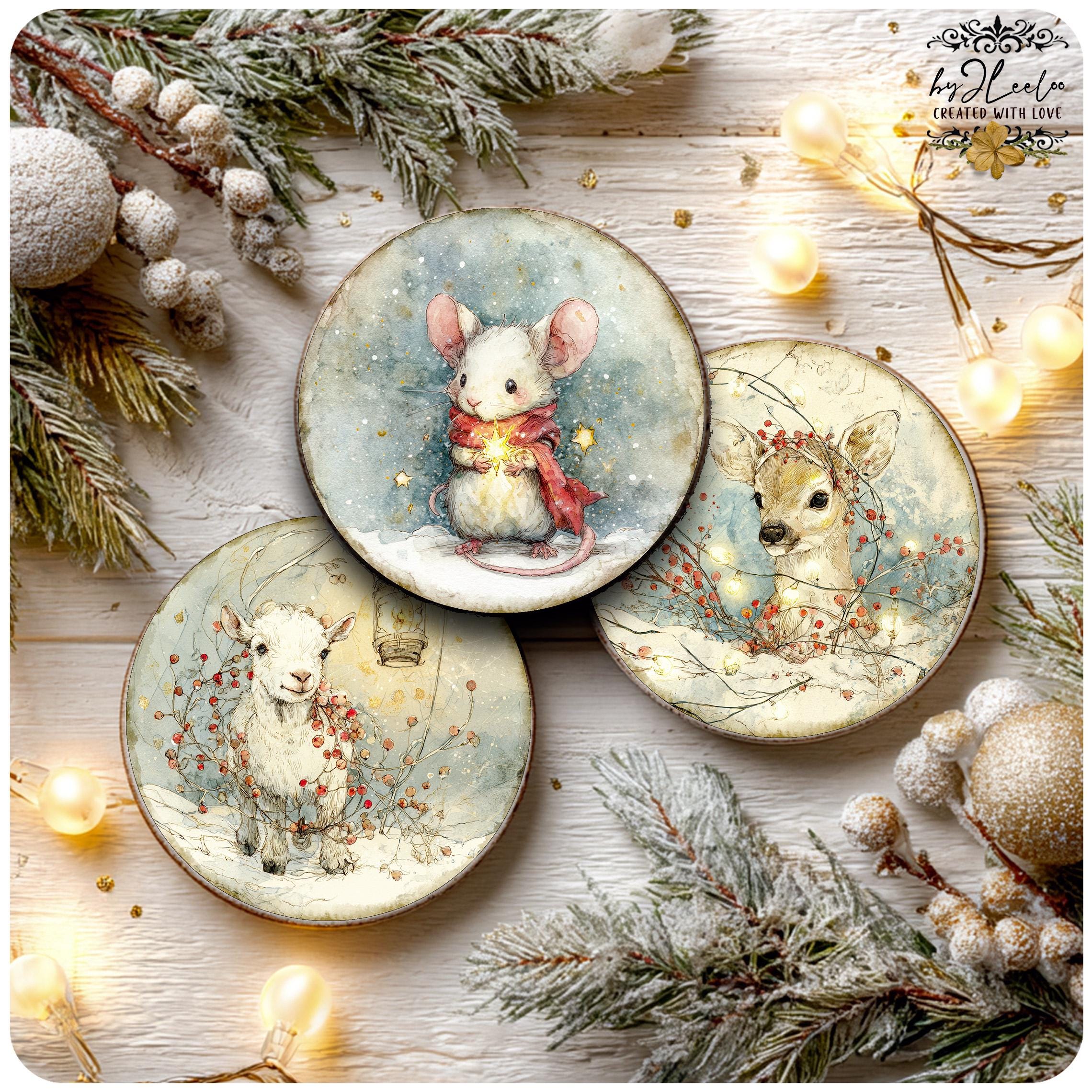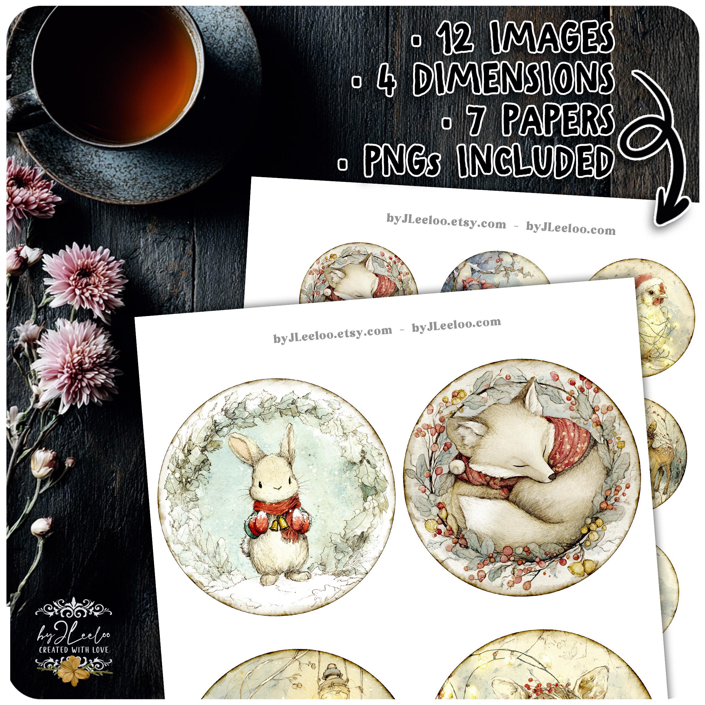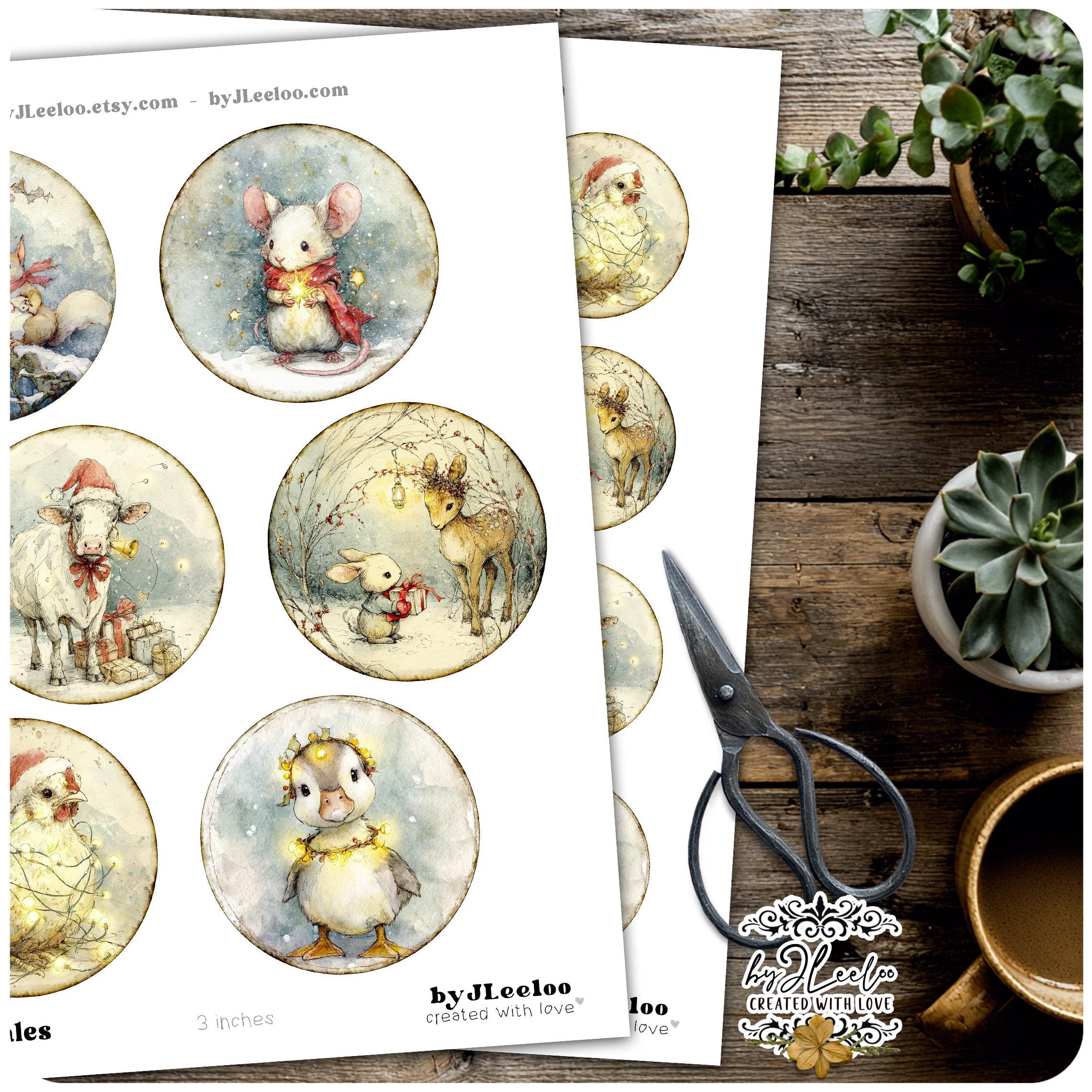 A dreamy collection of round illustrations featuring adorable Christmas woodland critters — perfect for junk journals, collage arts, cards, tags, ornaments, stickers, and cozy seasonal crafts. ✨