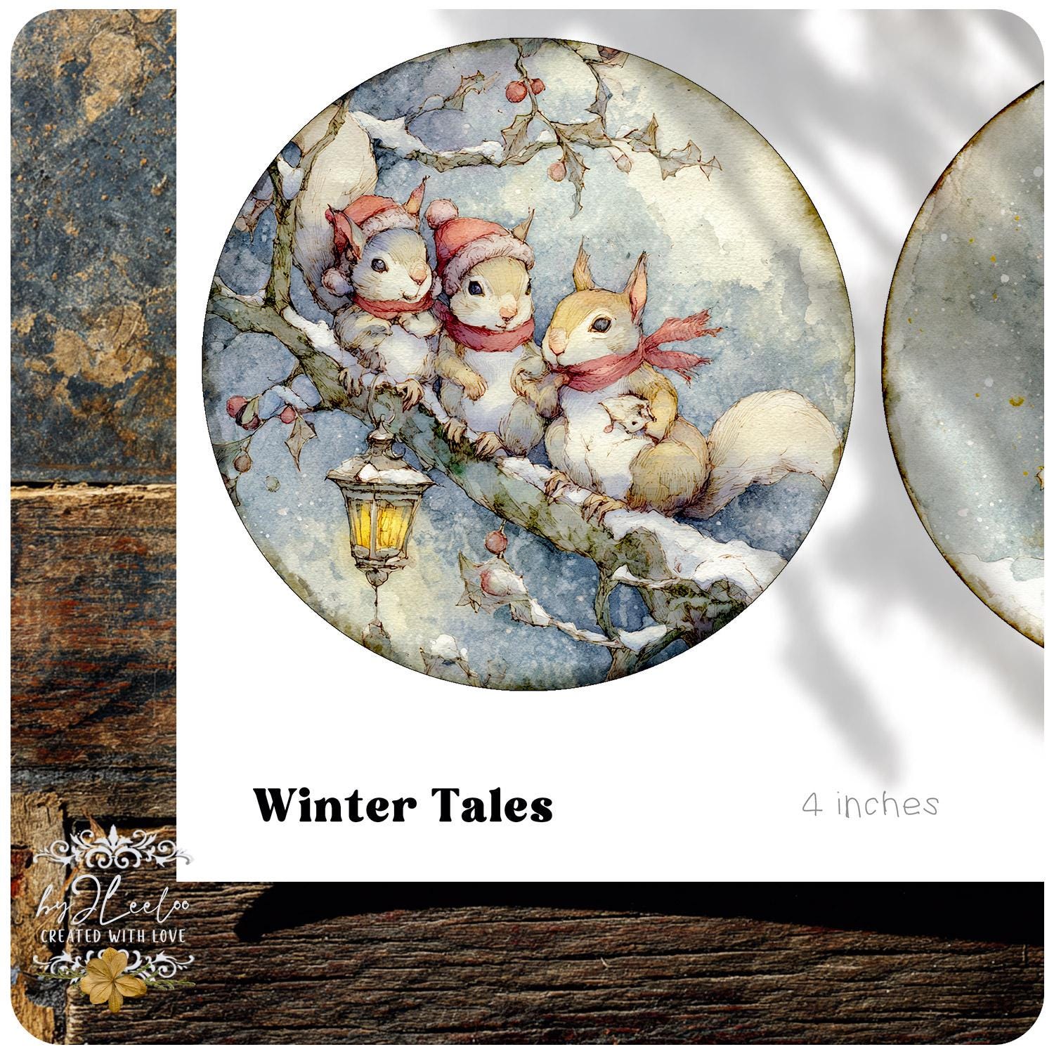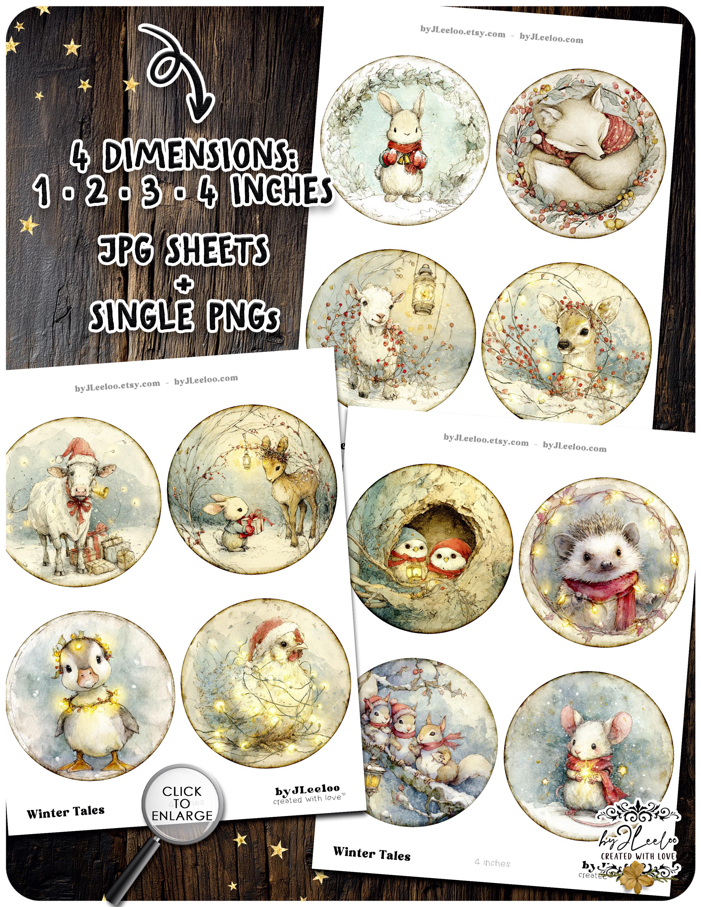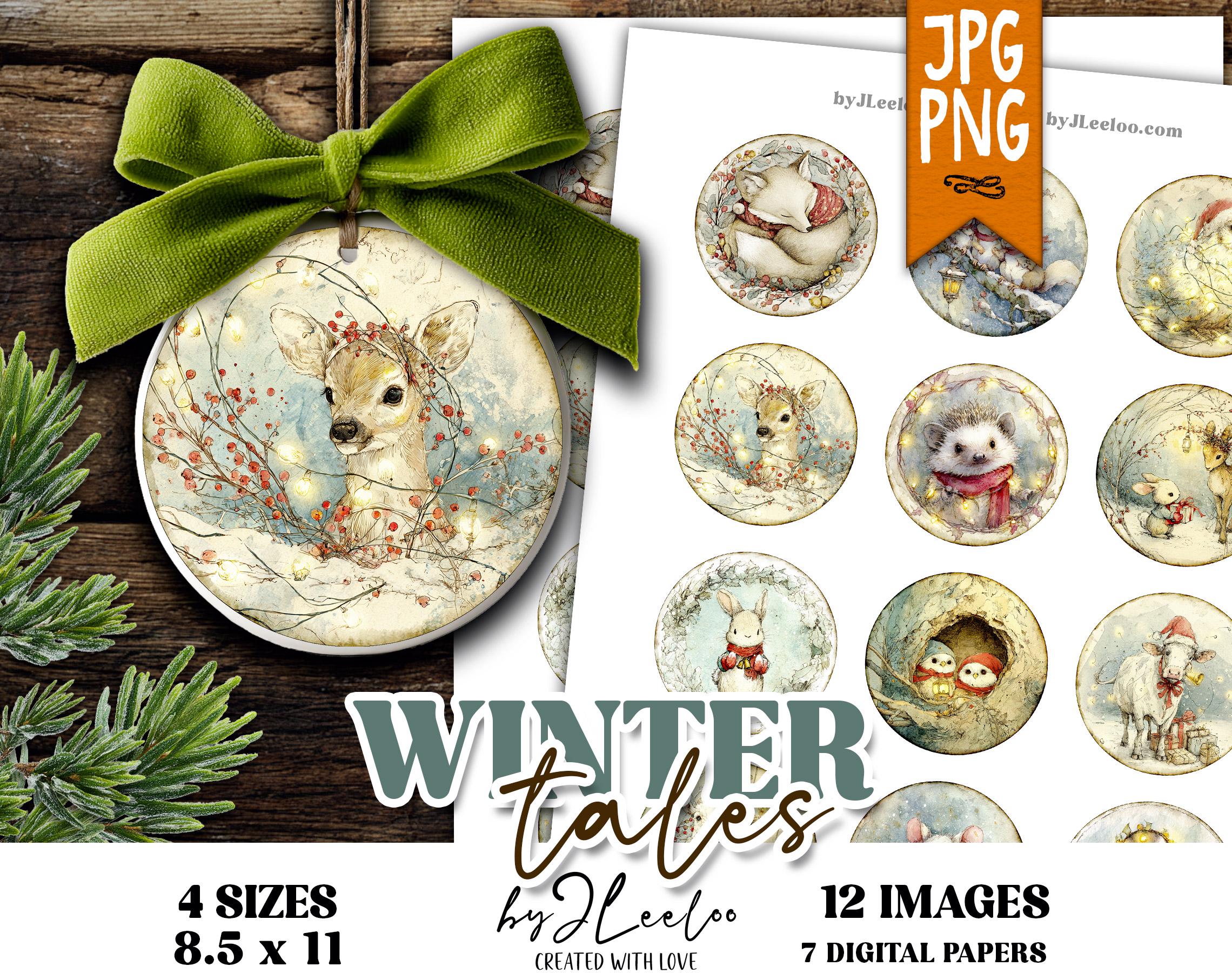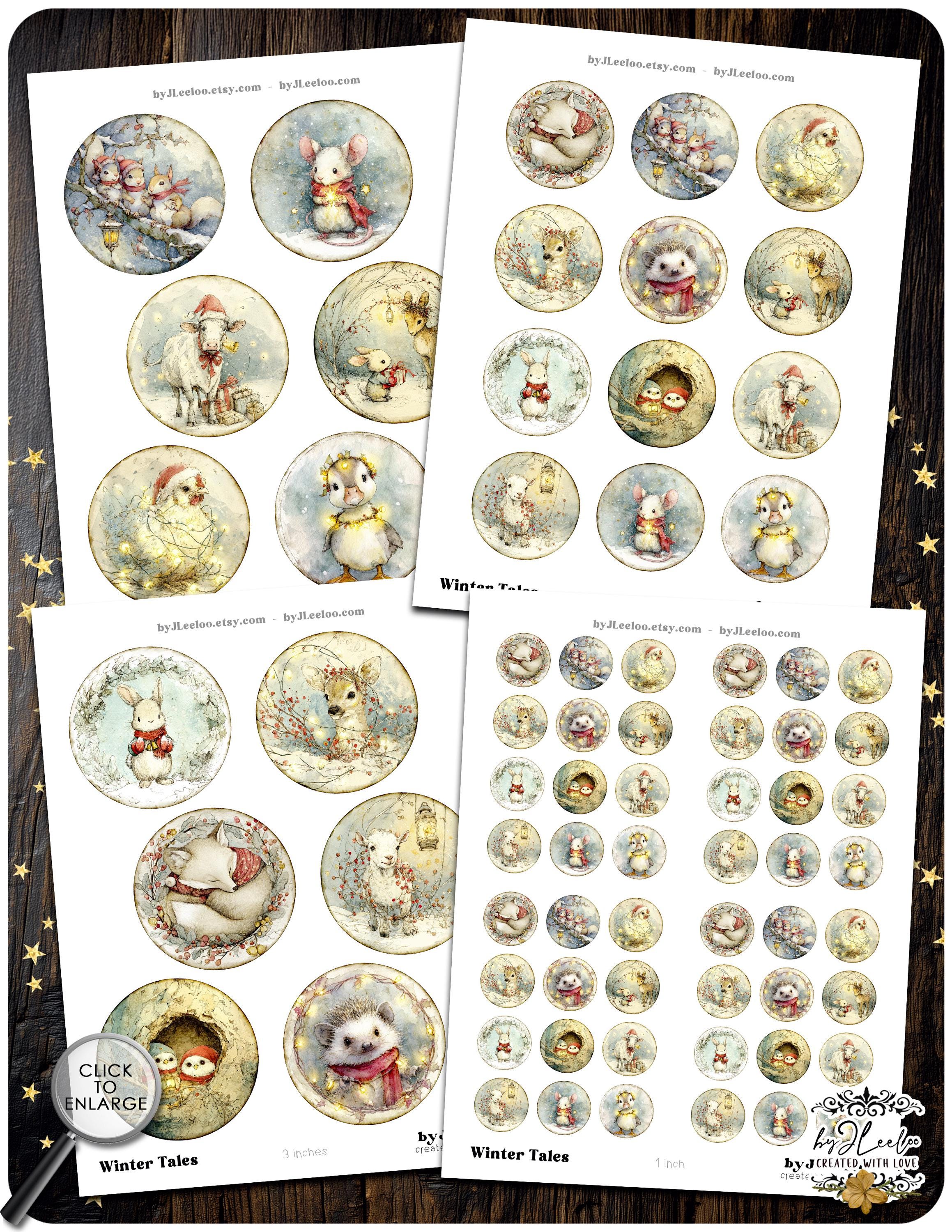 WINTER TALES – round Christmas storybook animals, holiday woodland critters illustrations for junk journal crafts and DIY – tn852