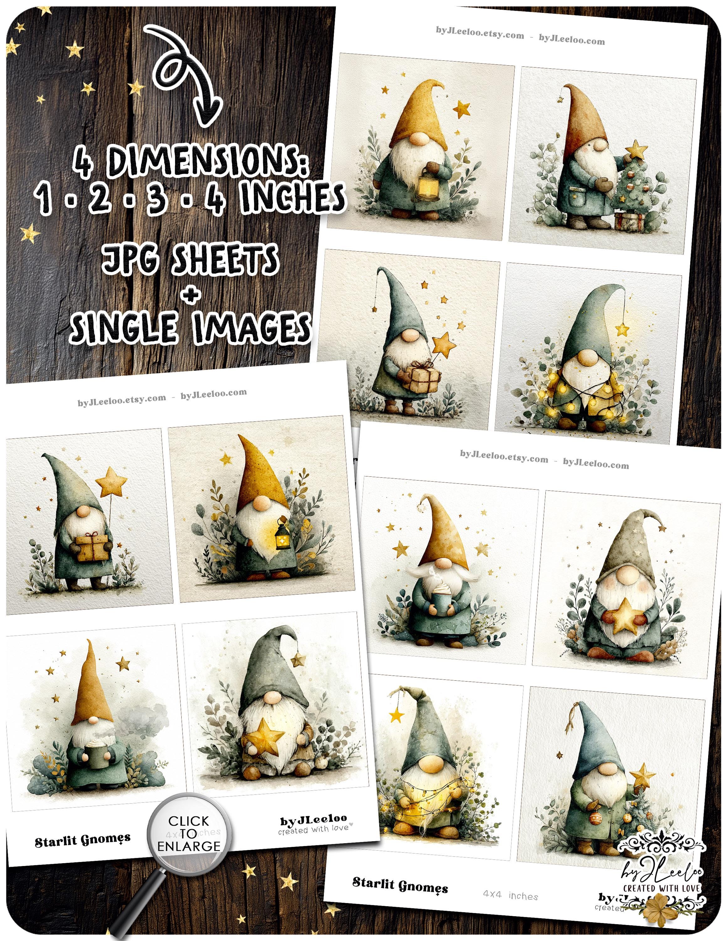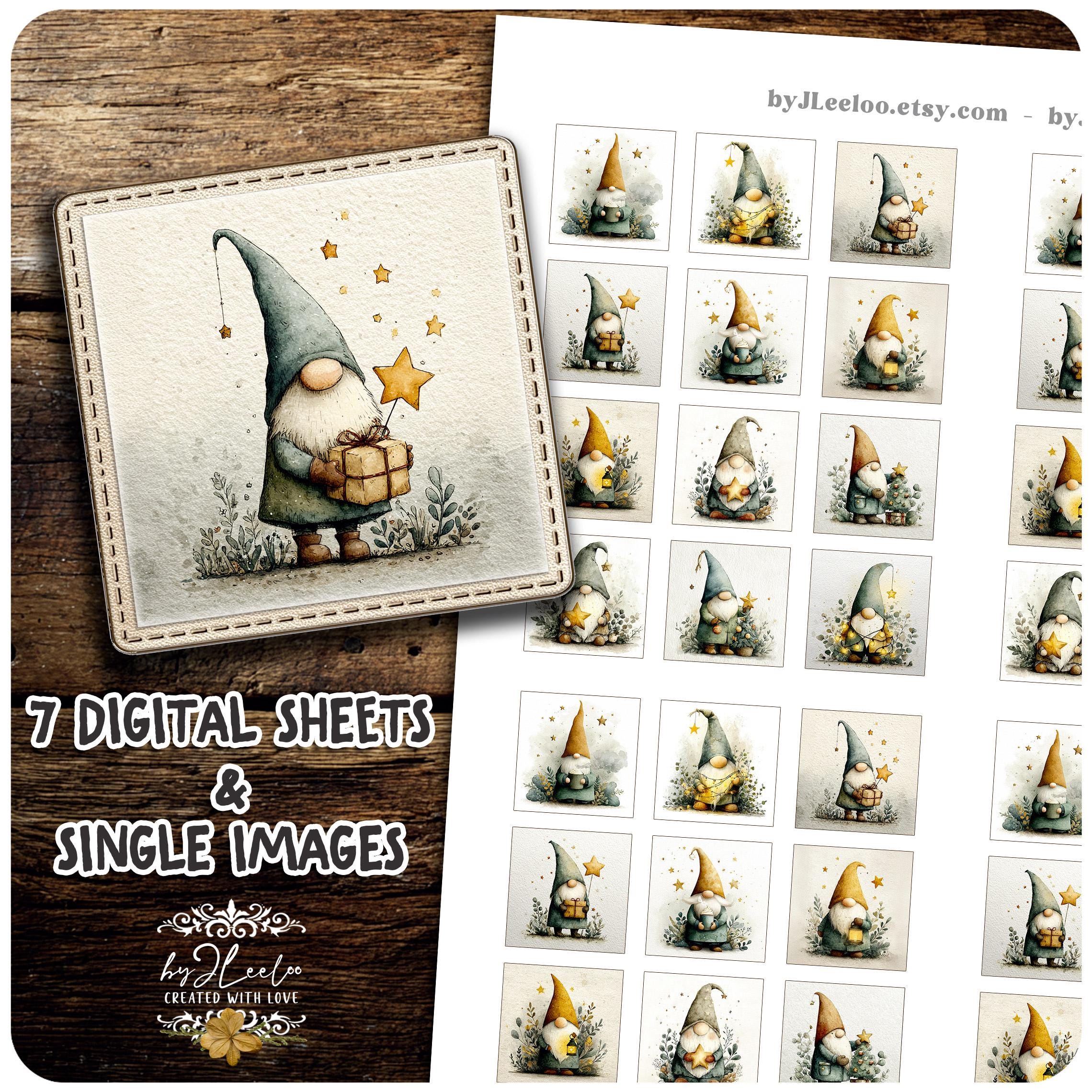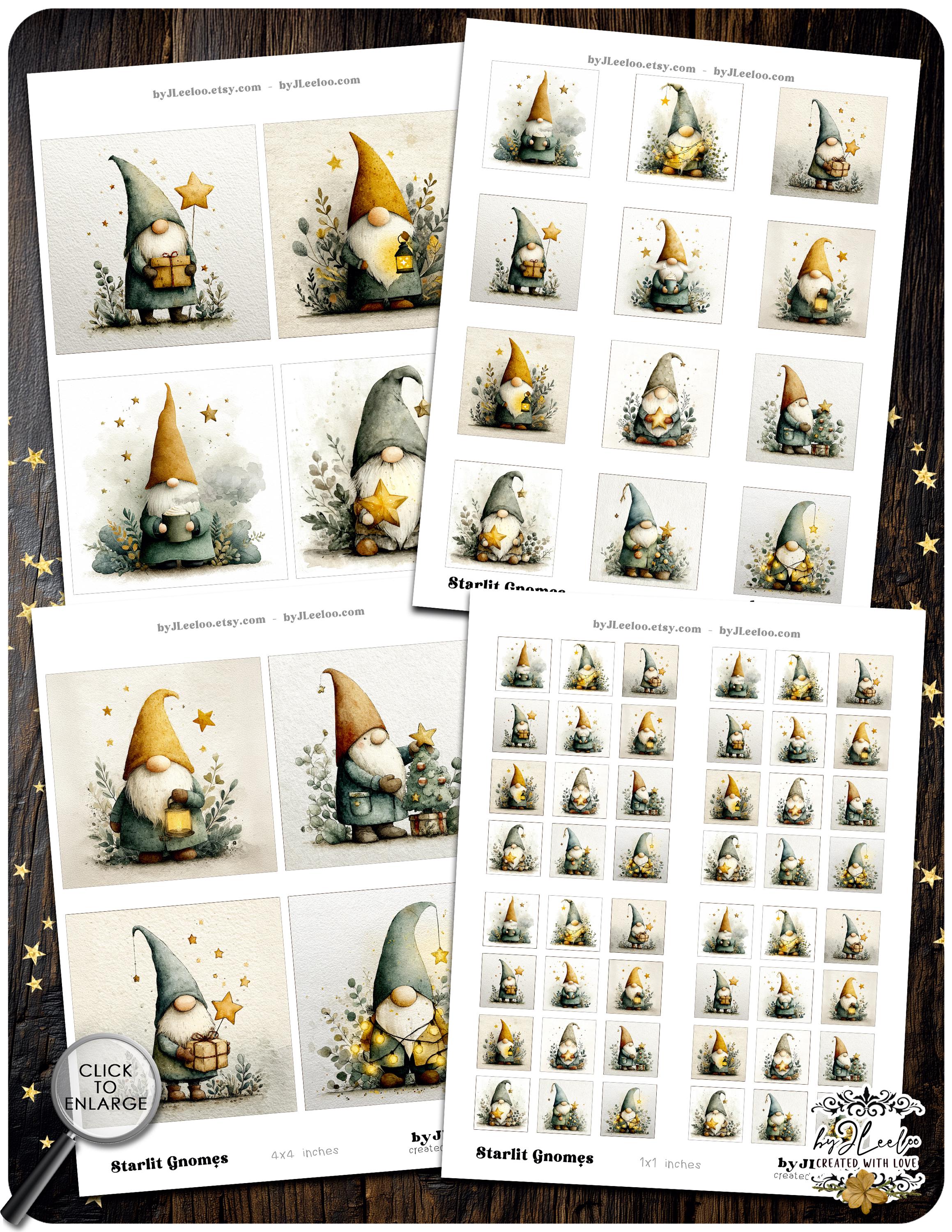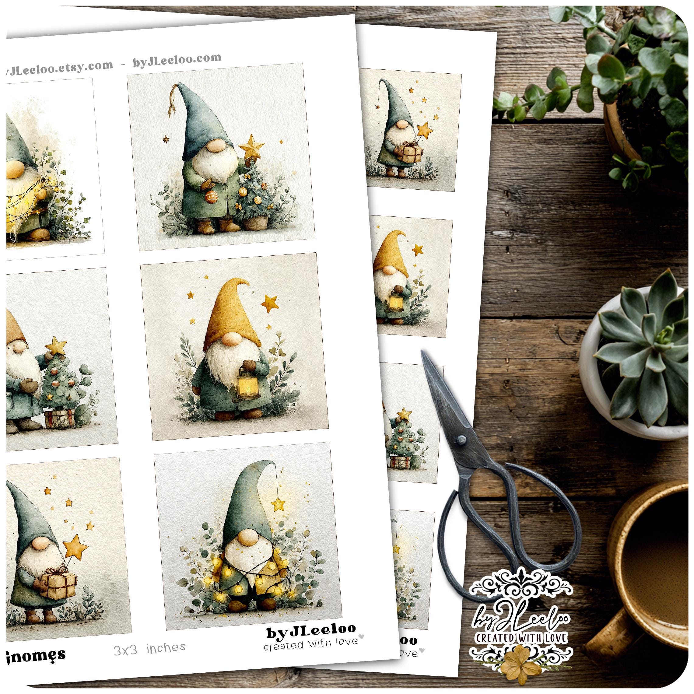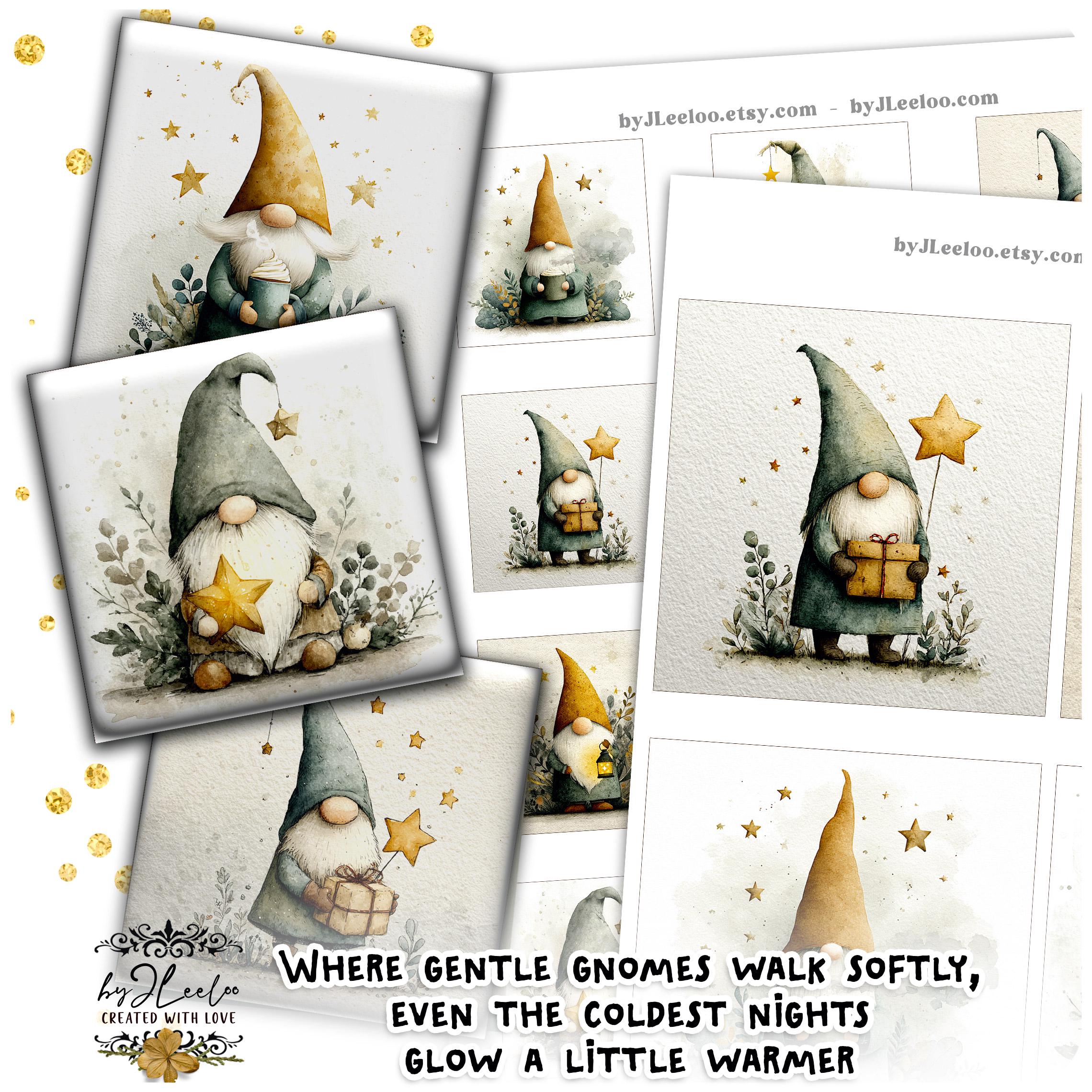 STARLIT GNOMES square watercolor christmas gnome art, 4 sizes for coasters jewelry crafts junk journals scrapbooking printables | qu637