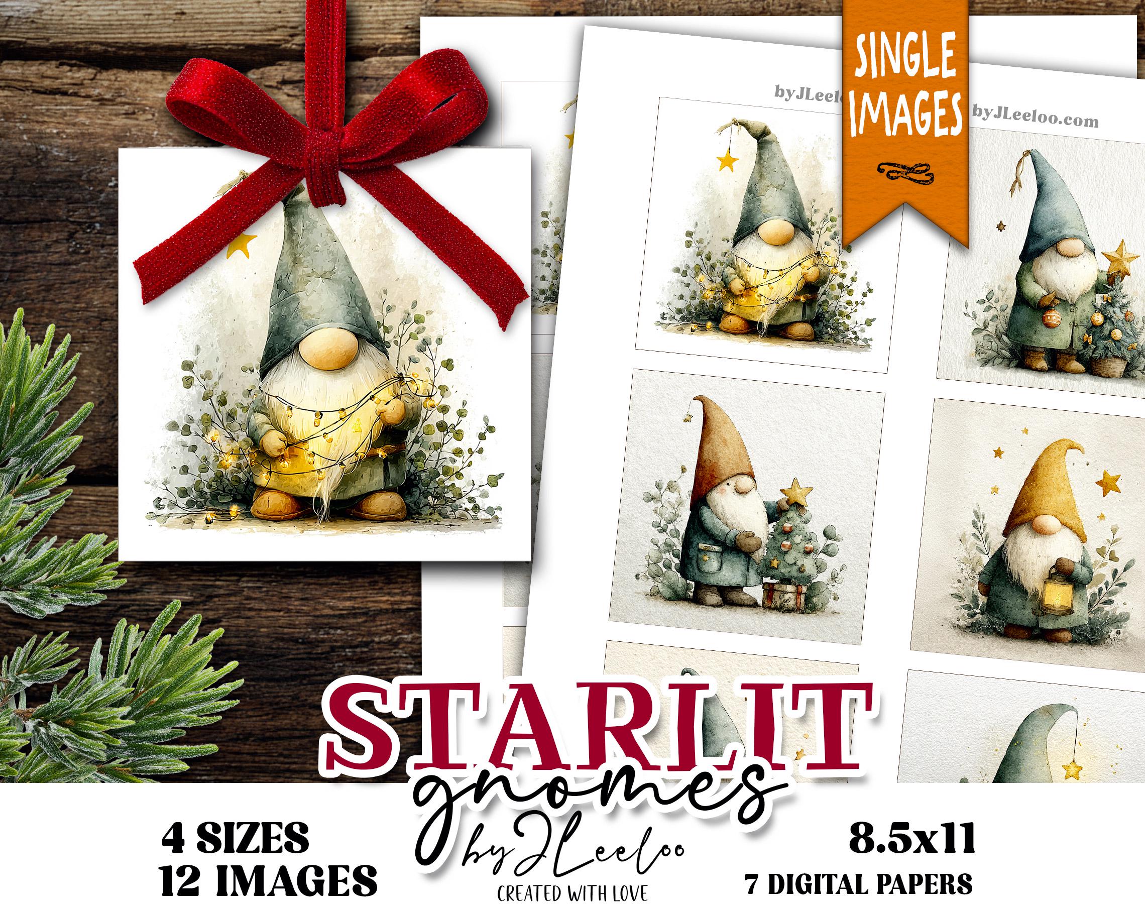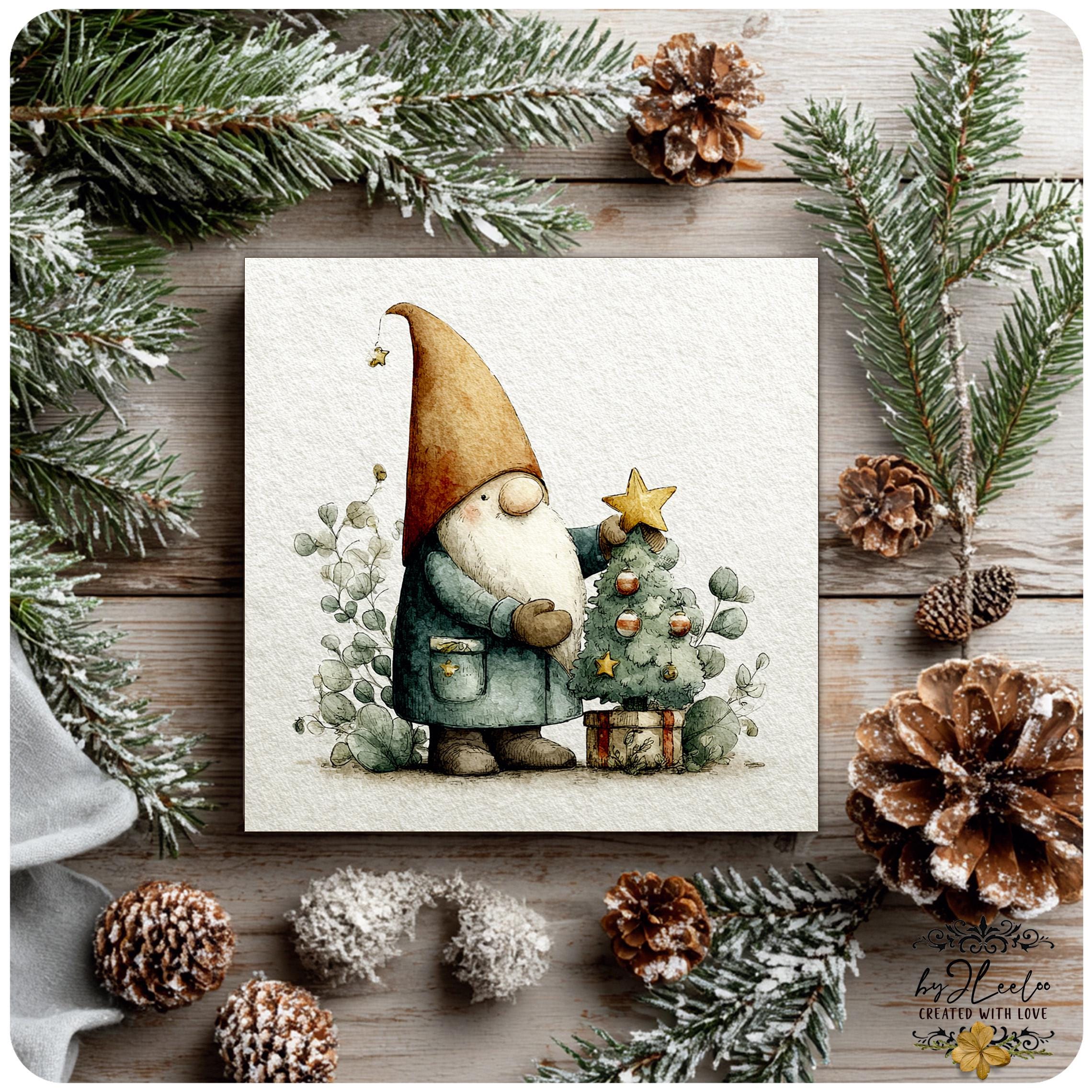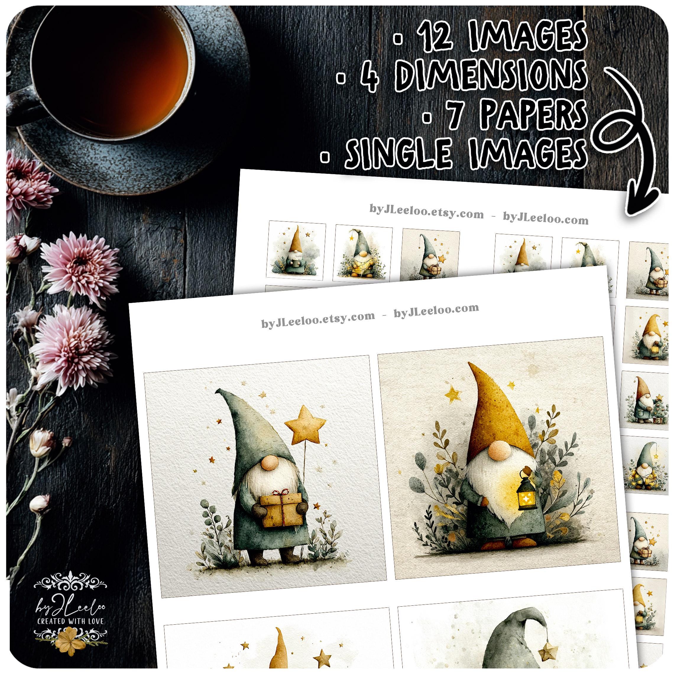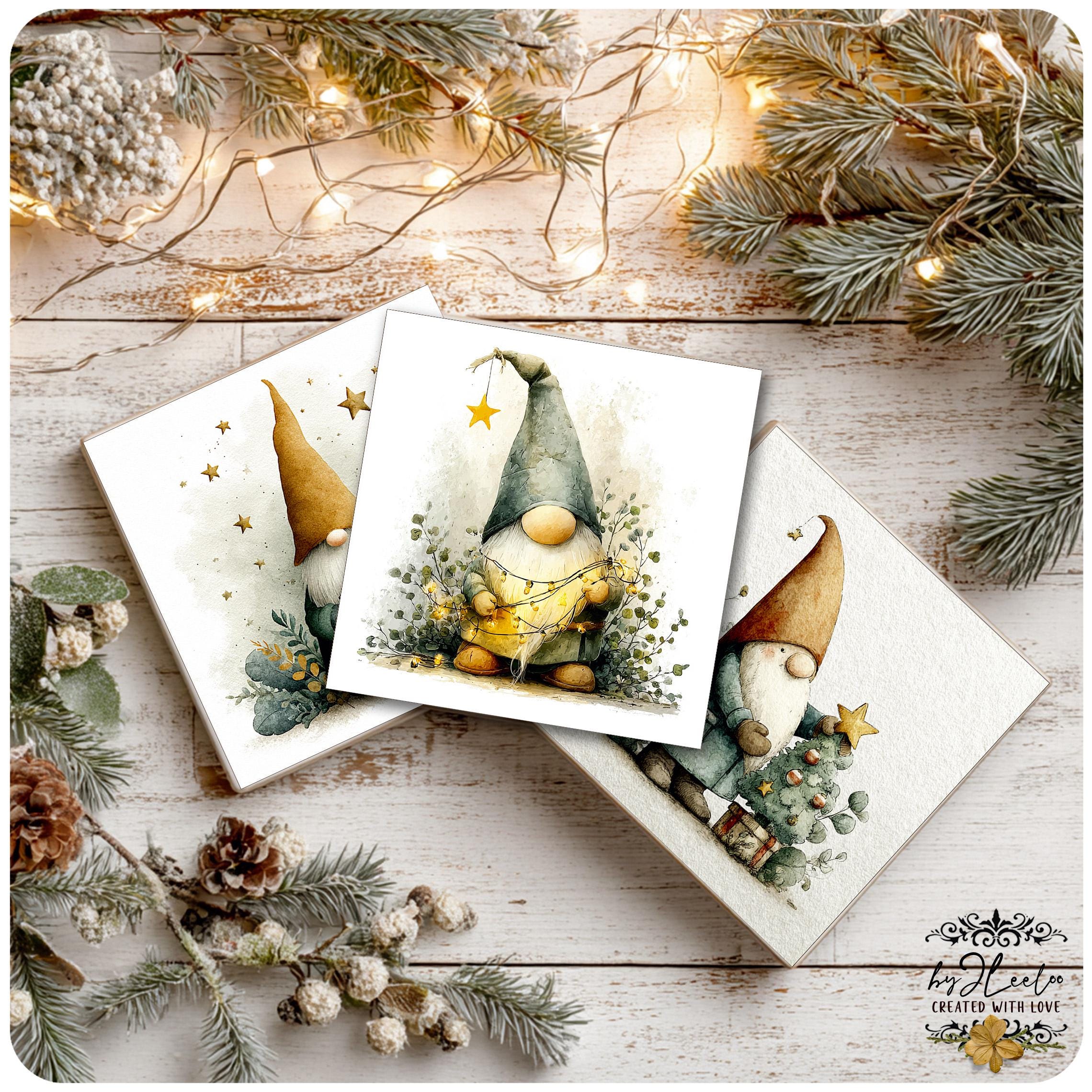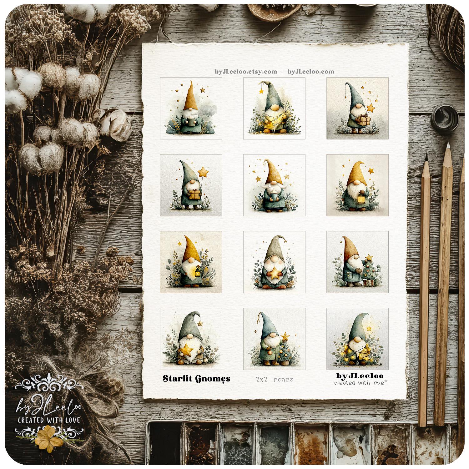 STARLIT GNOMES square watercolor christmas gnome art, 4 sizes for coasters jewelry crafts junk journals scrapbooking printables | qu637