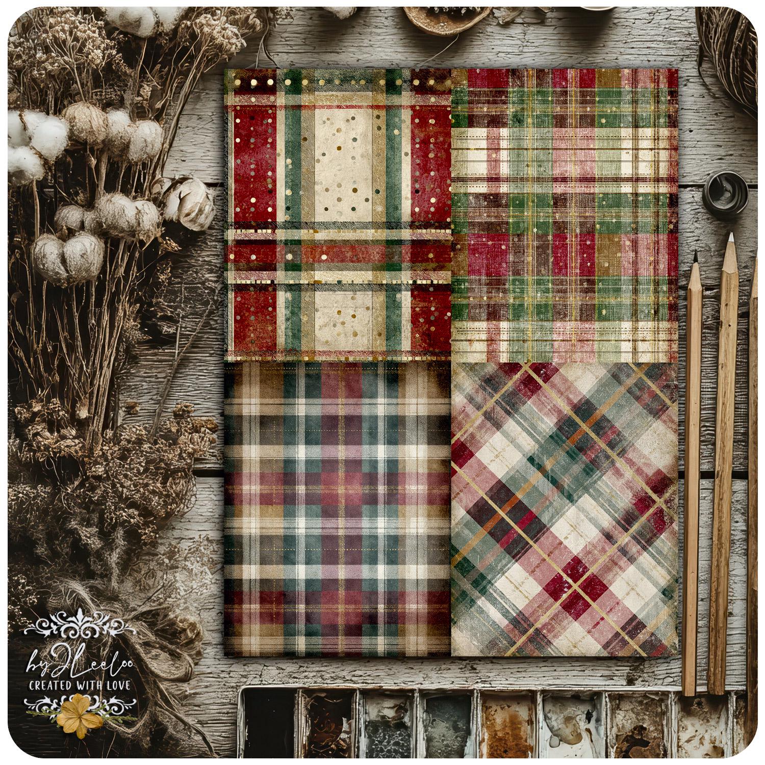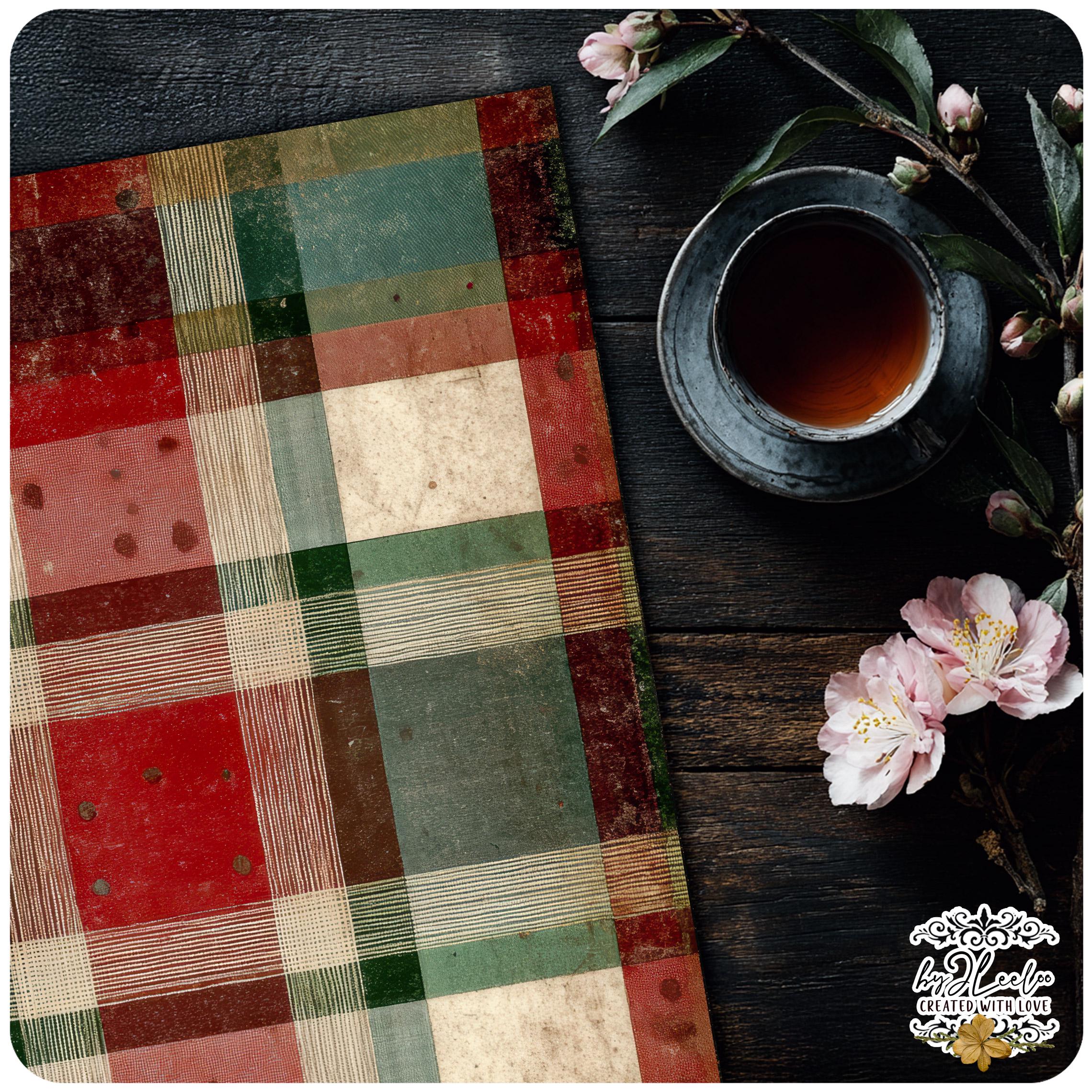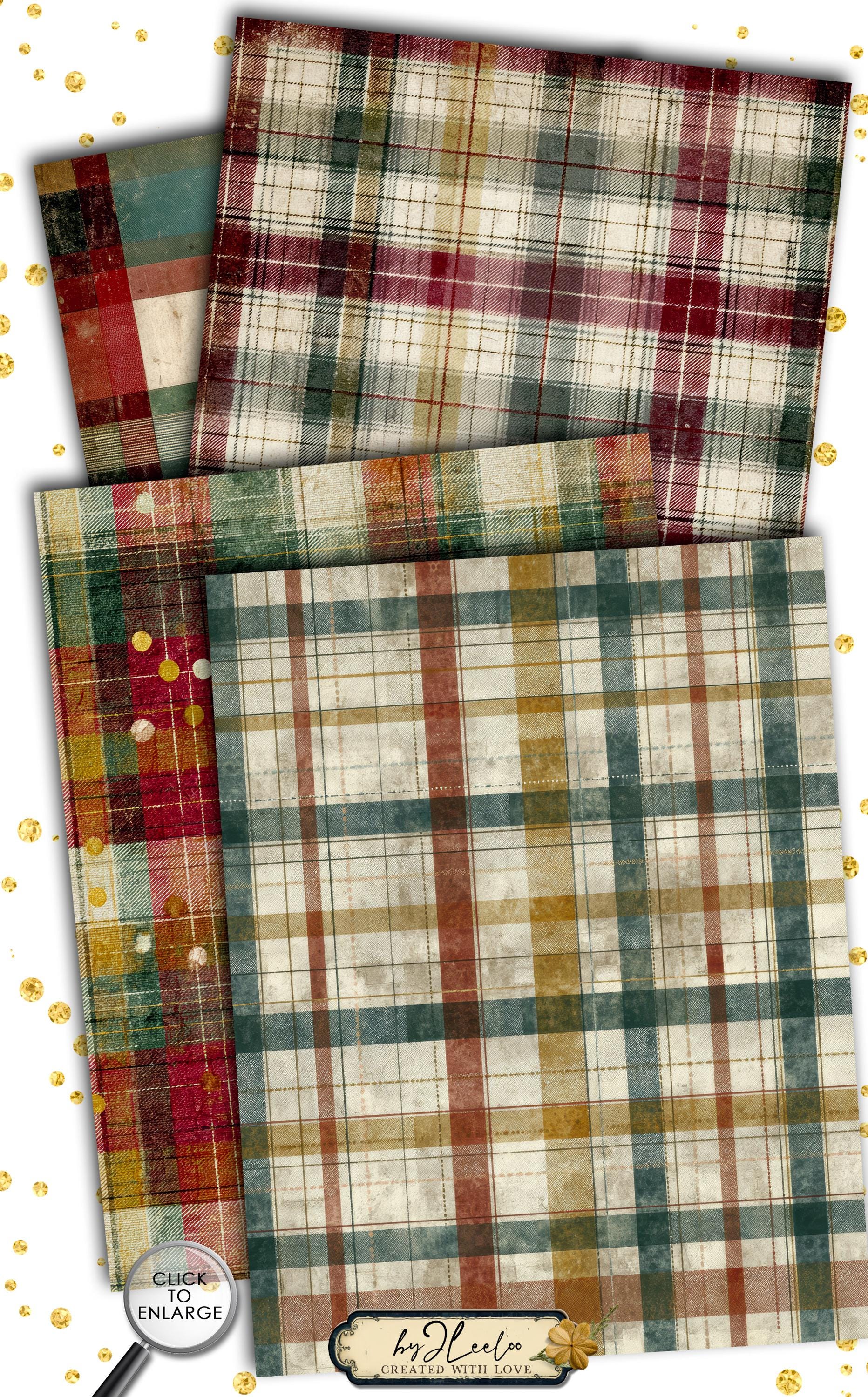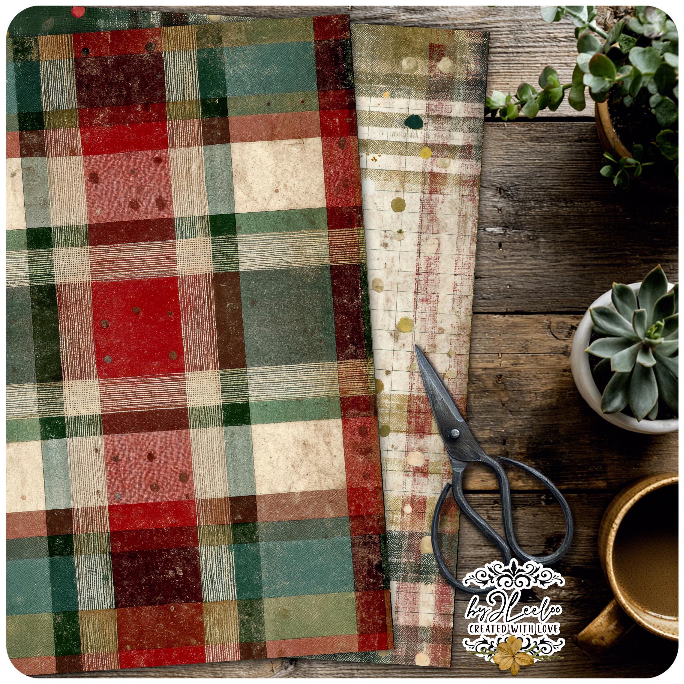These distressed plaid backgrounds are designed for junk journal lovers who appreciate warmth, imperfection and vintage character. The look is soft, archival and lived-in — perfect for creating pages that feel nostalgic, comforting and timeless rather than loud or overly decorative.