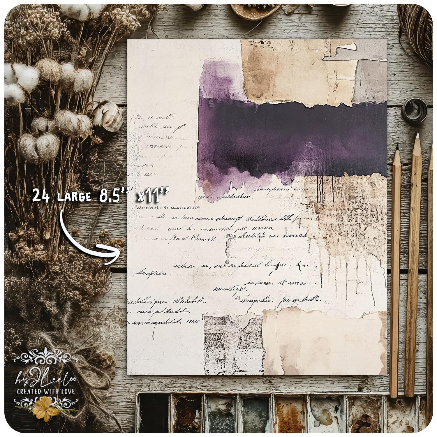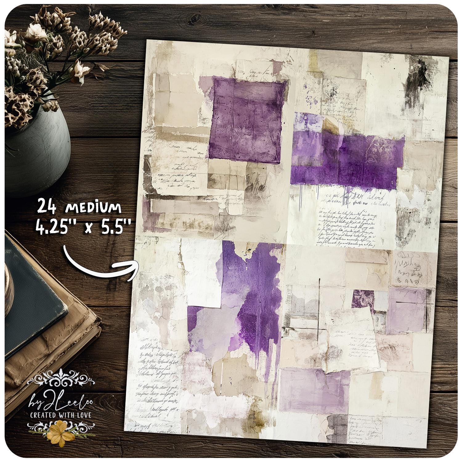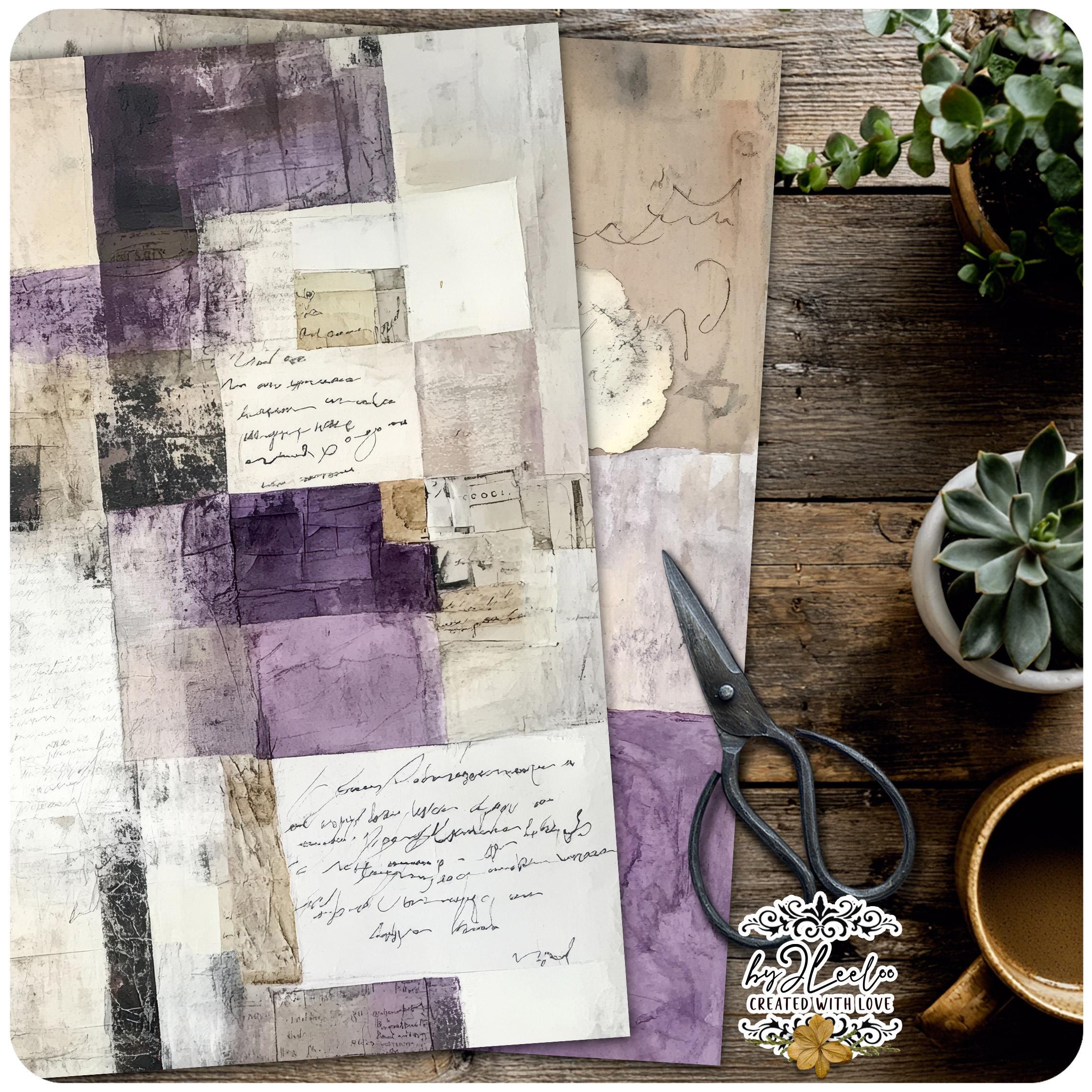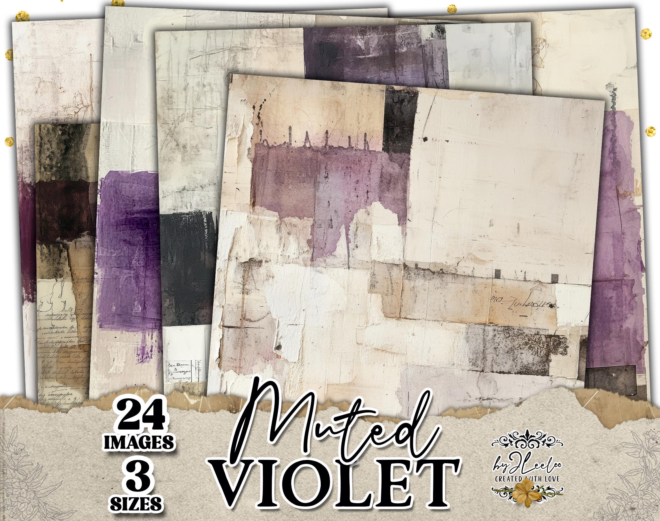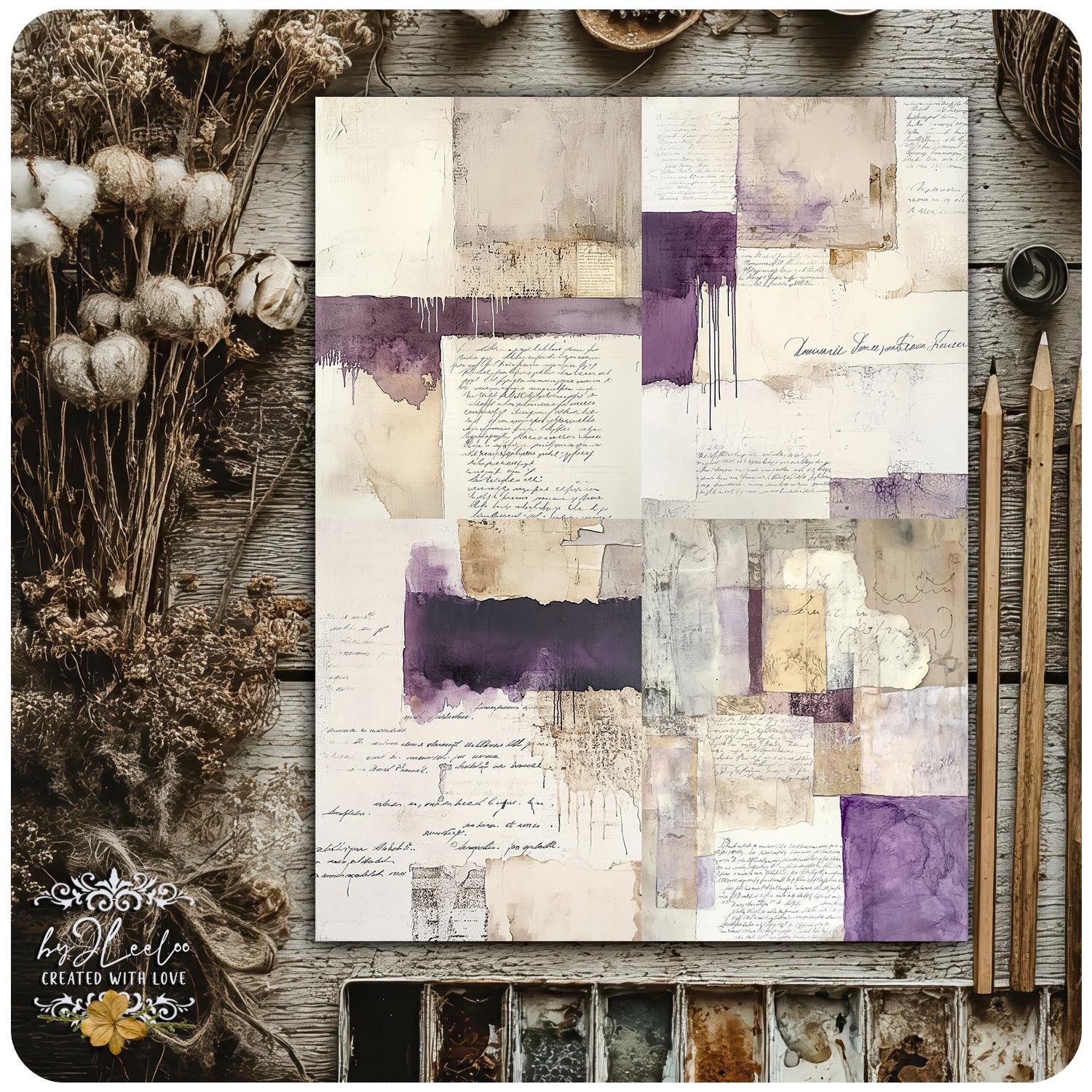 MUTED VIOLET is a collection of abstract vintage-style collage papers where softened violet tones meet aged paper, faded ink, and quiet handwritten fragments.