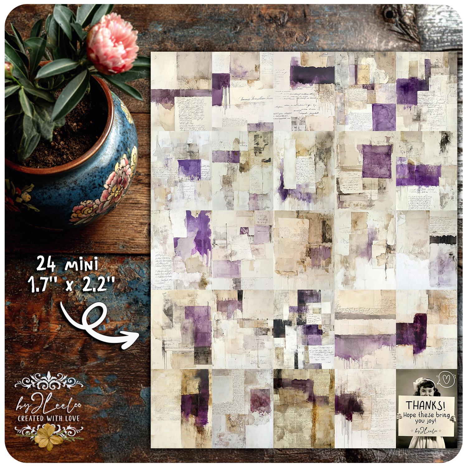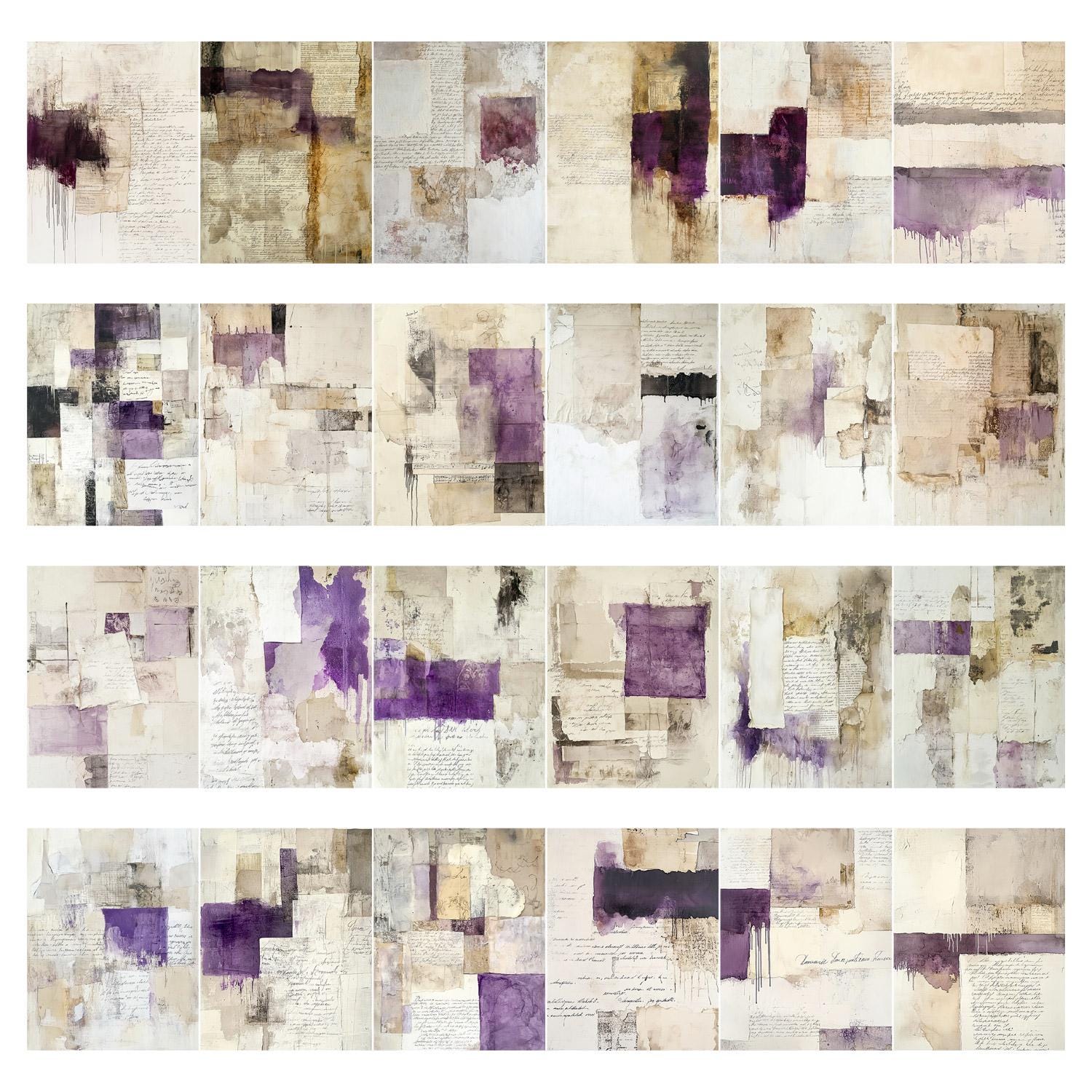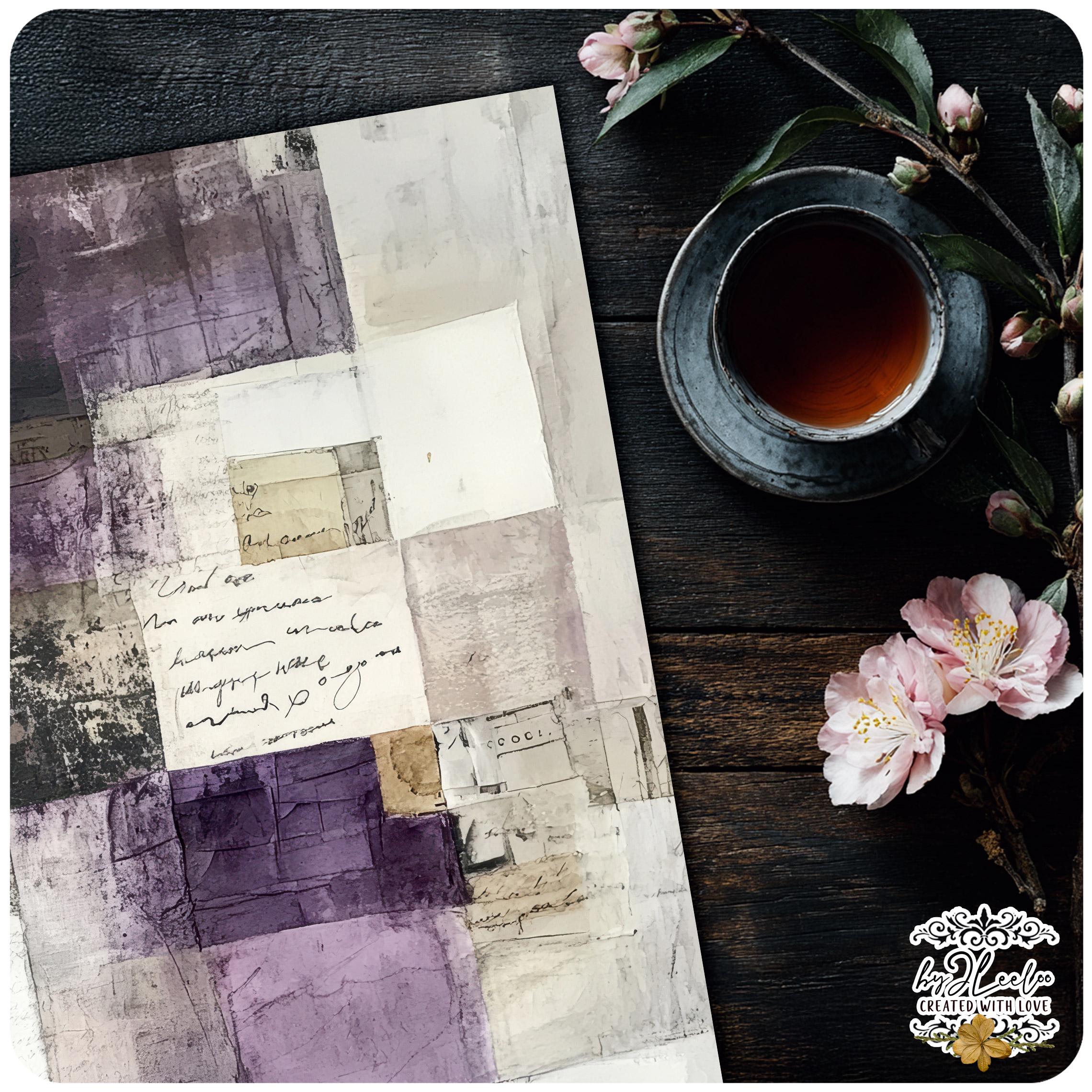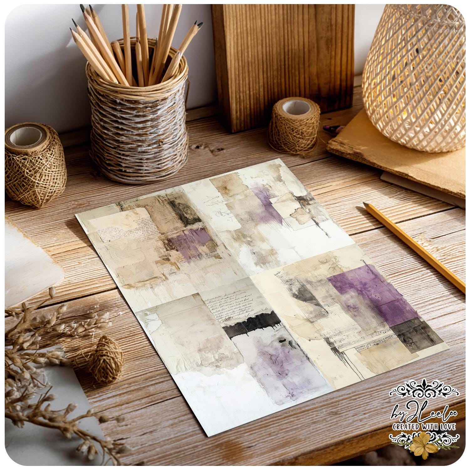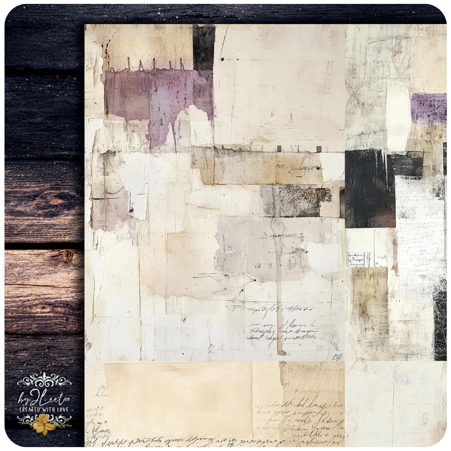 MUTED VIOLET is a collection of abstract vintage-style collage papers where softened violet tones meet aged paper, faded ink, and quiet handwritten fragments.