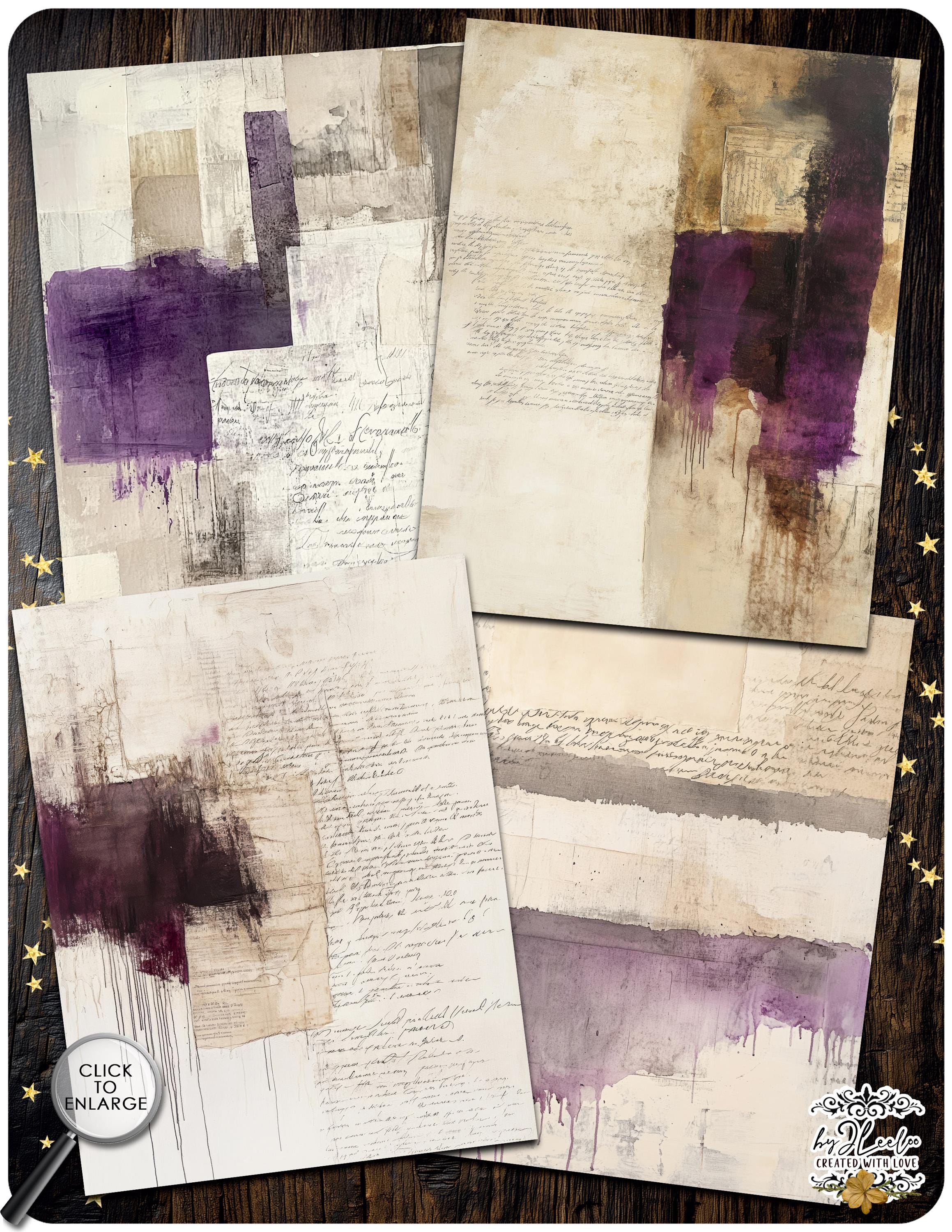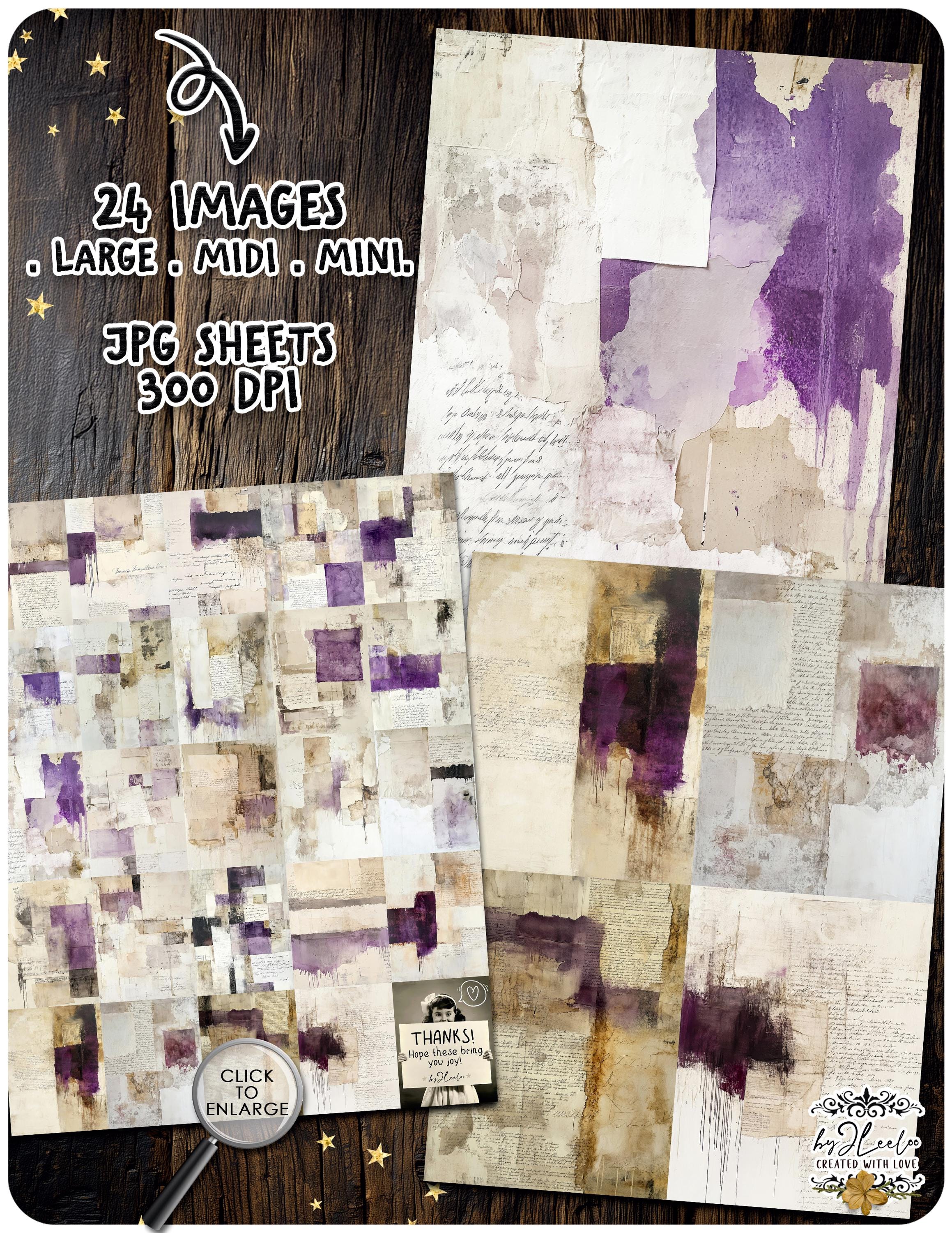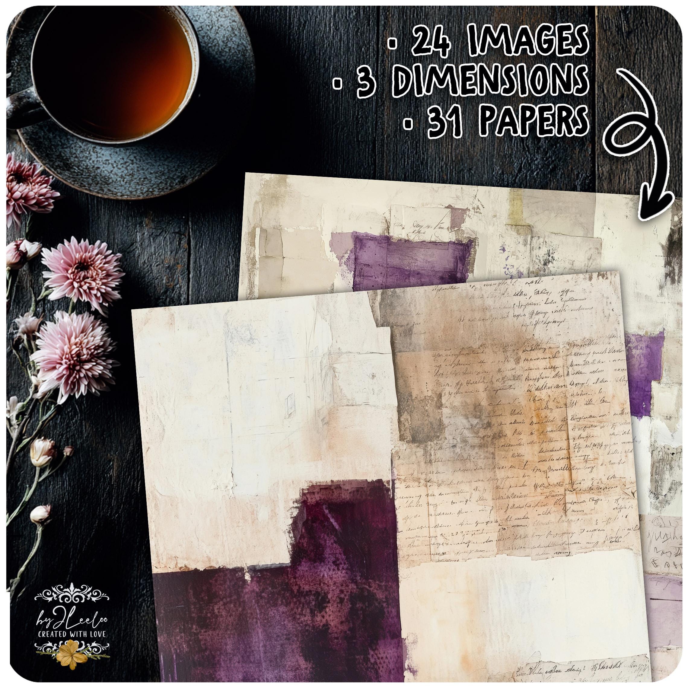 Muted purples blend with warm neutrals, distressed textures, subtle stains, and ghostly writing, creating backgrounds that are expressive without overpowering your work.