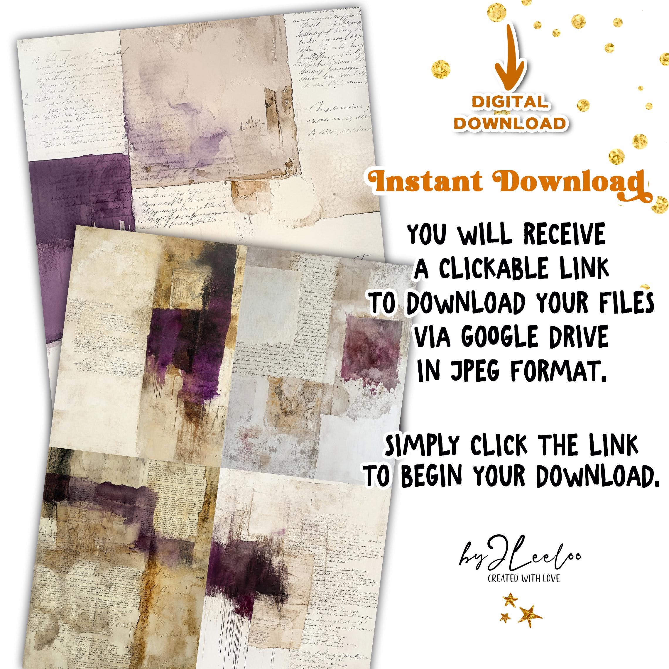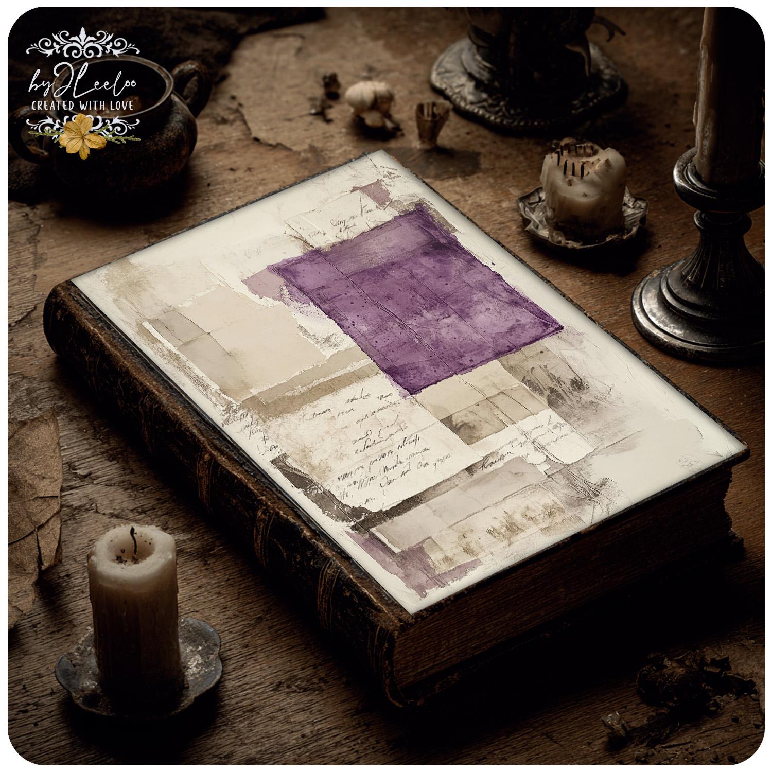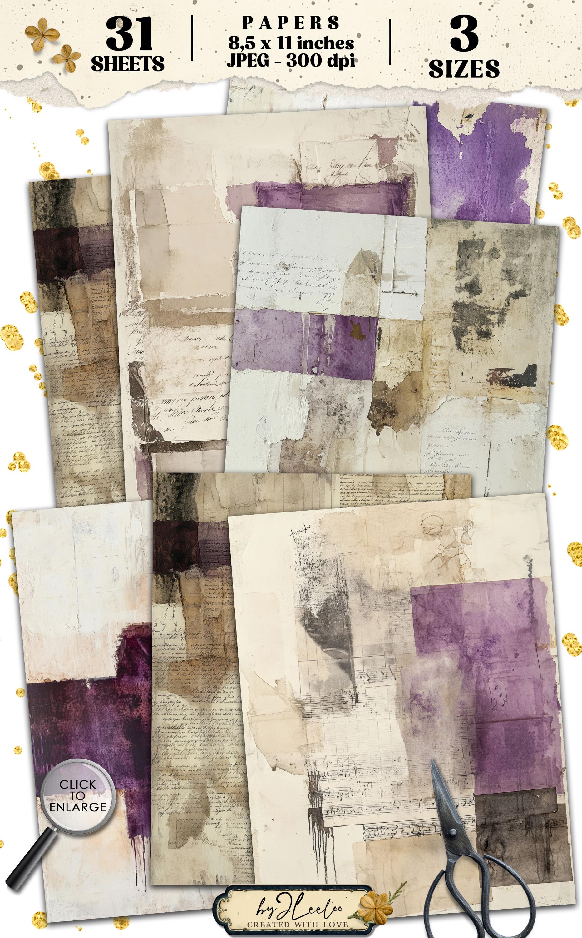 Muted purples blend with warm neutrals, distressed textures, subtle stains, and ghostly writing, creating backgrounds that are expressive without overpowering your work.