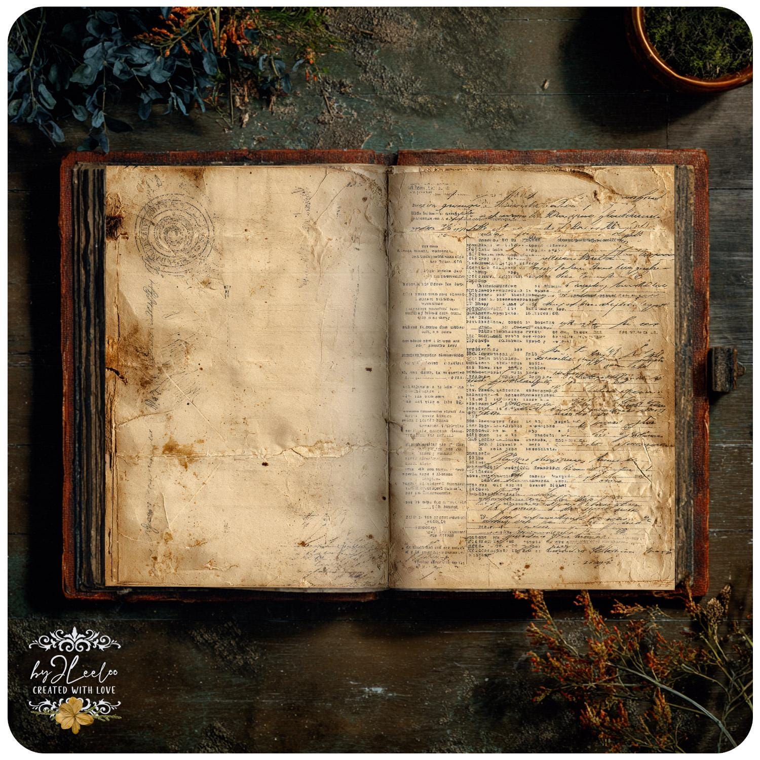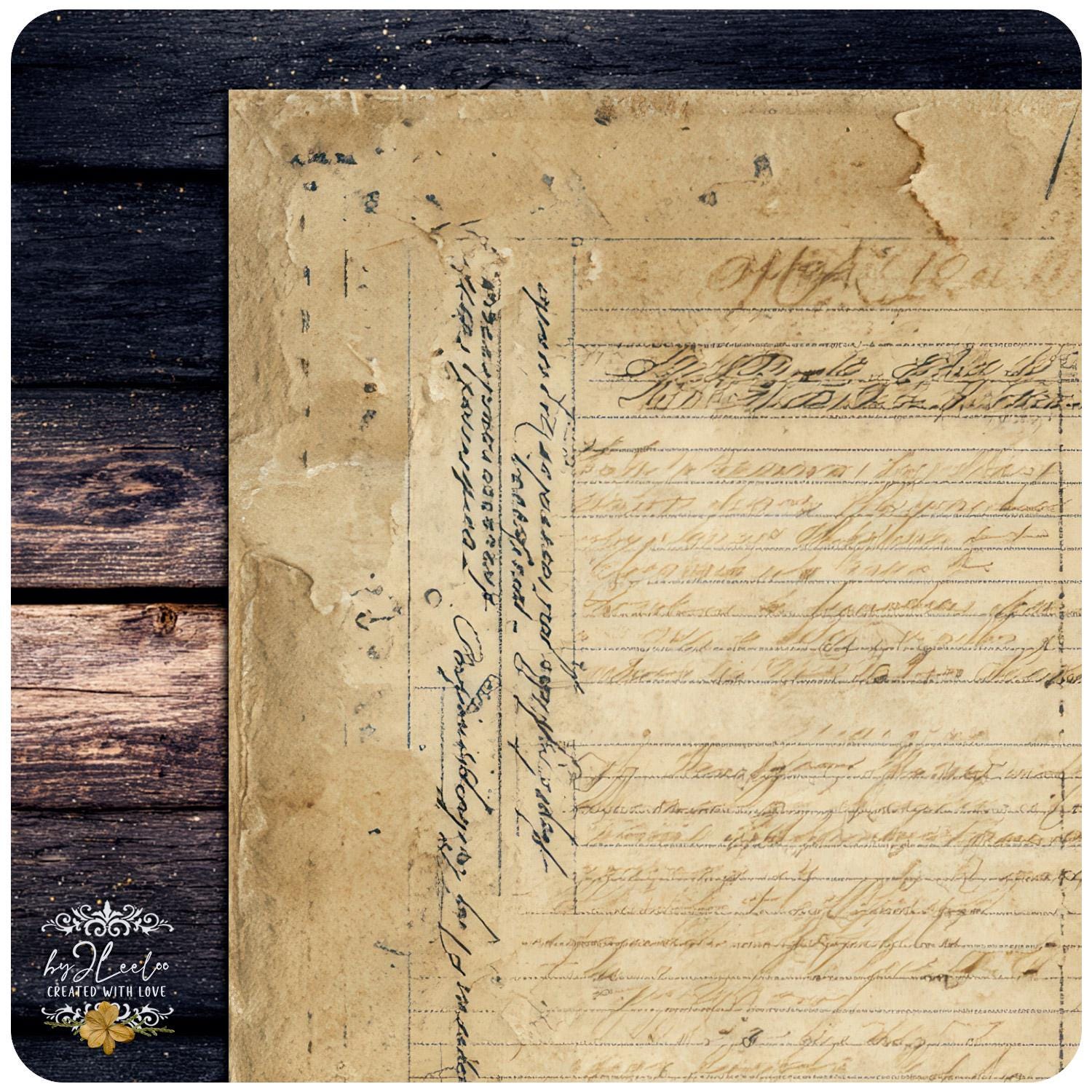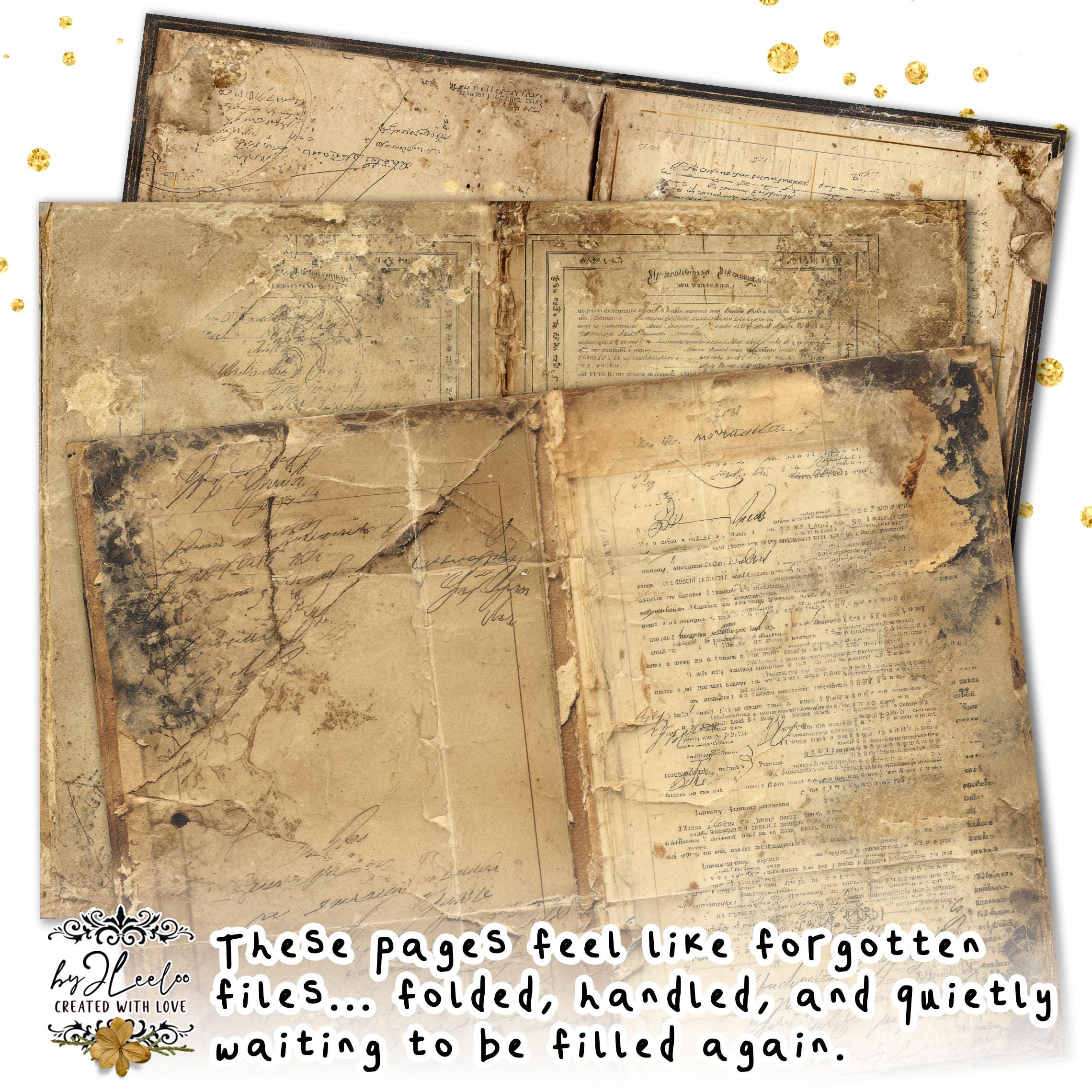 You’ll find distressed paper textures, handwritten scripts, archival layouts, ledger lines, stamps, seals and authentic ephemera details, all blended into richly layered compositions that feel real, not decorative.