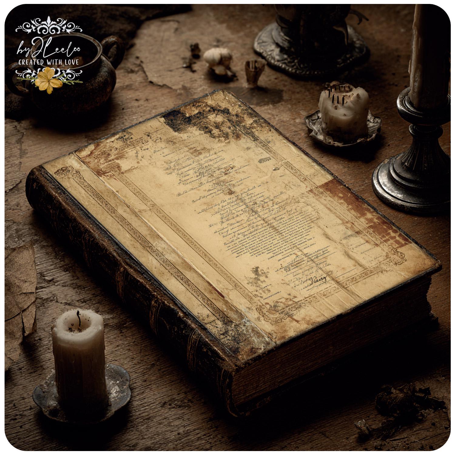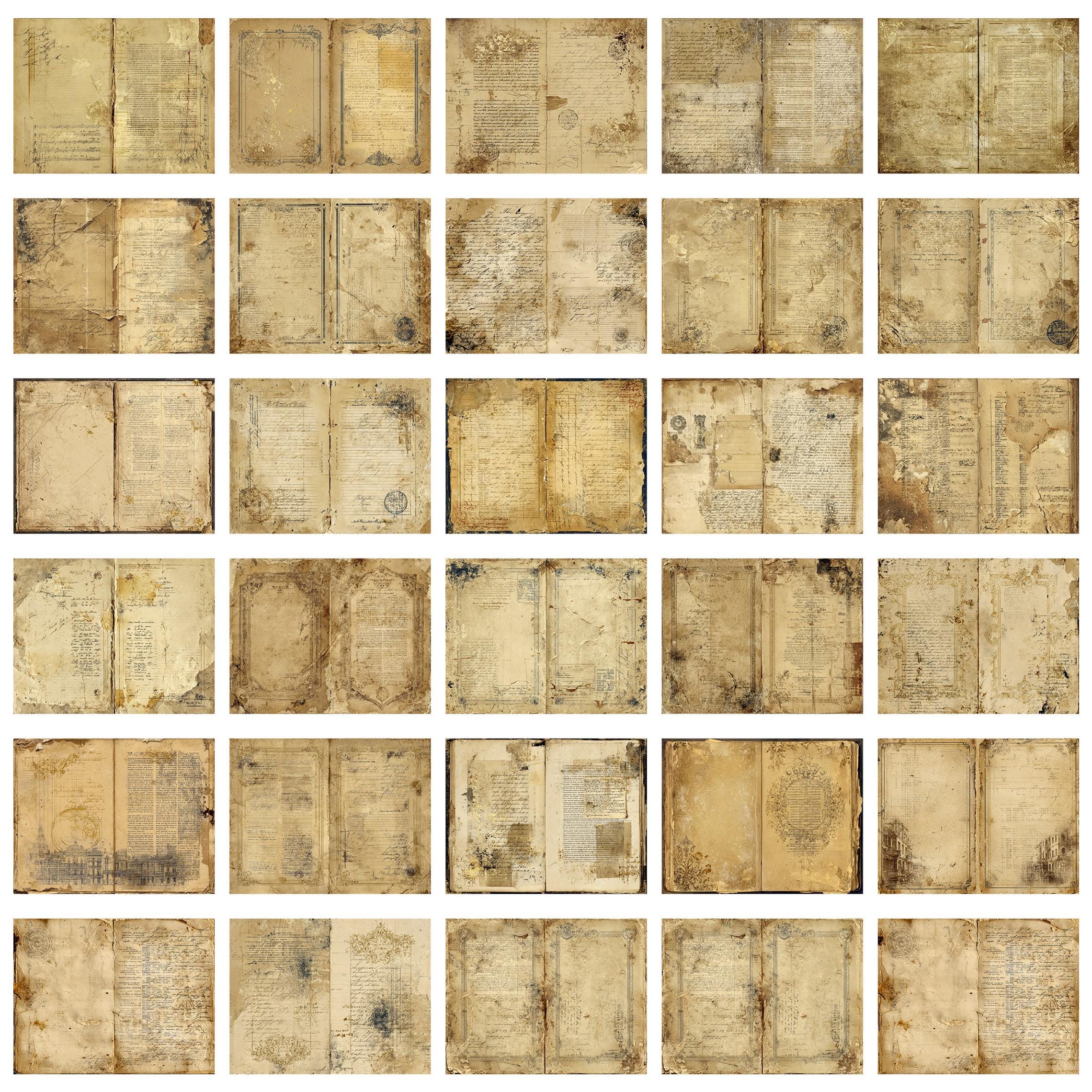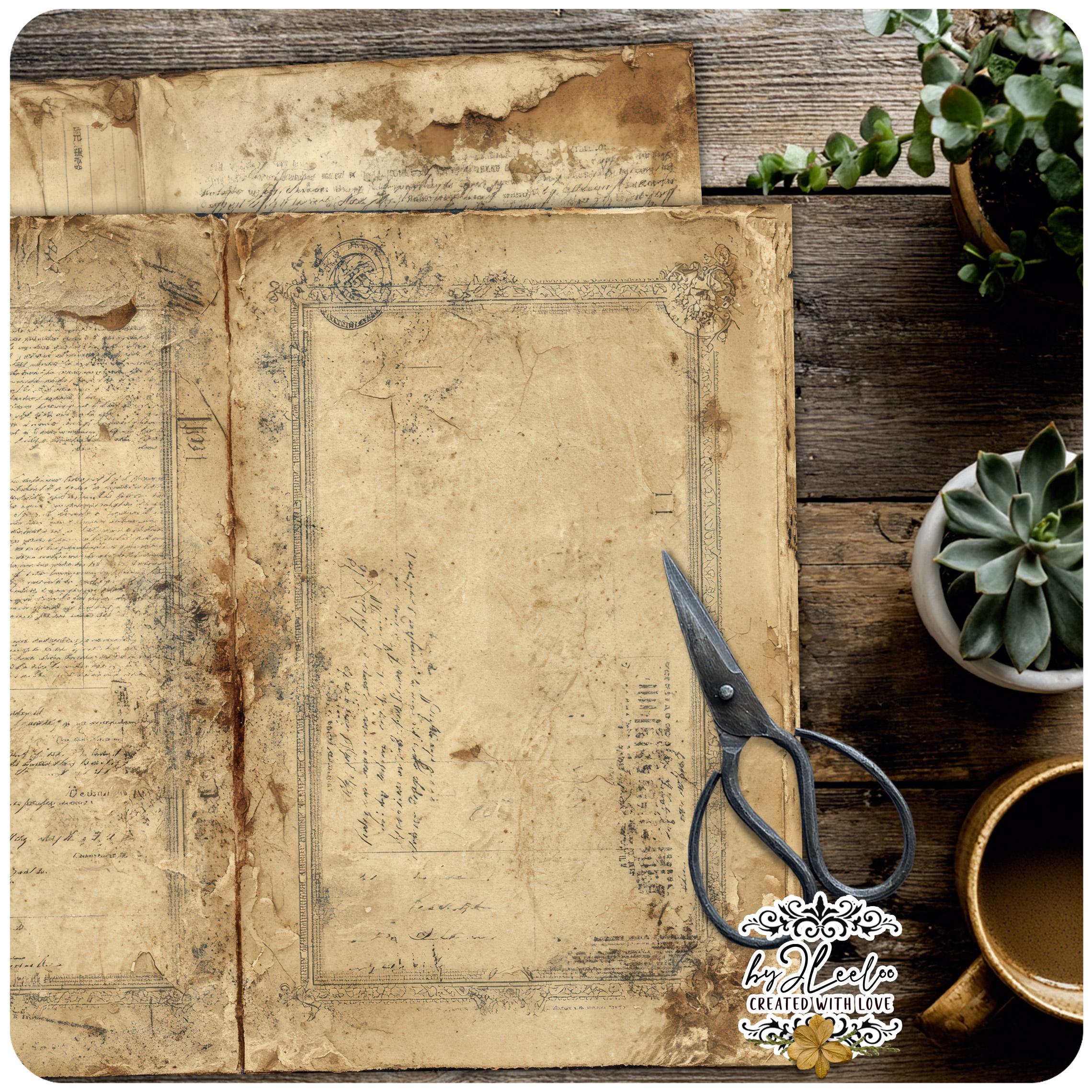 You’ll find distressed paper textures, handwritten scripts, archival layouts, ledger lines, stamps, seals and authentic ephemera details, all blended into richly layered compositions that feel real, not decorative.
