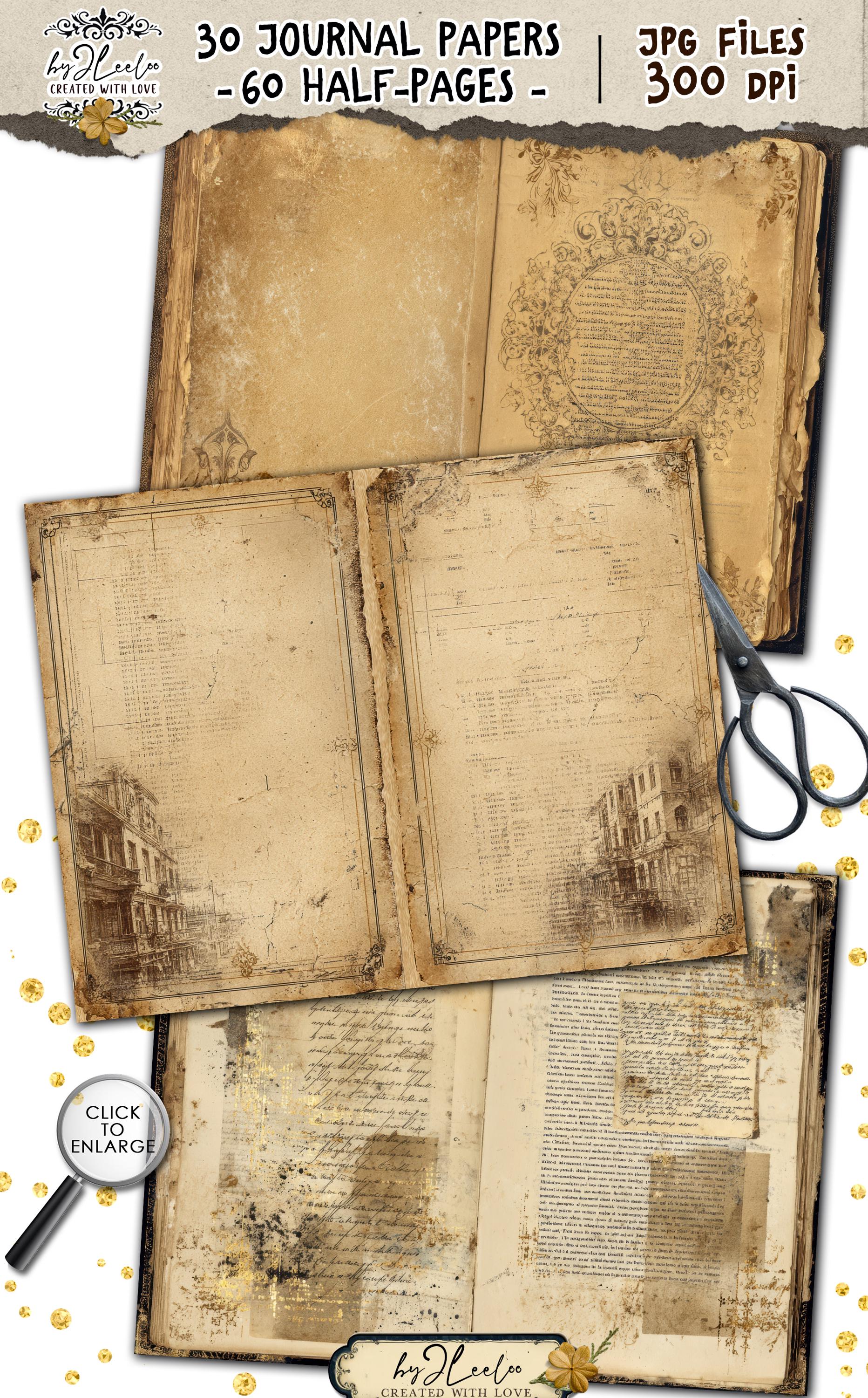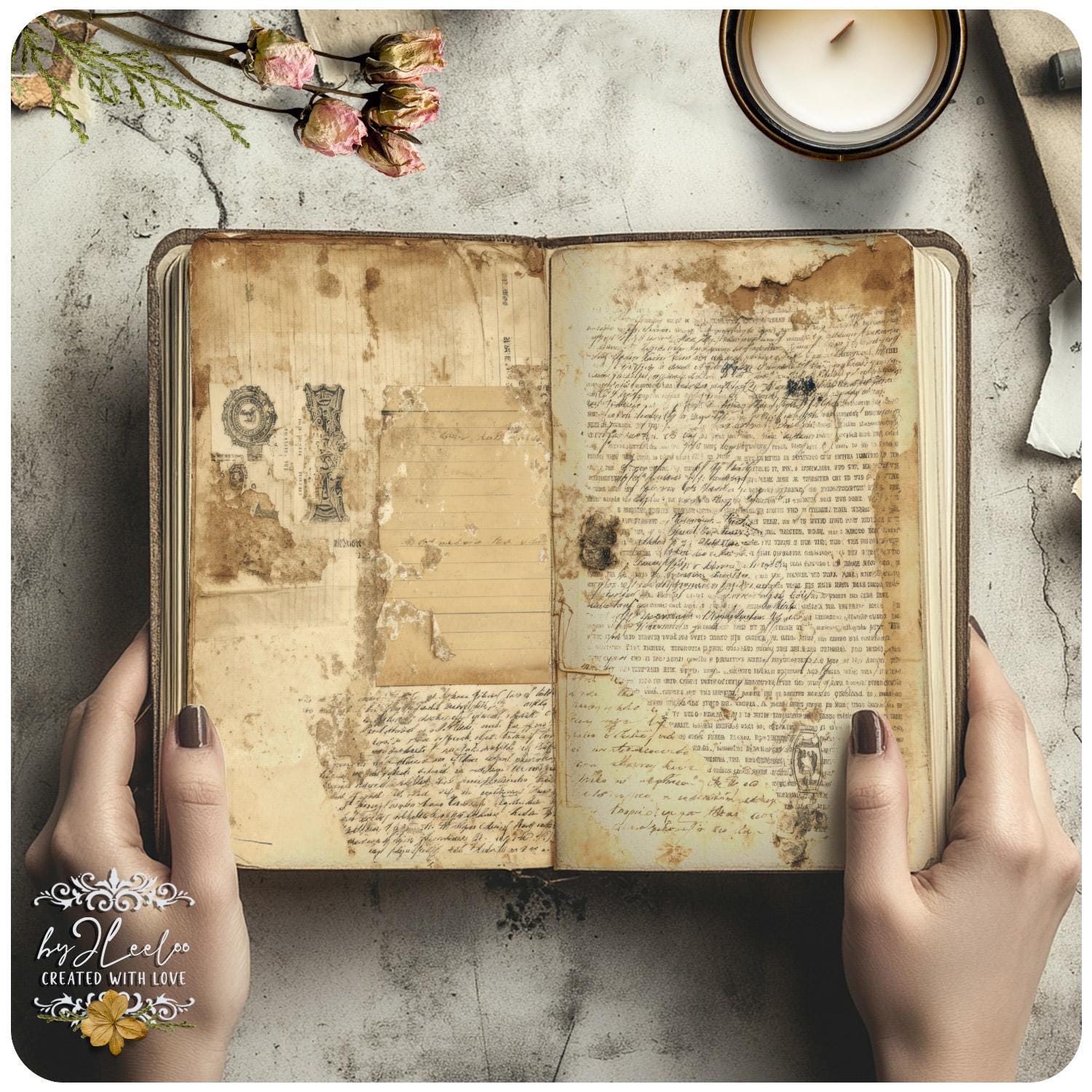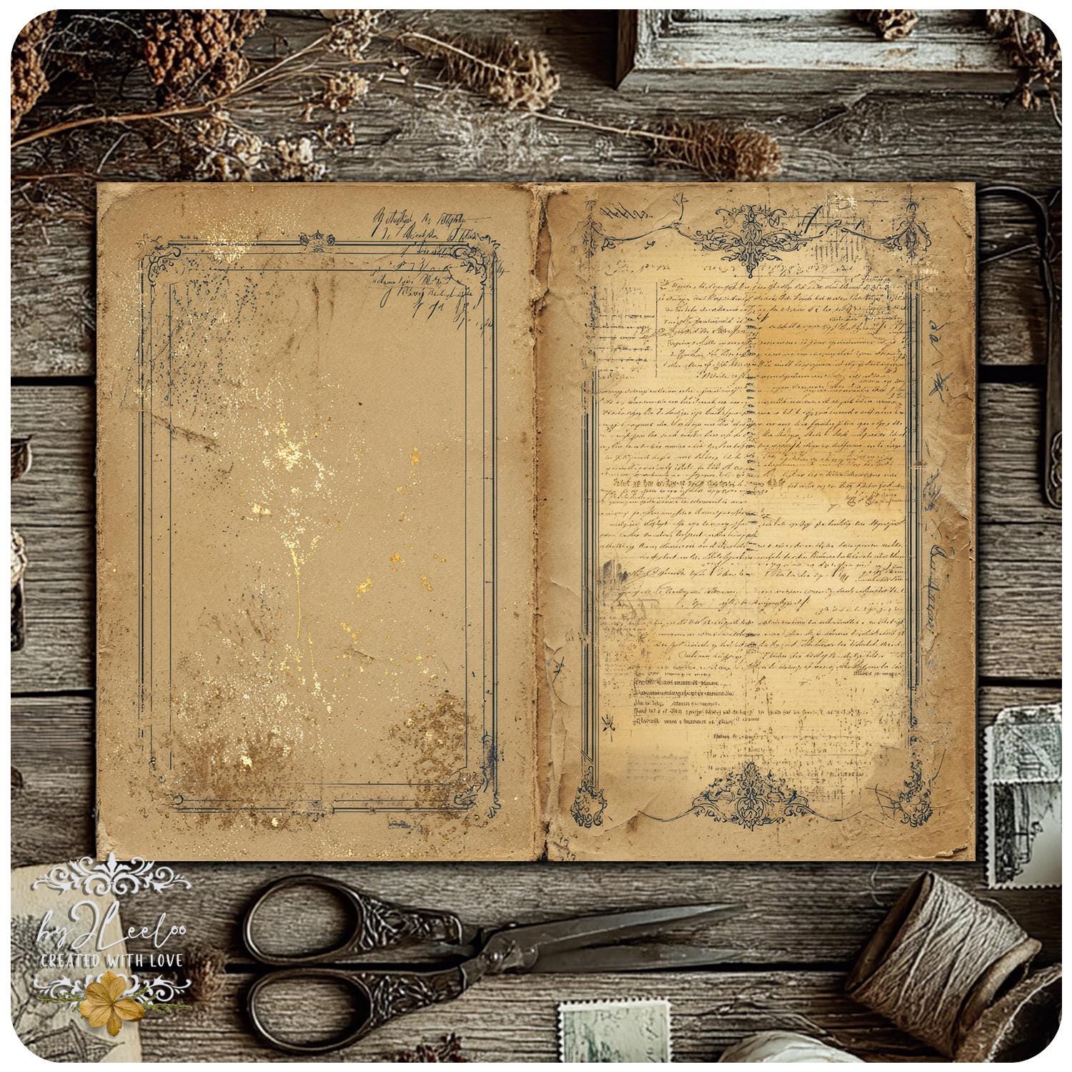 Each page is designed as a full double spread, perfect for junk journals, altered books, collage journals, mixed media projects and vintage scrapbooking.