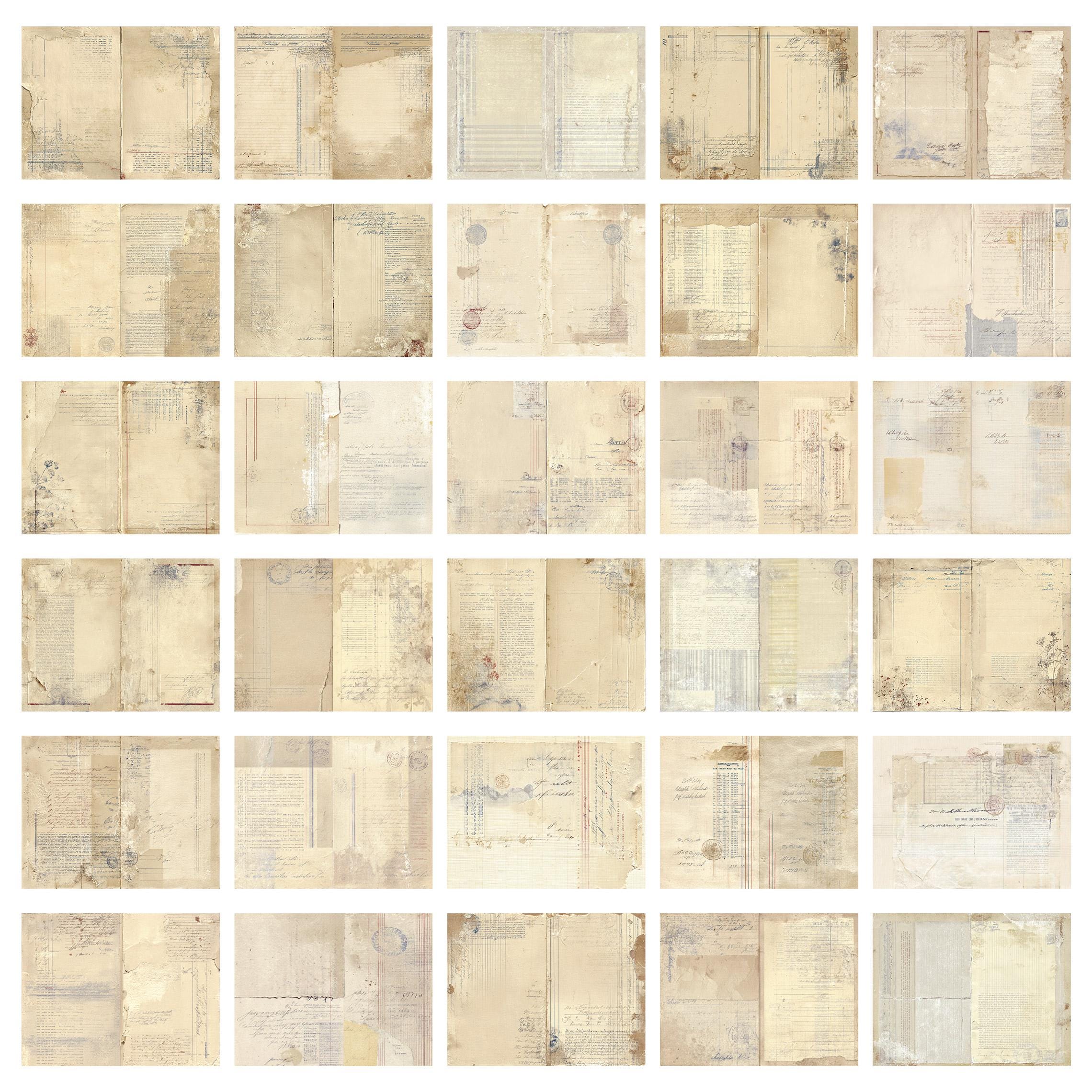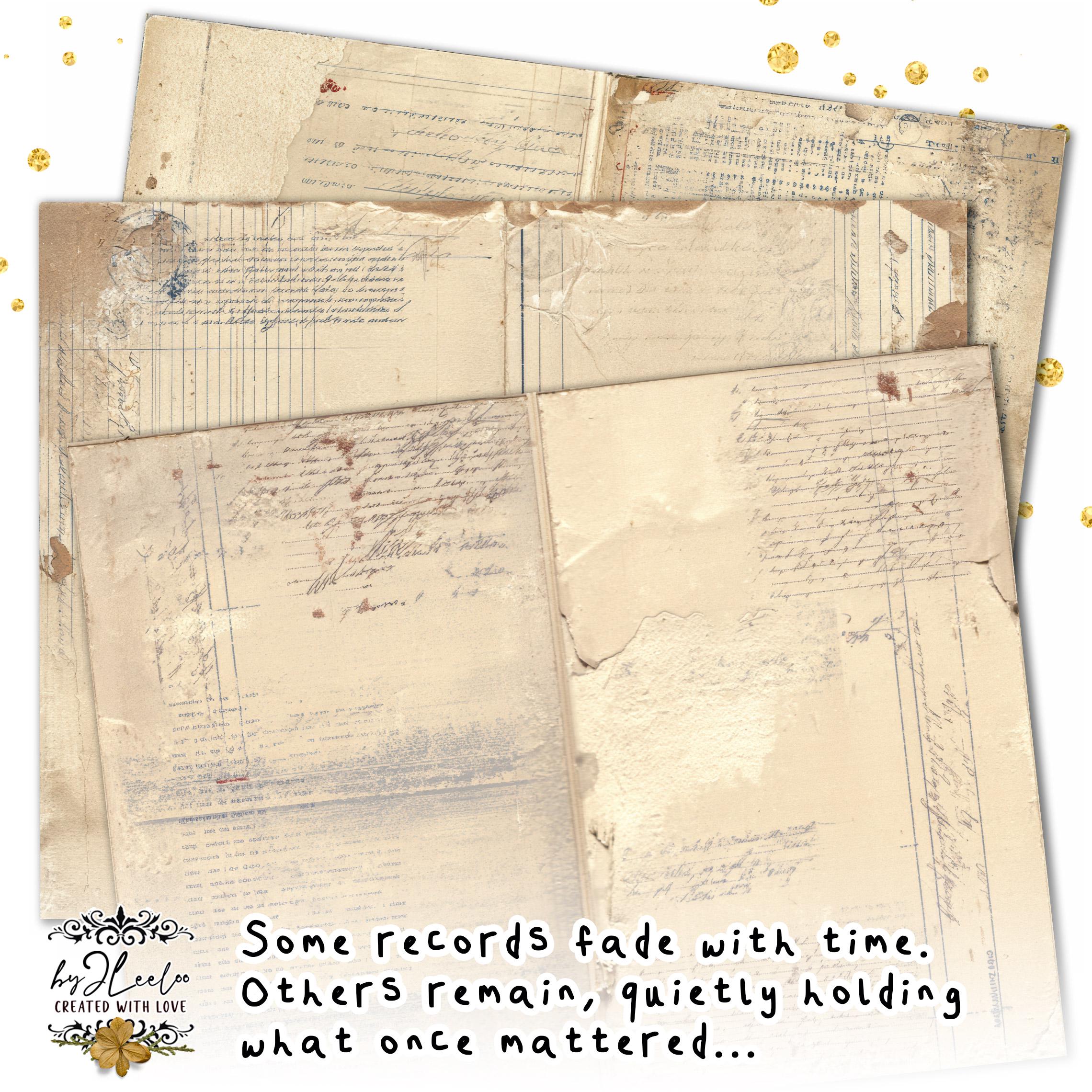 Each page features faded ledger lines, subtle ink marks, ghosted text, and archival paper textures in warm ivory, pale beige, and softly muted neutrals.