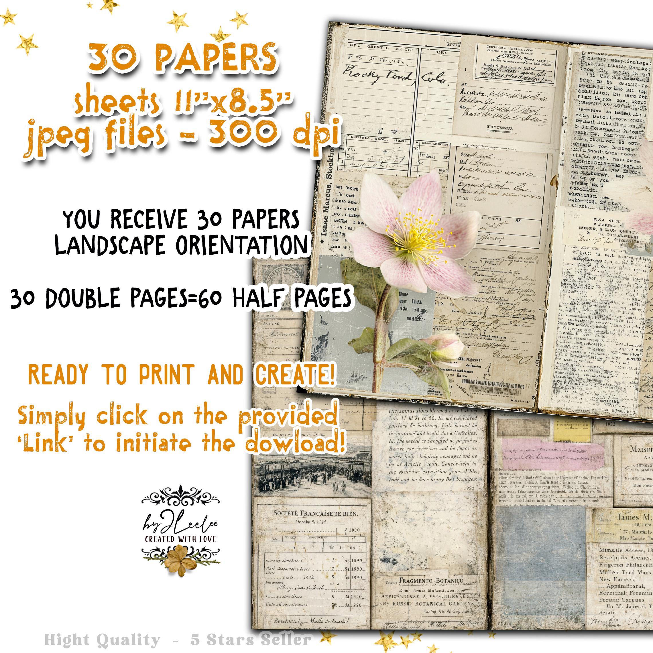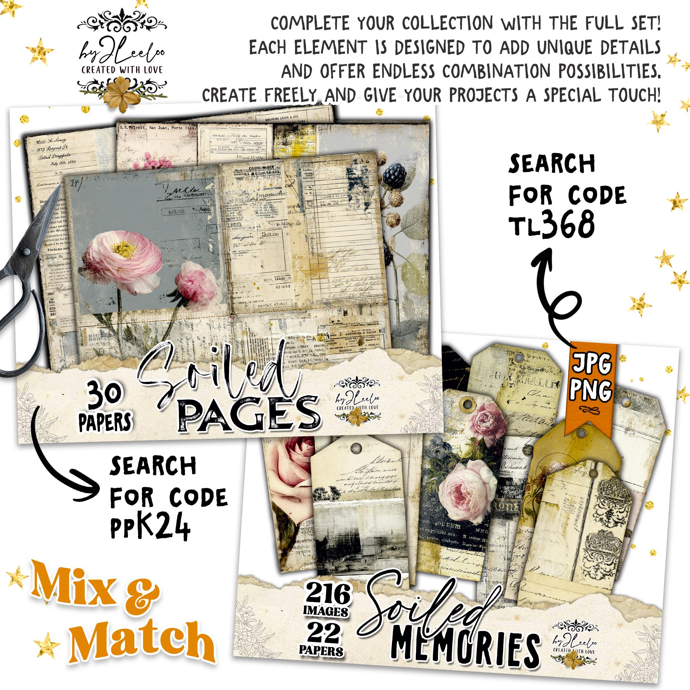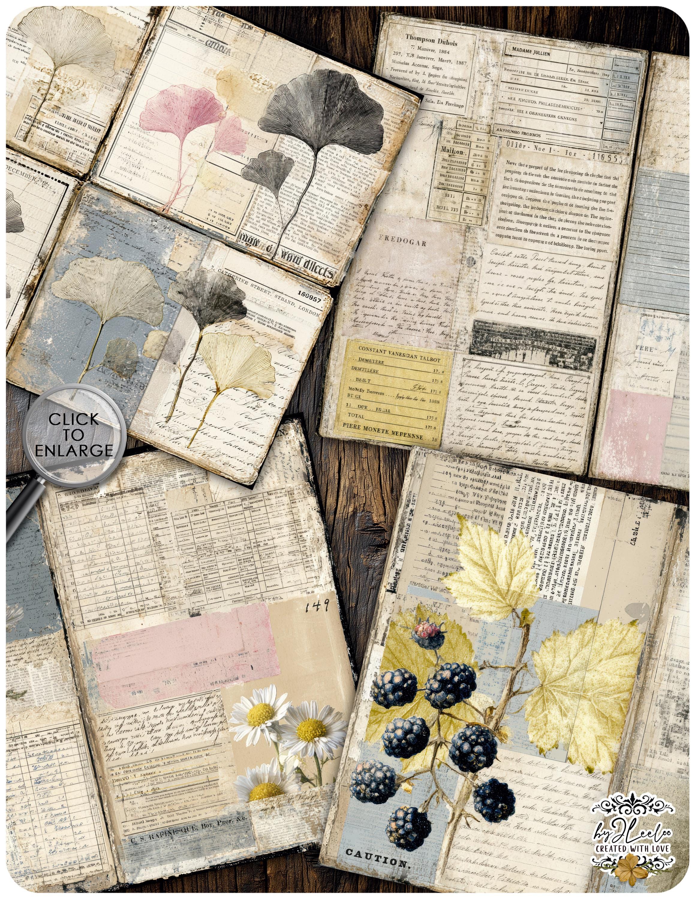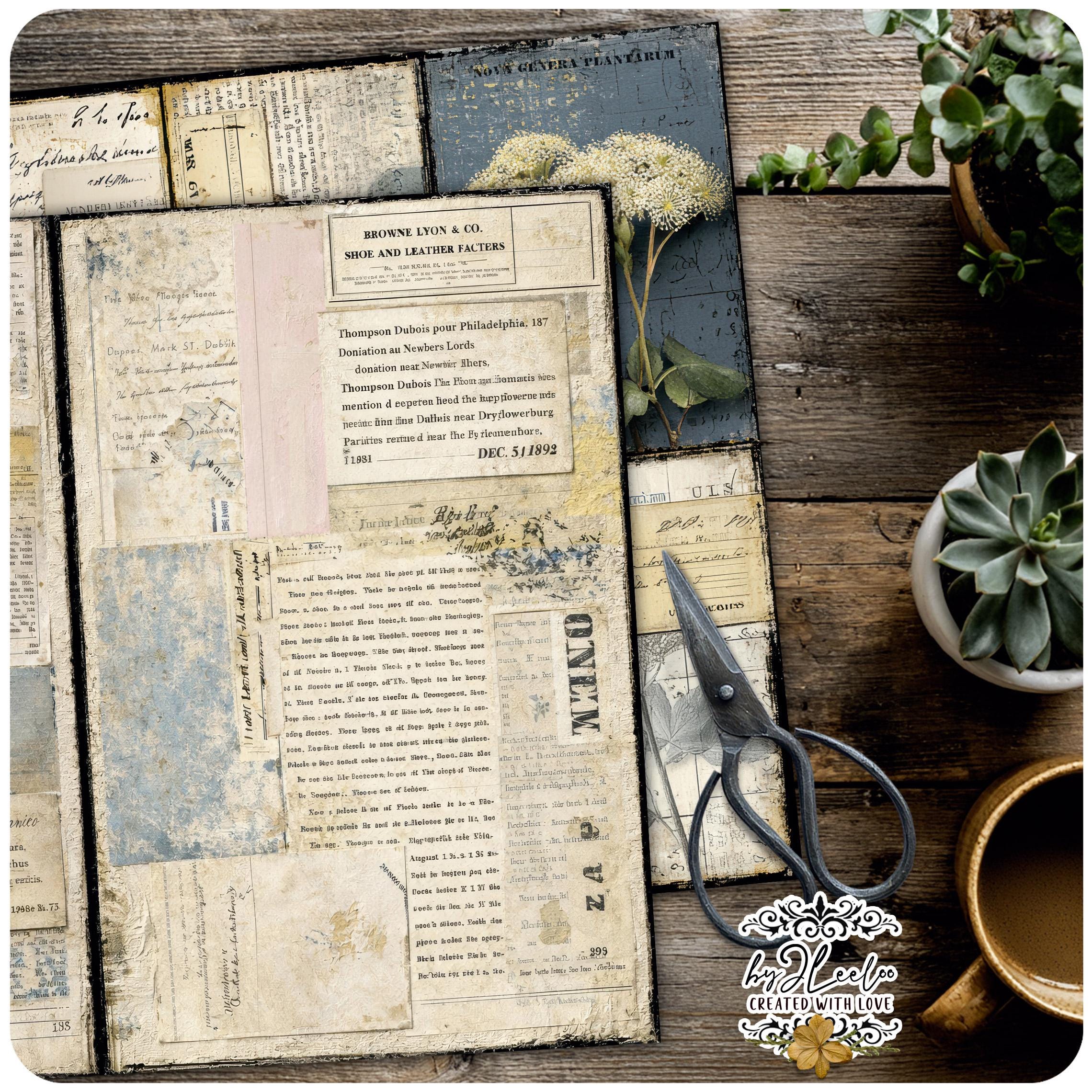 The style is openly grunge and worn, ideal for junk journals, mixed media diaries, and narrative collage work where paper becomes atmosphere rather than information.