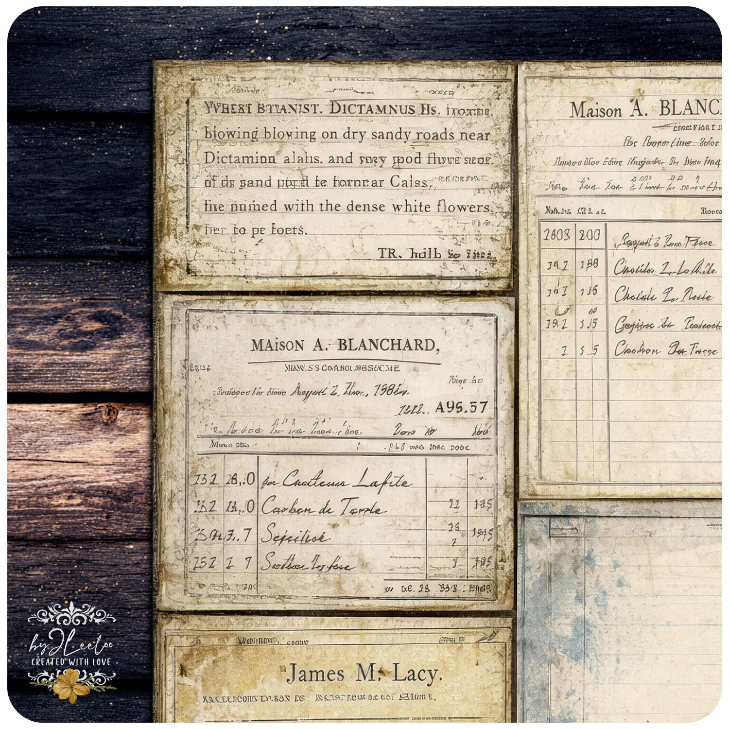 Ledgers, letters, forms, and typographic fragments live together on deliberately aged surfaces, with some text still readable and other areas intentionally faded or partially illegible, recreating the layered, worn look typical of old papers.