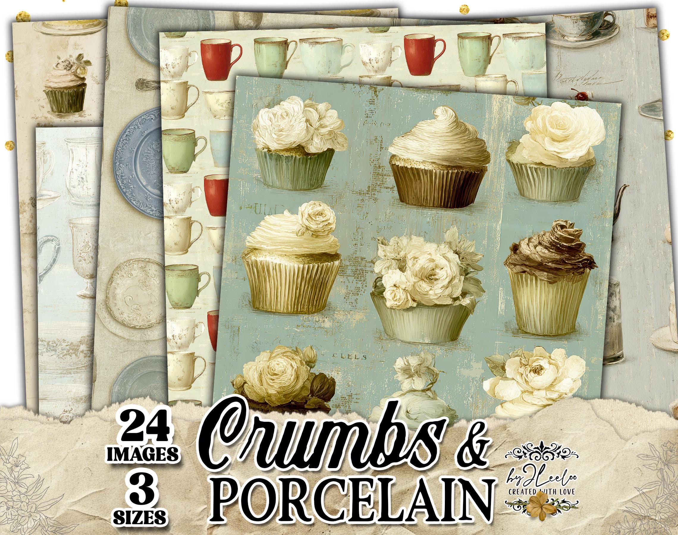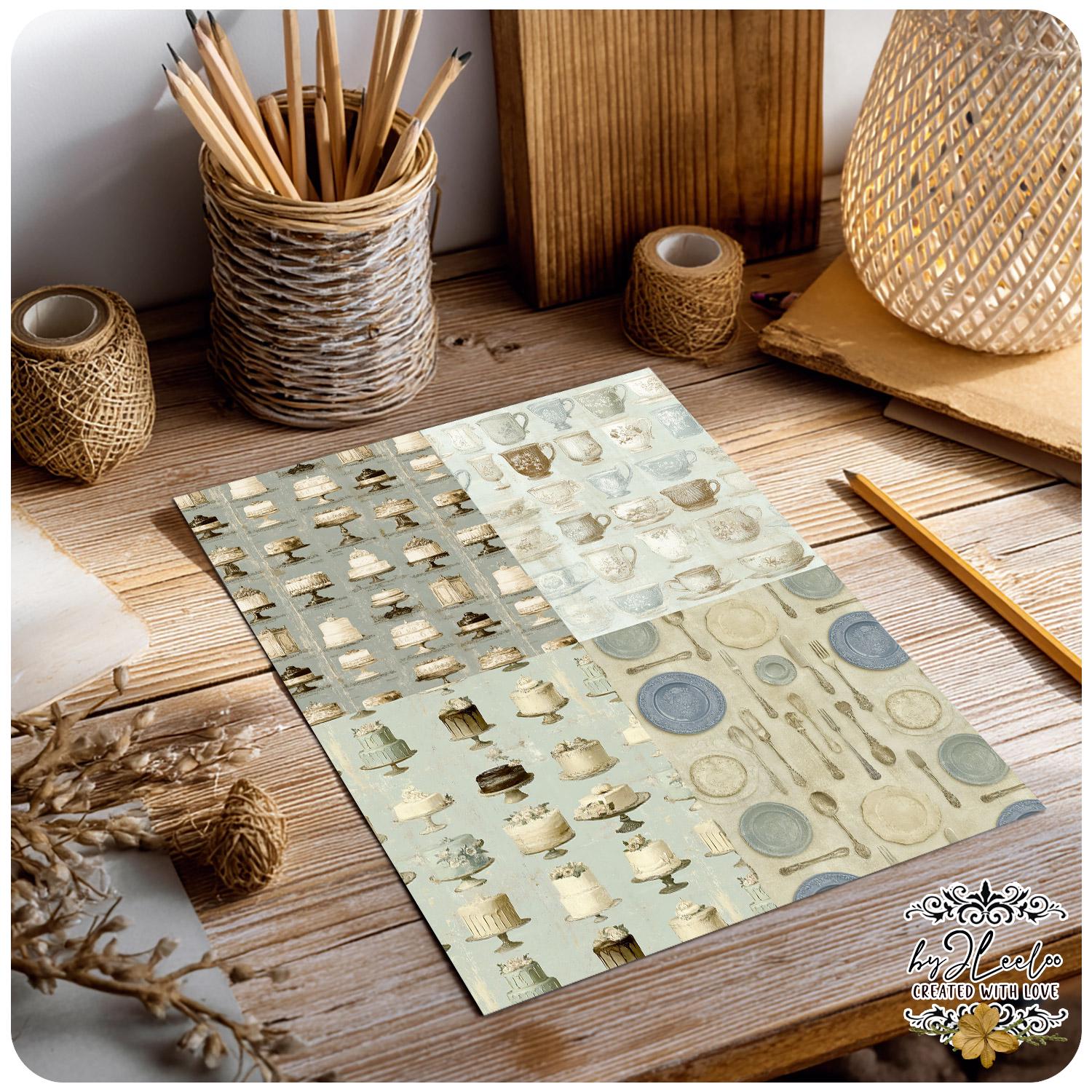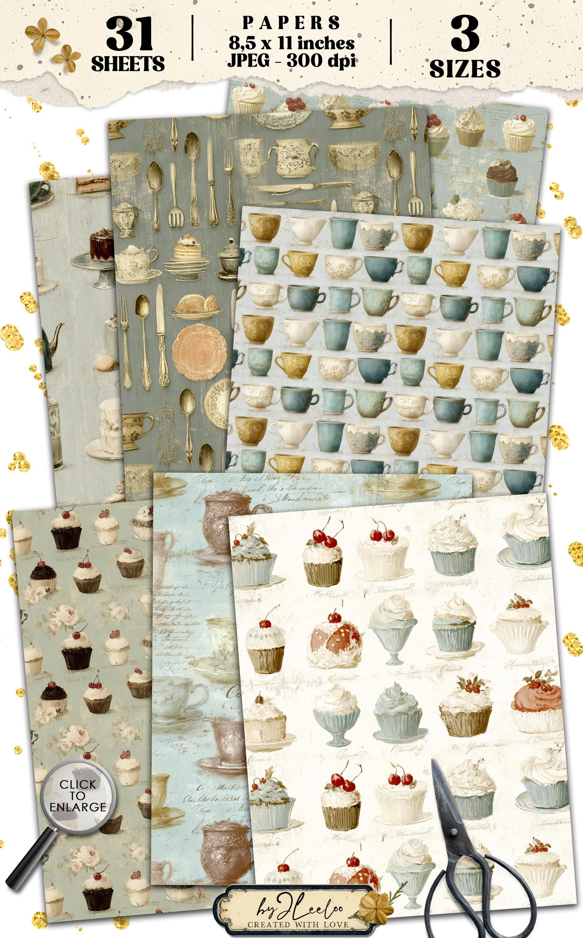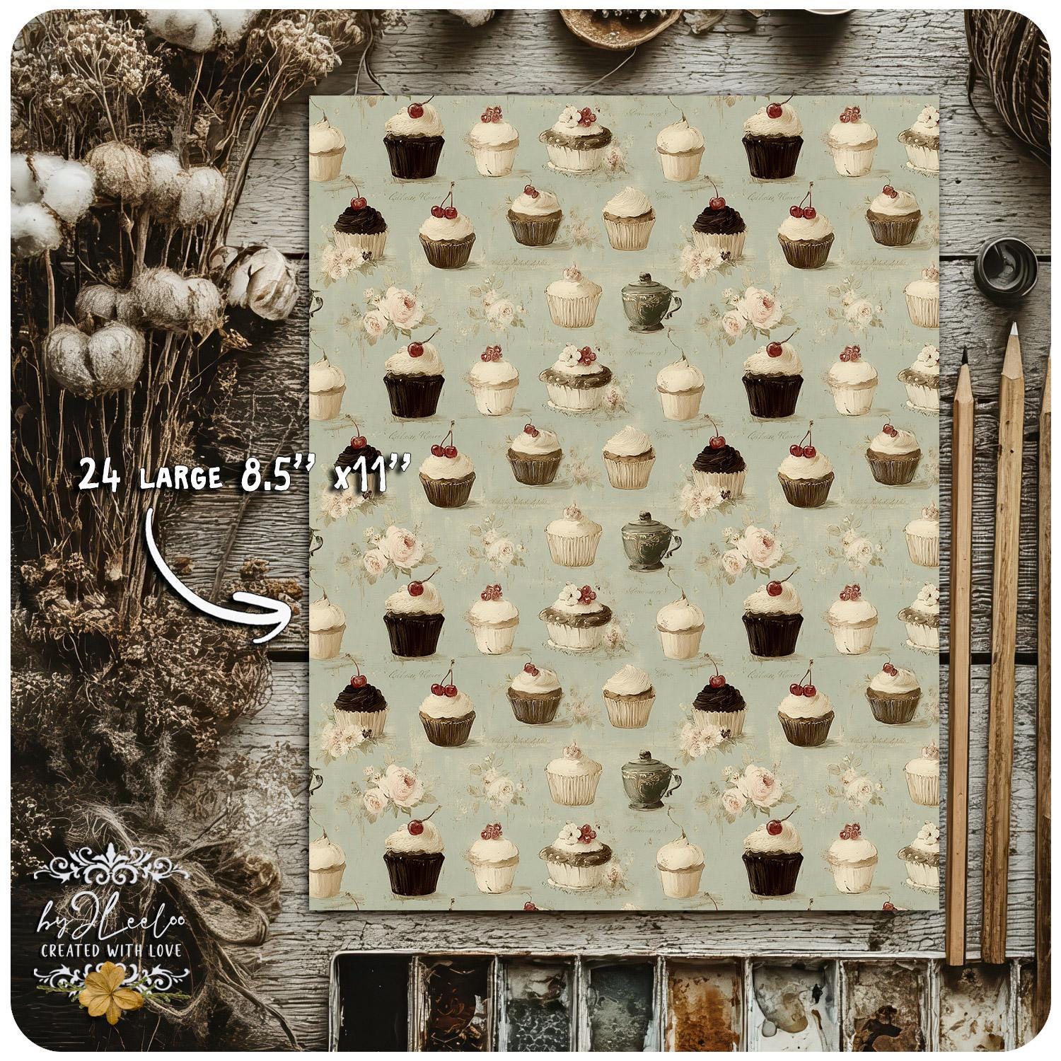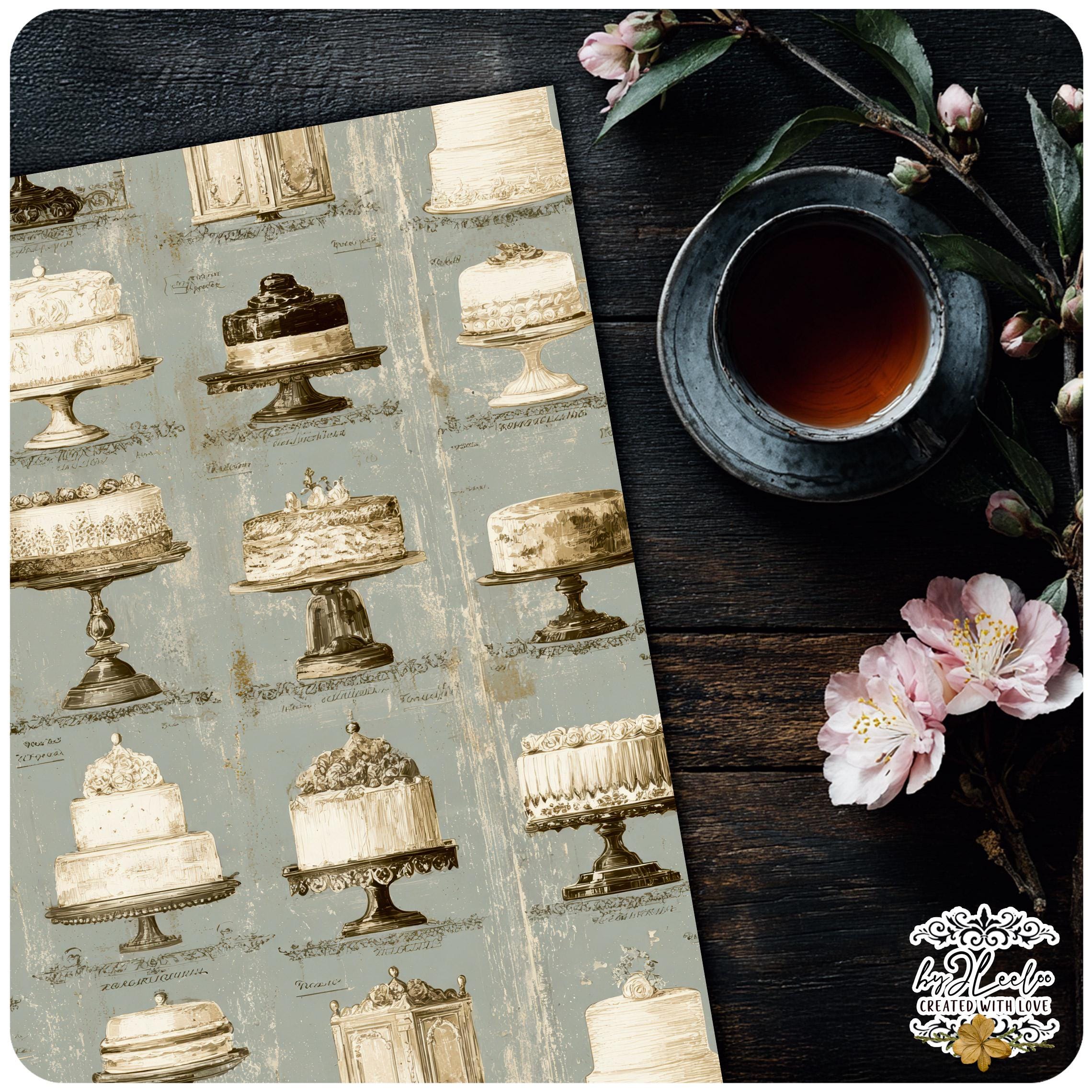 The images blend cakes, cupcakes, teapots, tableware, and vintage pรขtisserie details, layered with worn textures, faded handwriting, and a soft color palette of ivory, celadon, cream, and sugar-dust tones.