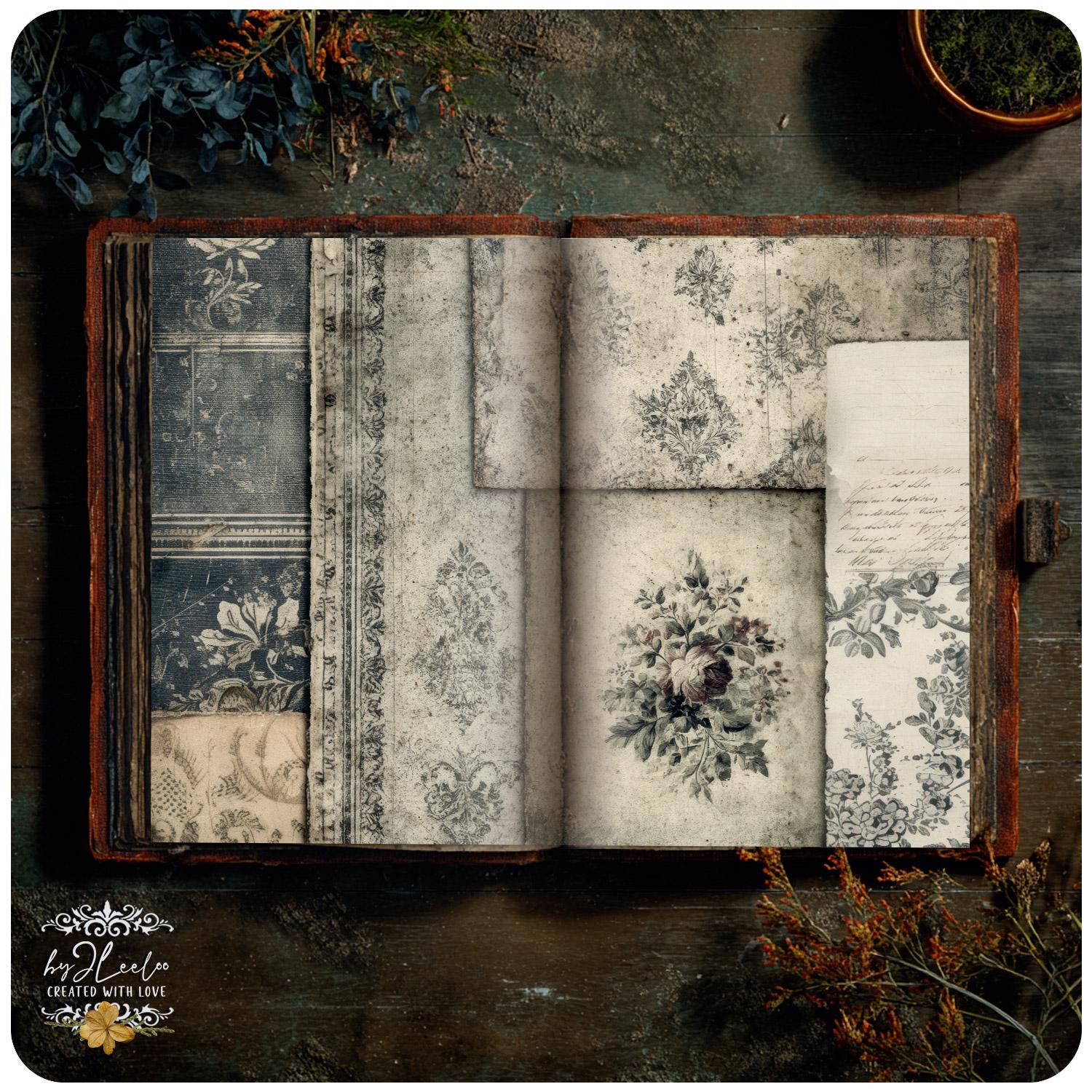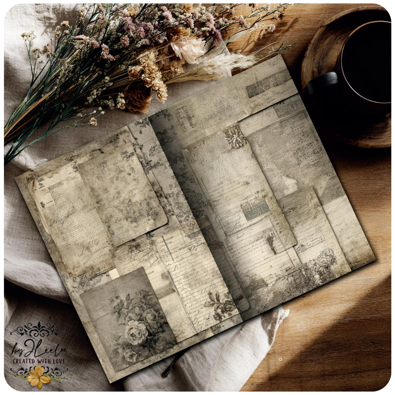 These pages preserve a fragile, dusty aesthetic made of traces, soft layers, and worn marks, ideal as a base for junk journals, collages, art journals, and mixed media diaries.