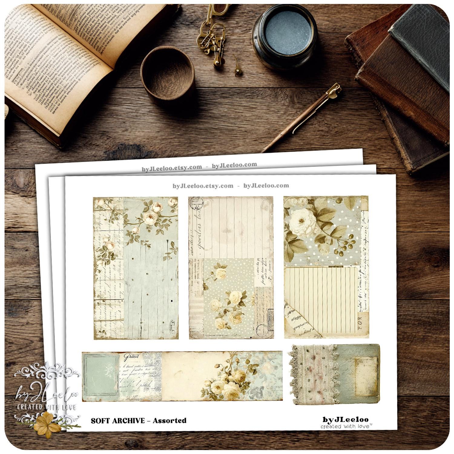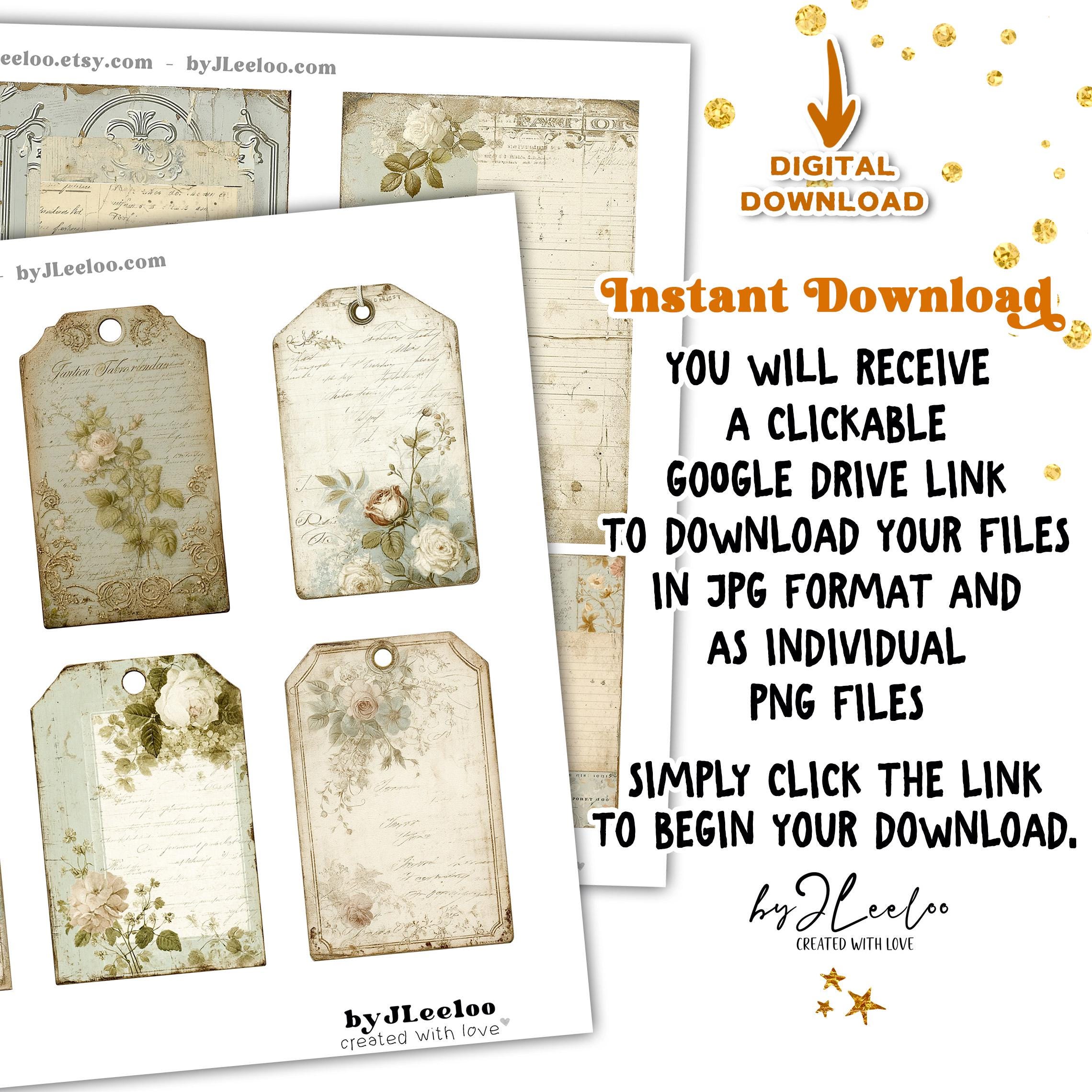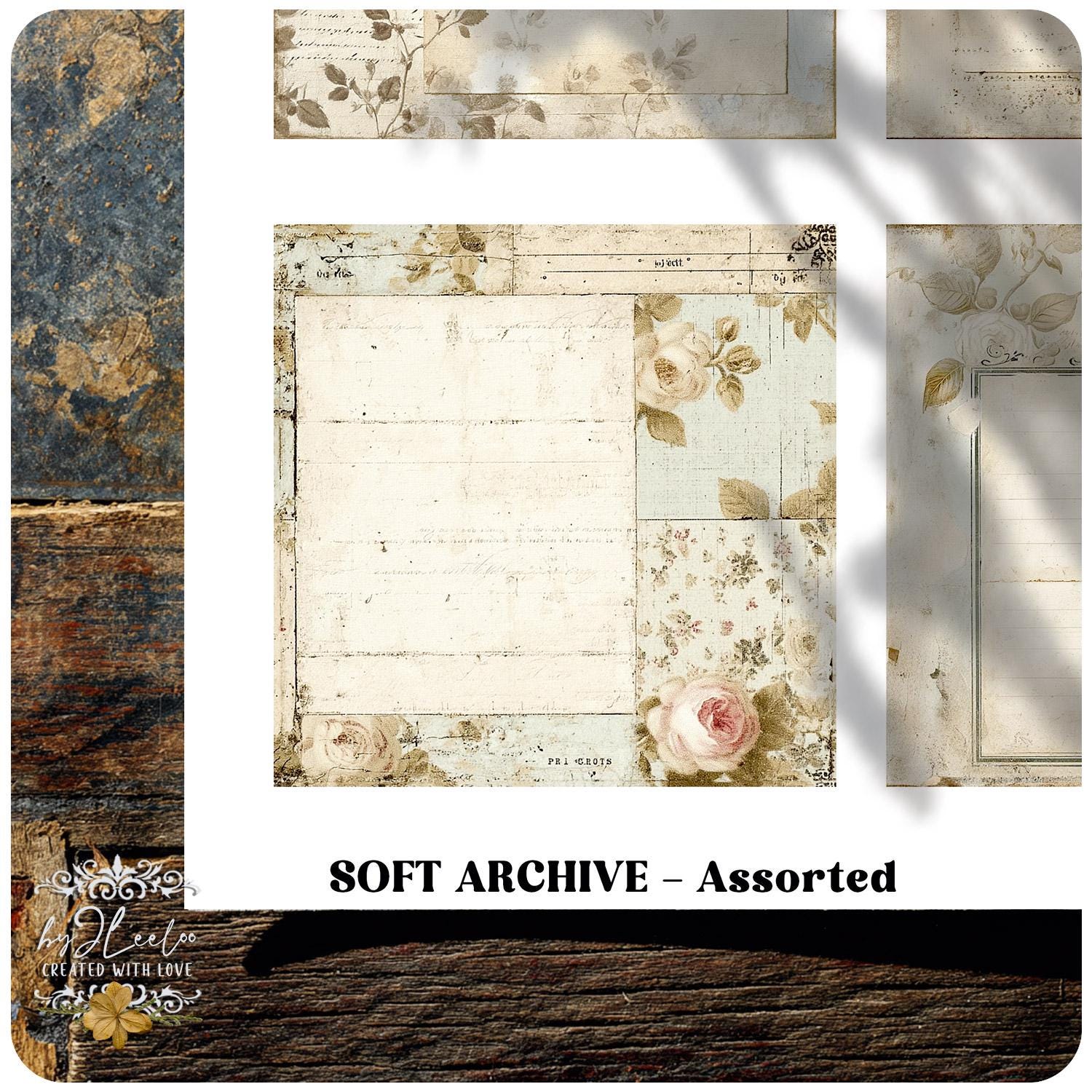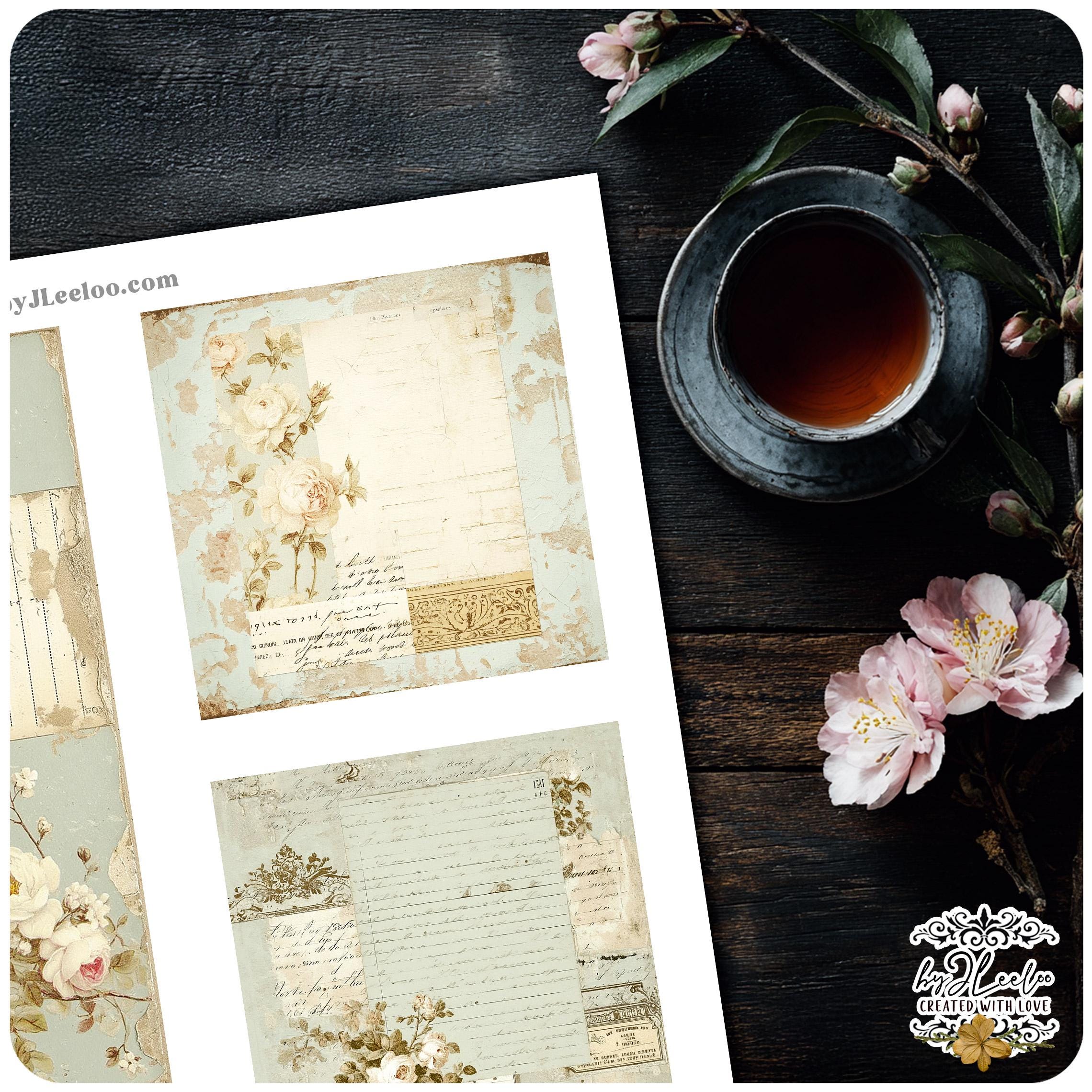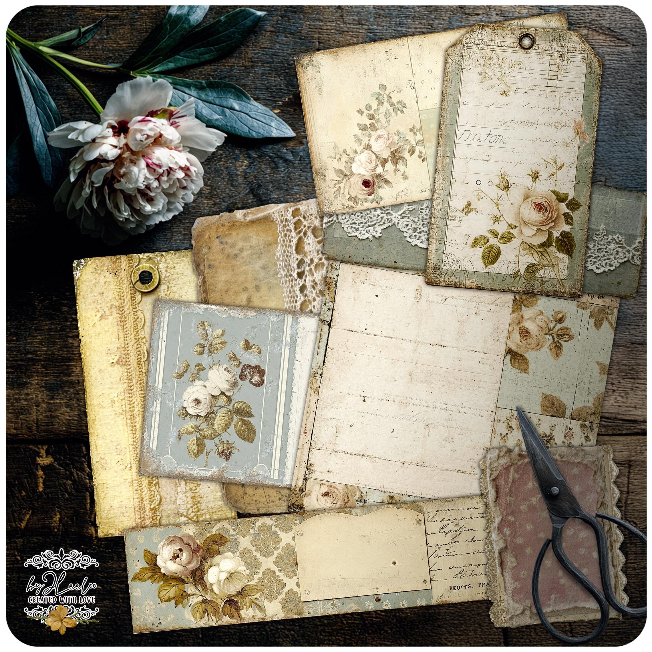This set brings together images in different sizes and formats, all sharing the same soft, aged aesthetic — worn paper, subtle florals, handwritten traces and muted textures that feel timeless and tactile.