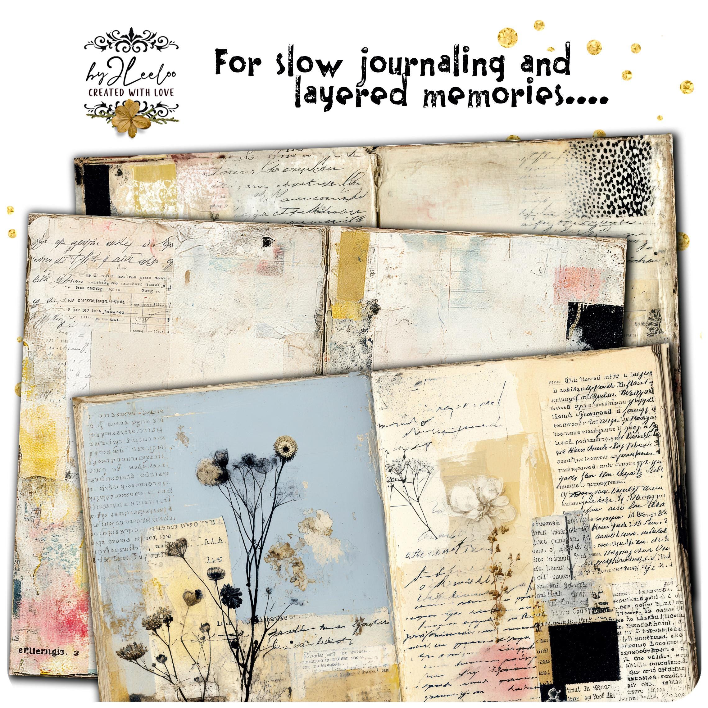 Each spread is designed to support slow journaling β writing, layering, collaging, remembering.