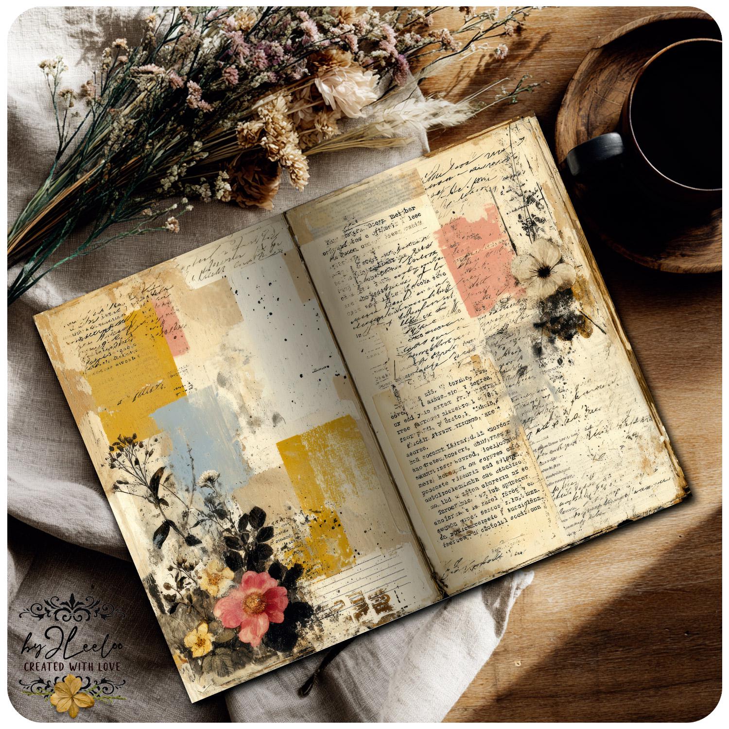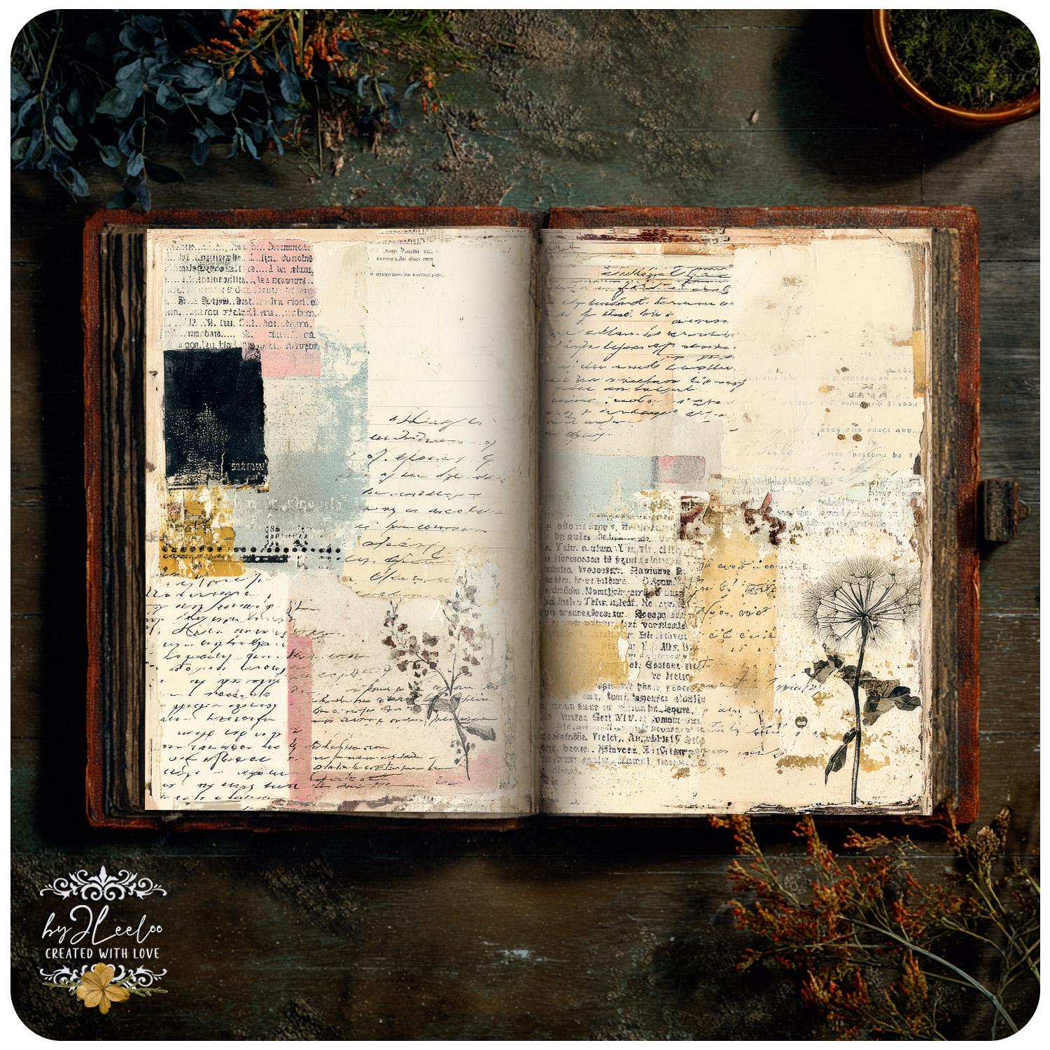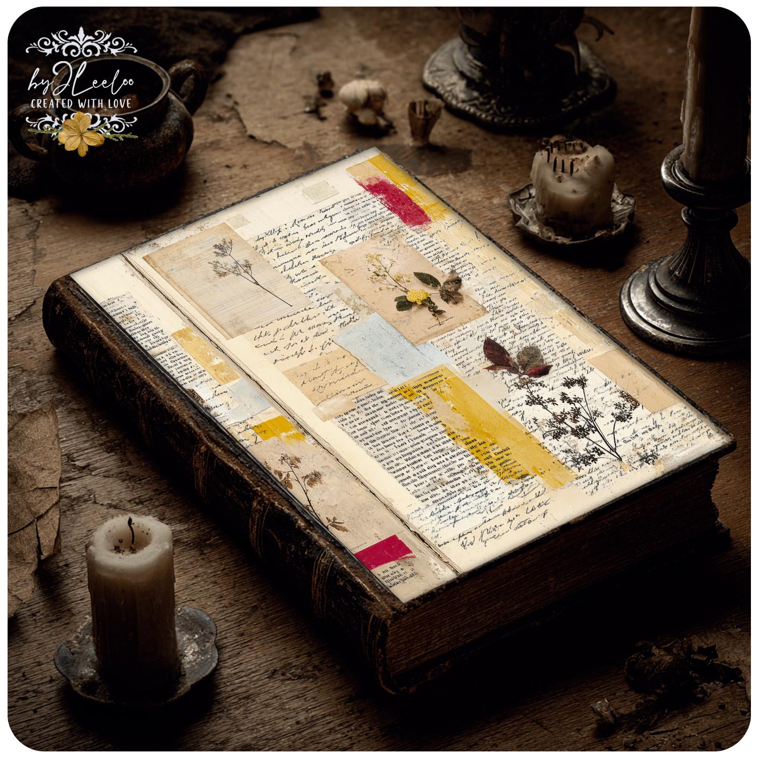 Softly layered papers, faded handwriting fragments, aged textures and gentle botanical traces come together without ever overpowering your words.