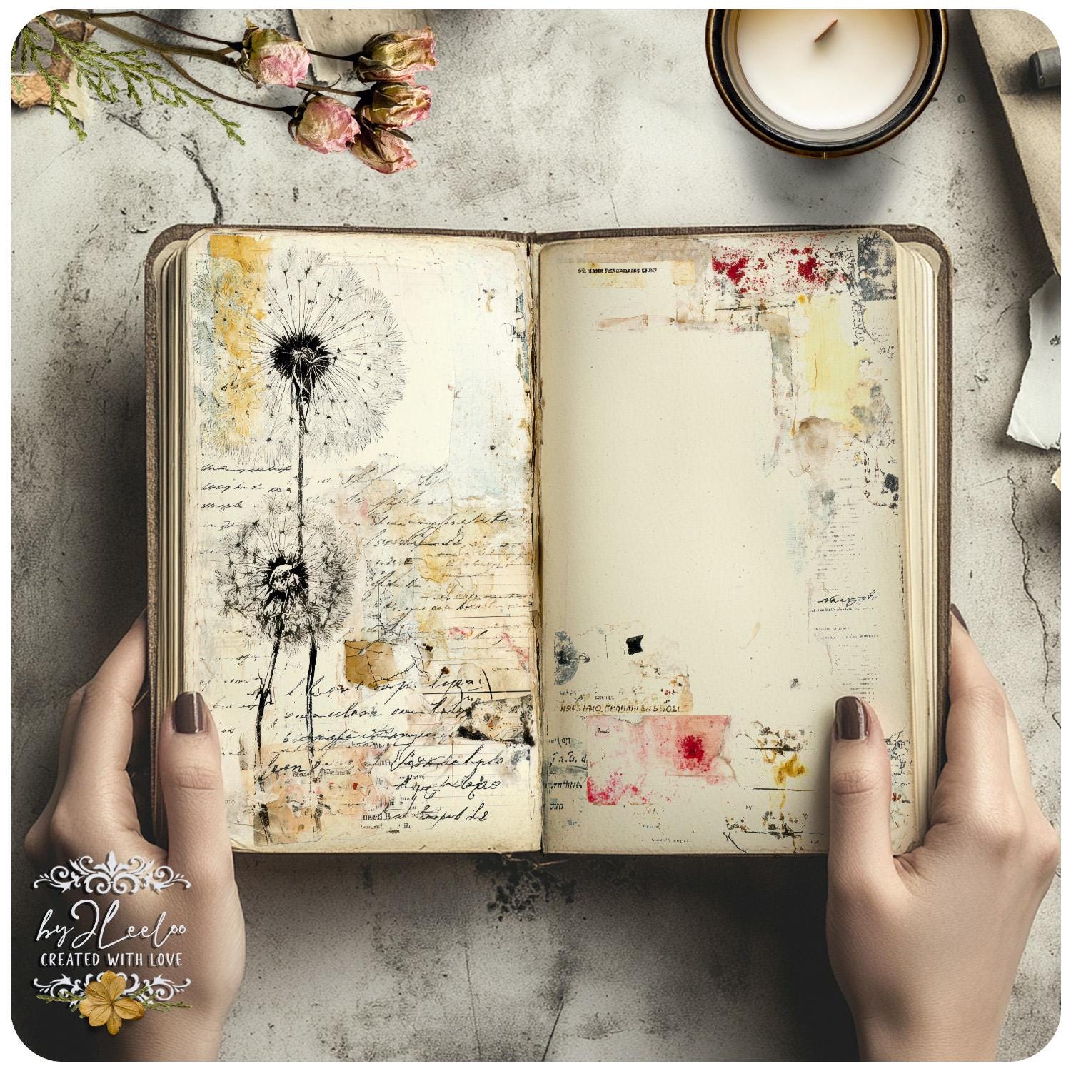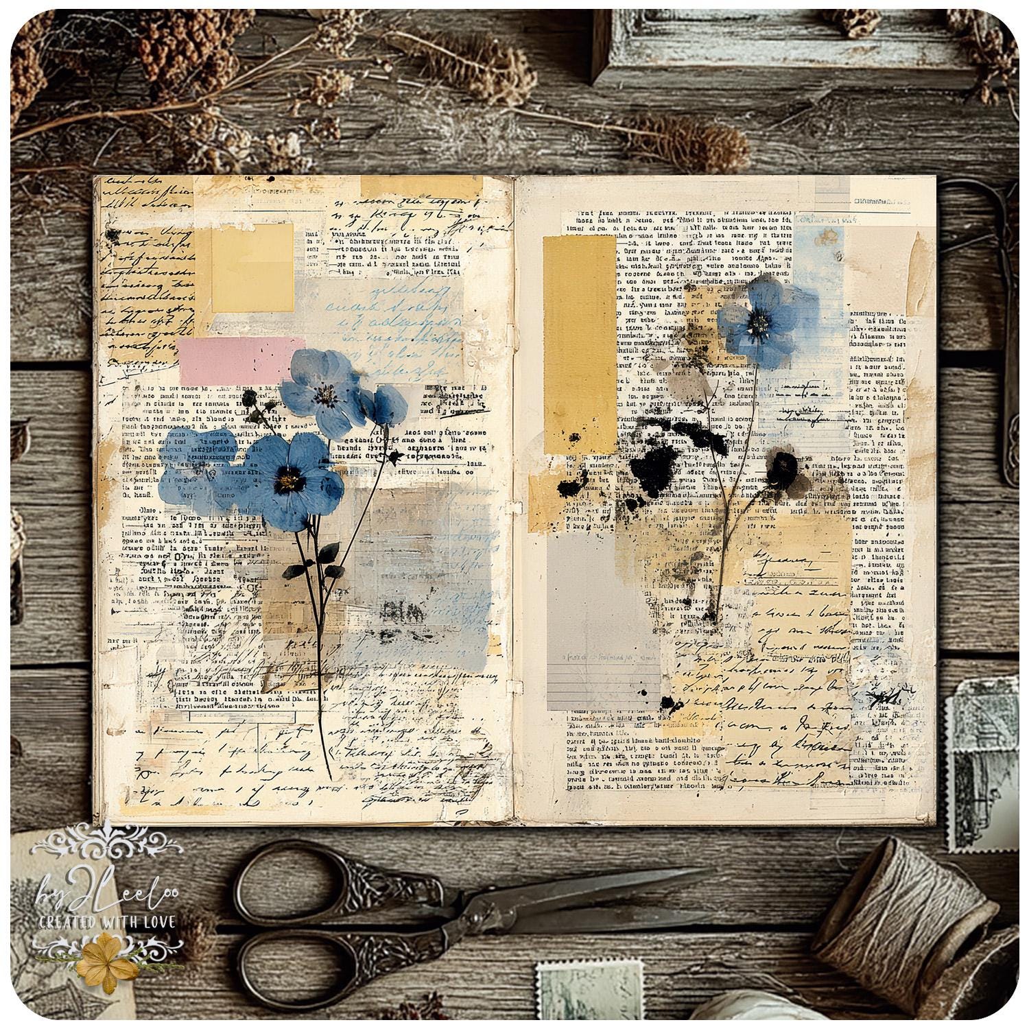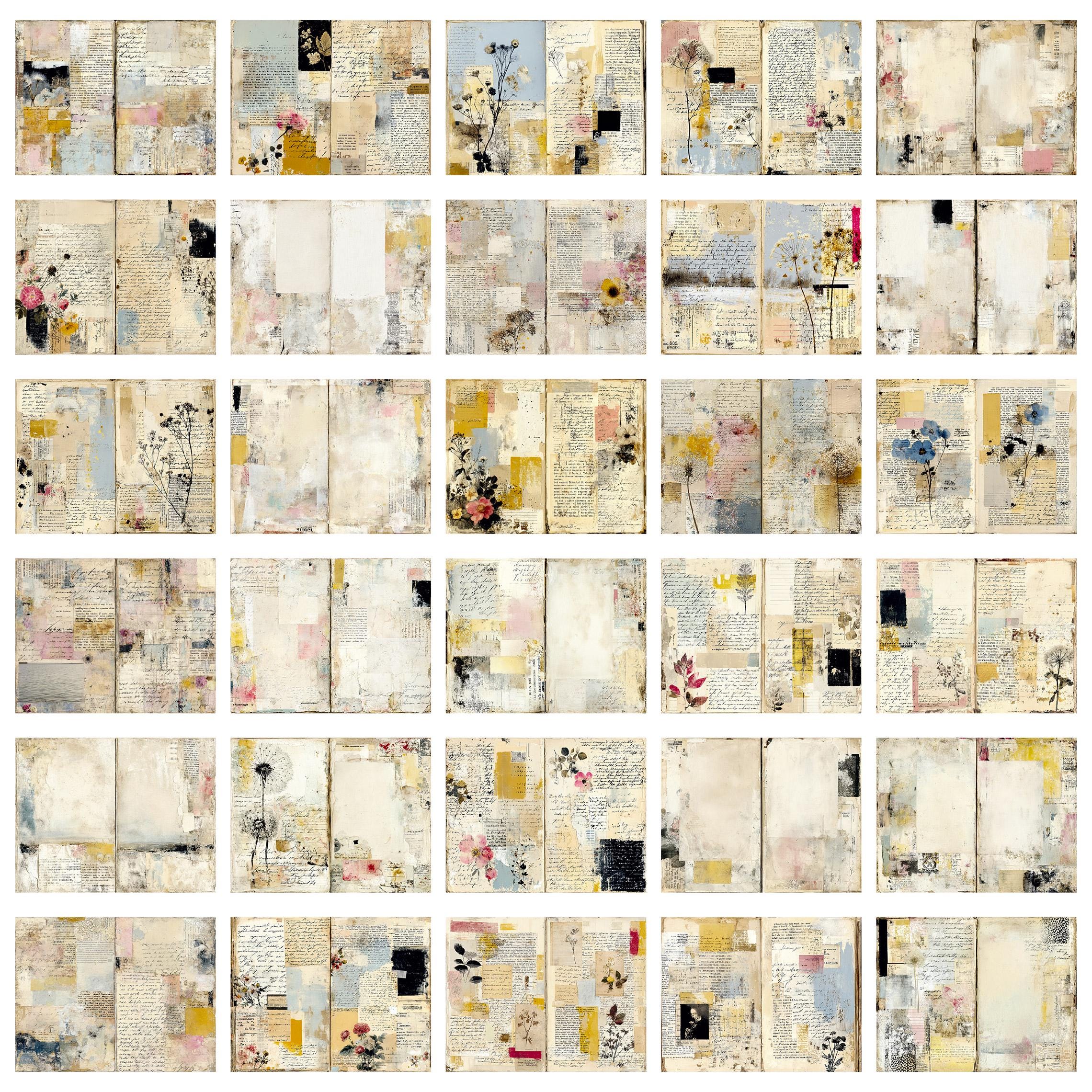 Softly layered papers, faded handwriting fragments, aged textures and gentle botanical traces come together without ever overpowering your words.