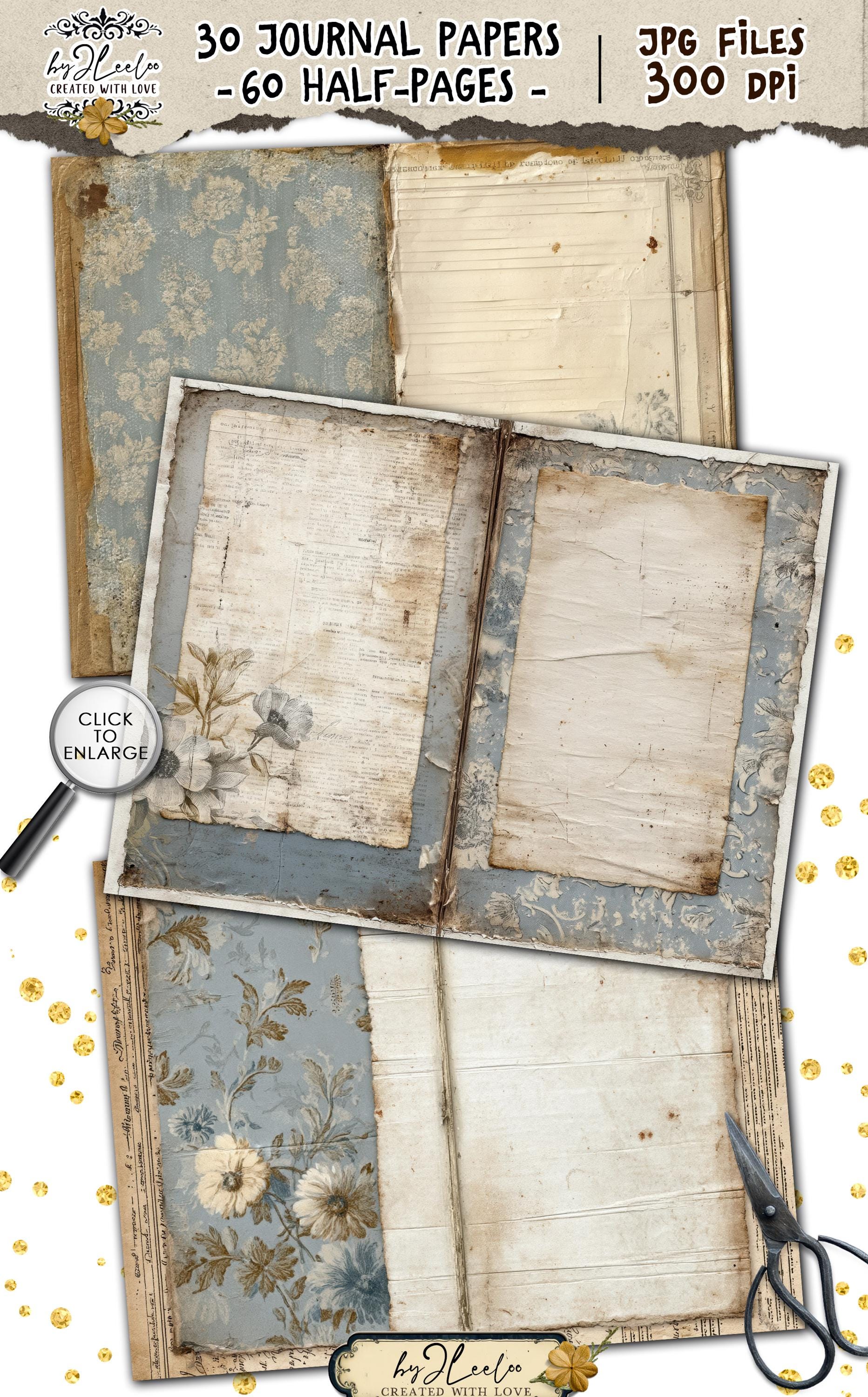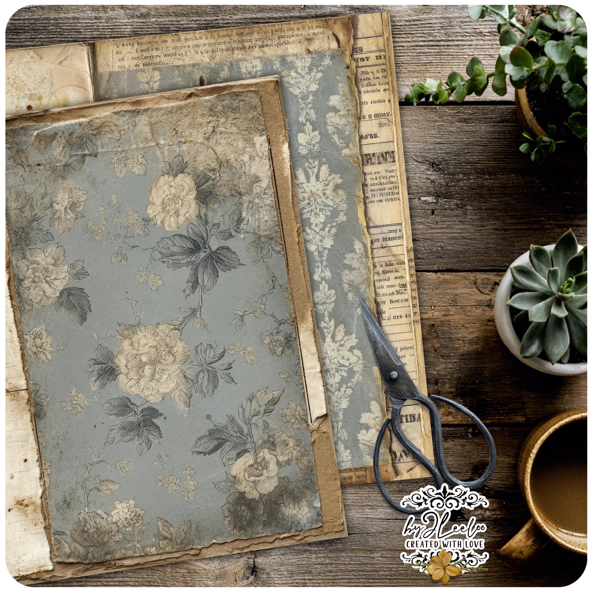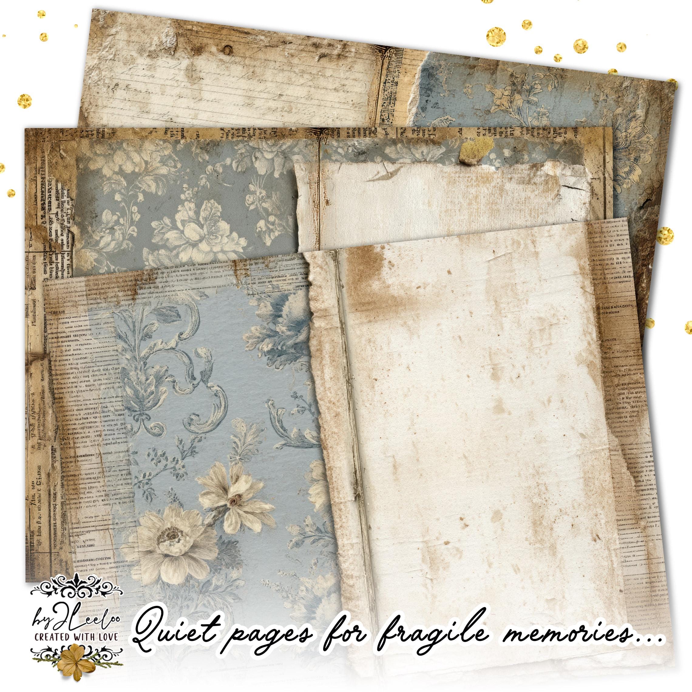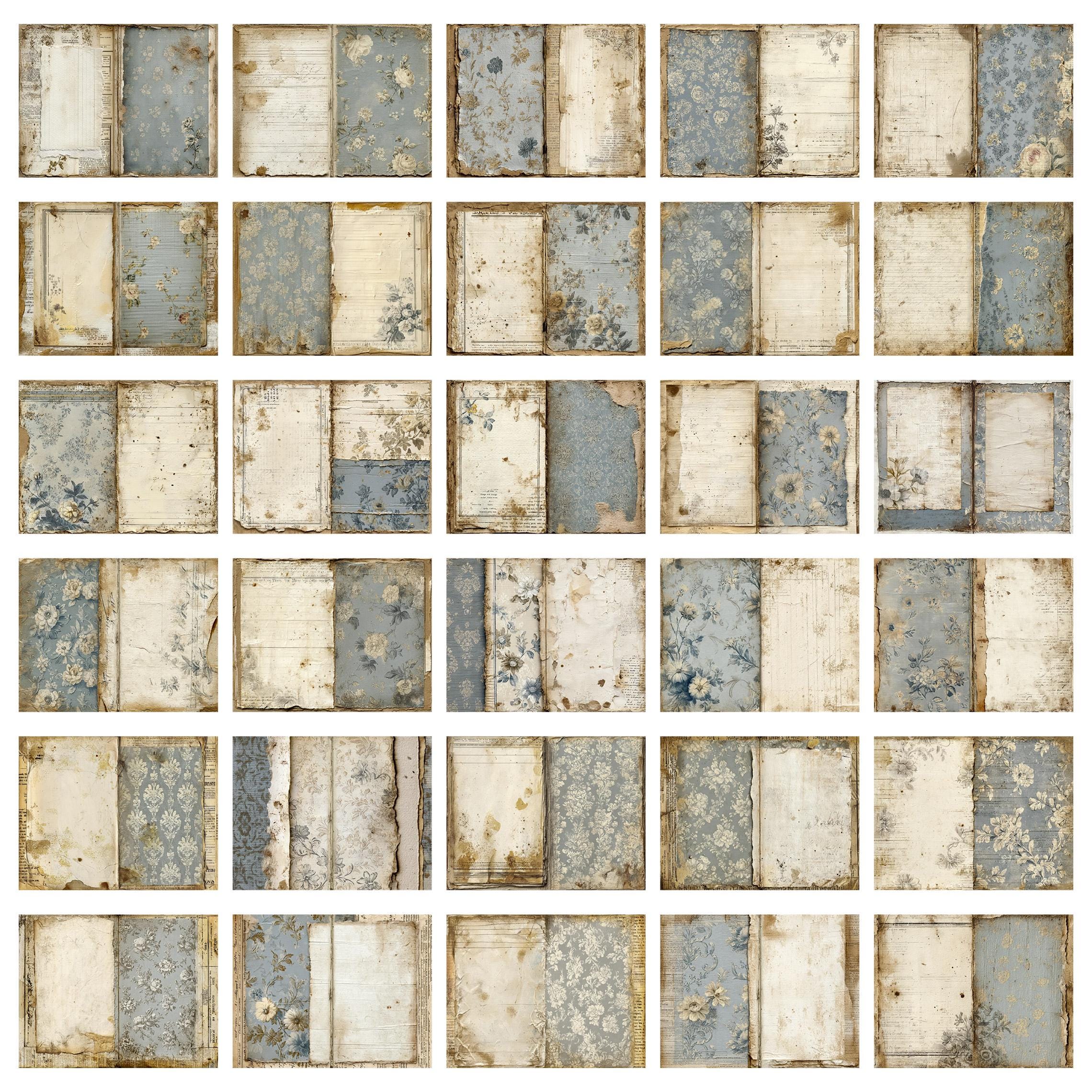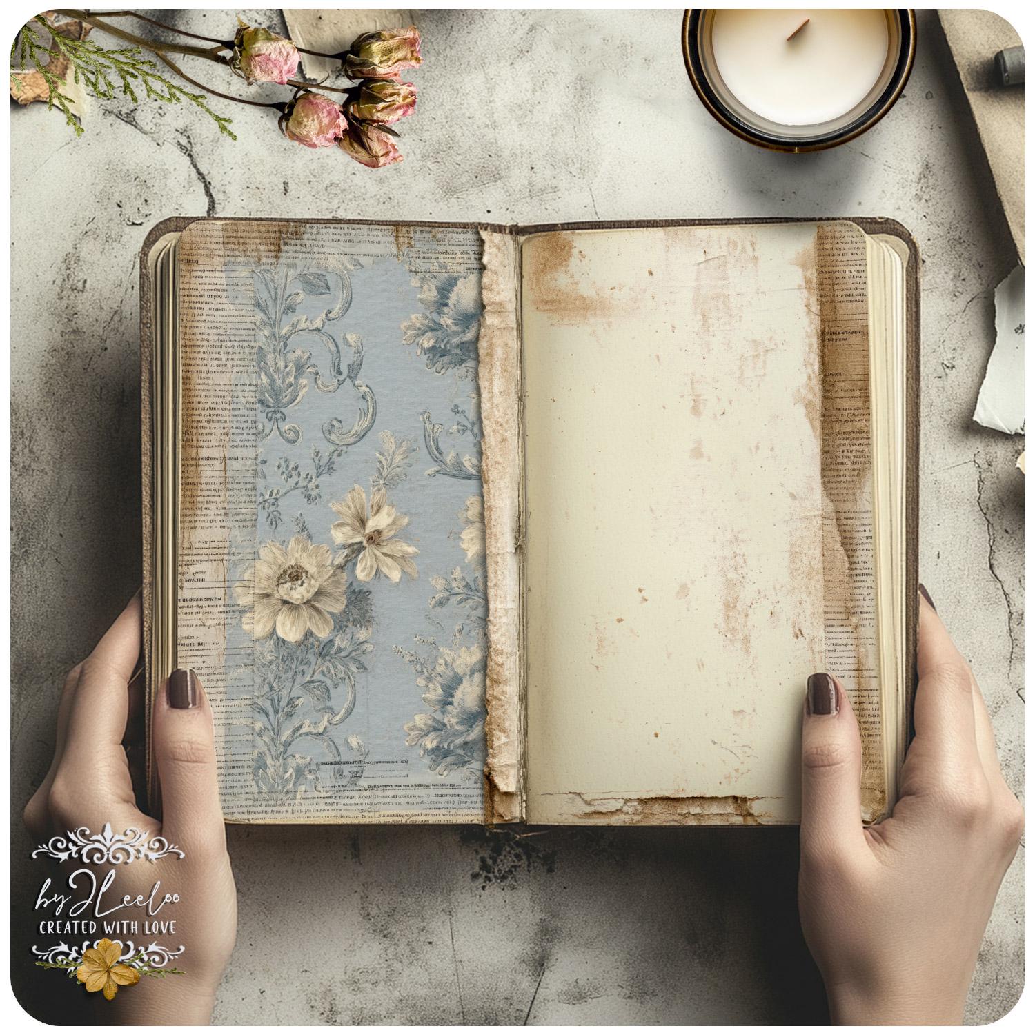 Muted blues, aged surfaces, subtle floral fragments and distressed paper details create calm, open backgrounds designed for writing, layering and slow journaling.