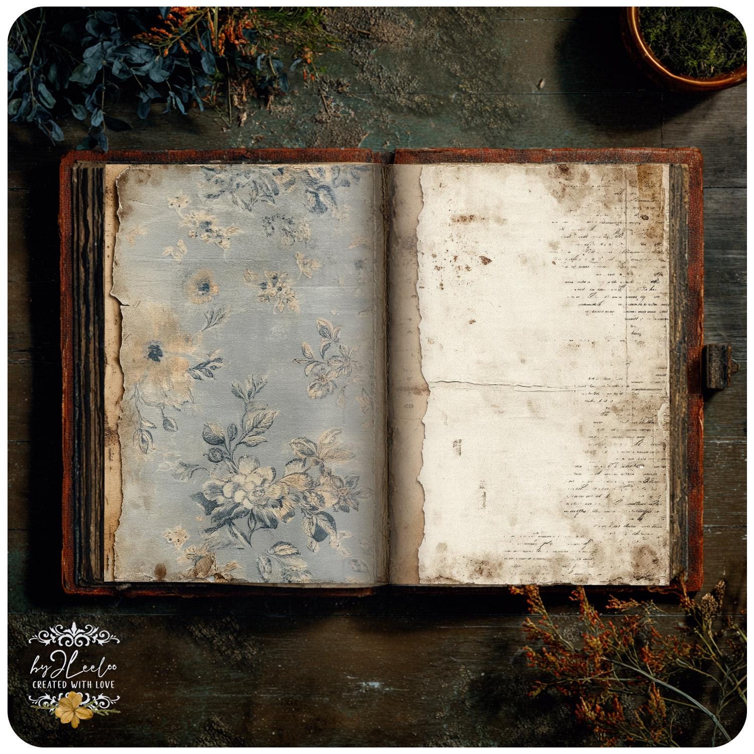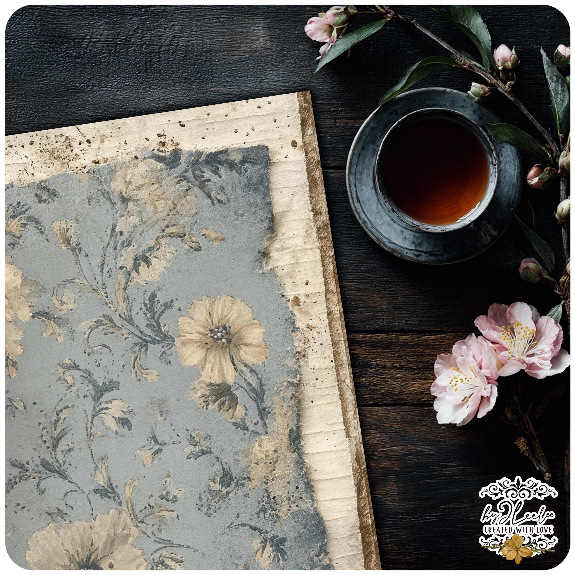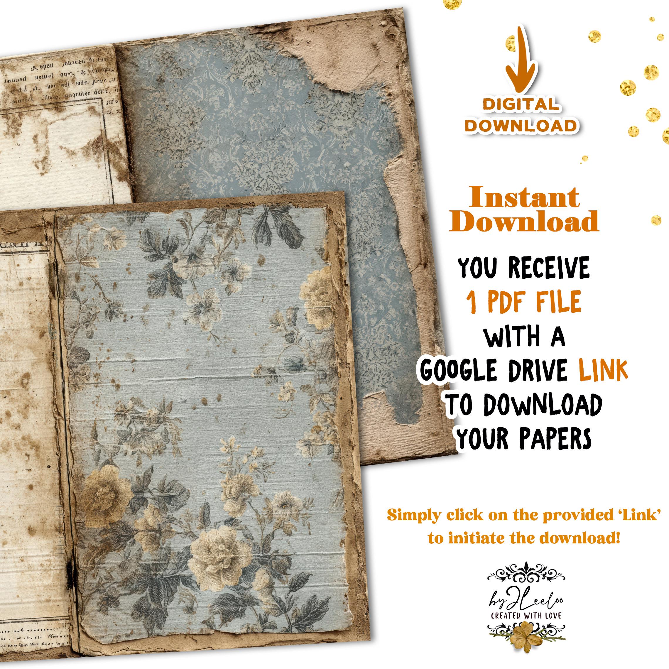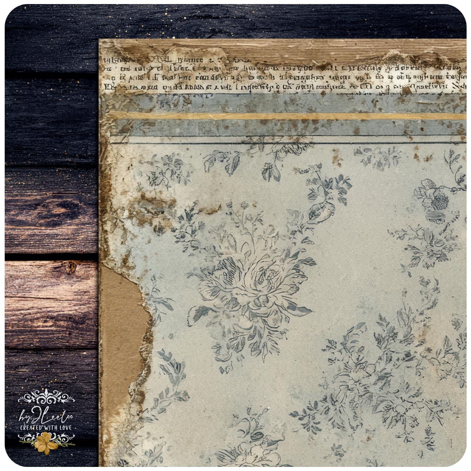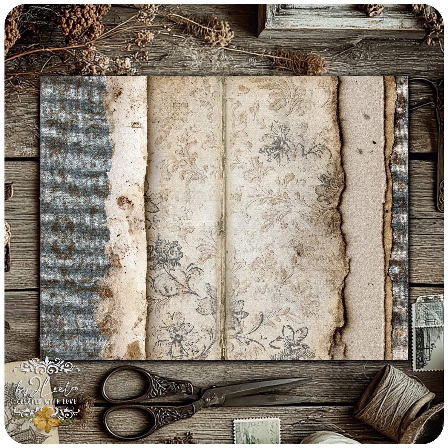 Muted blues, aged surfaces, subtle floral fragments and distressed paper details create calm, open backgrounds designed for writing, layering and slow journaling.
