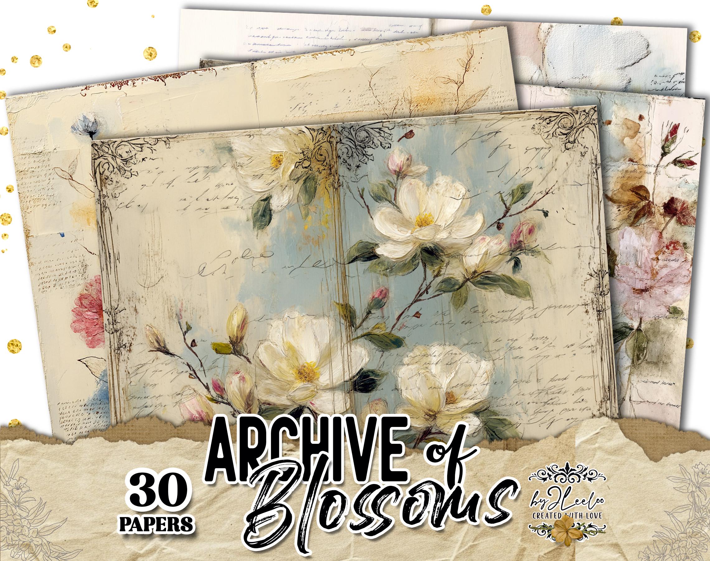 πΏ Archive of Blossoms Γ¨ una raccolta di mezze pagine botaniche dal sapore dβarchivio antico, dove petali morbidi e scritture sbiadite si incontrano su carte crema e azzurro polveroso.