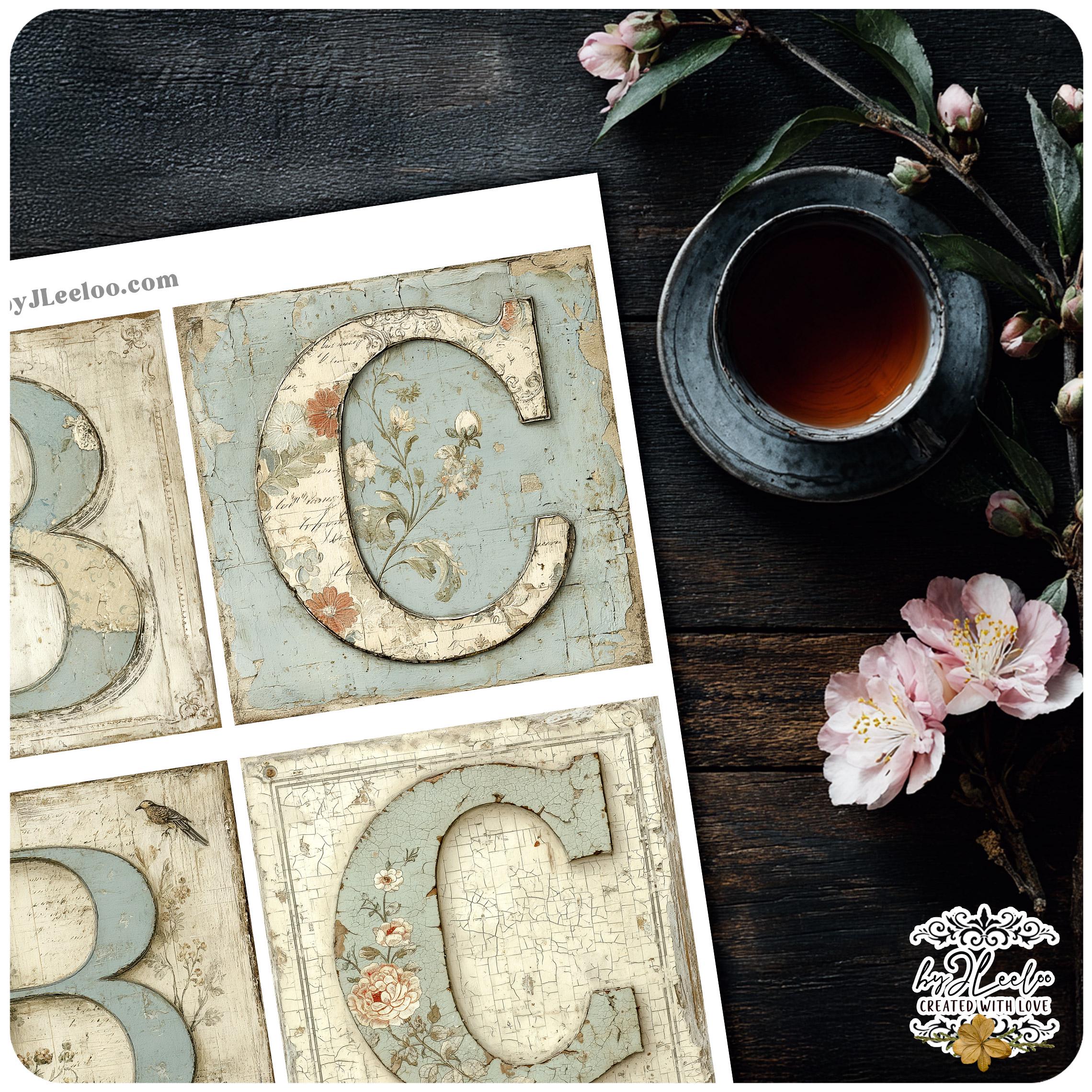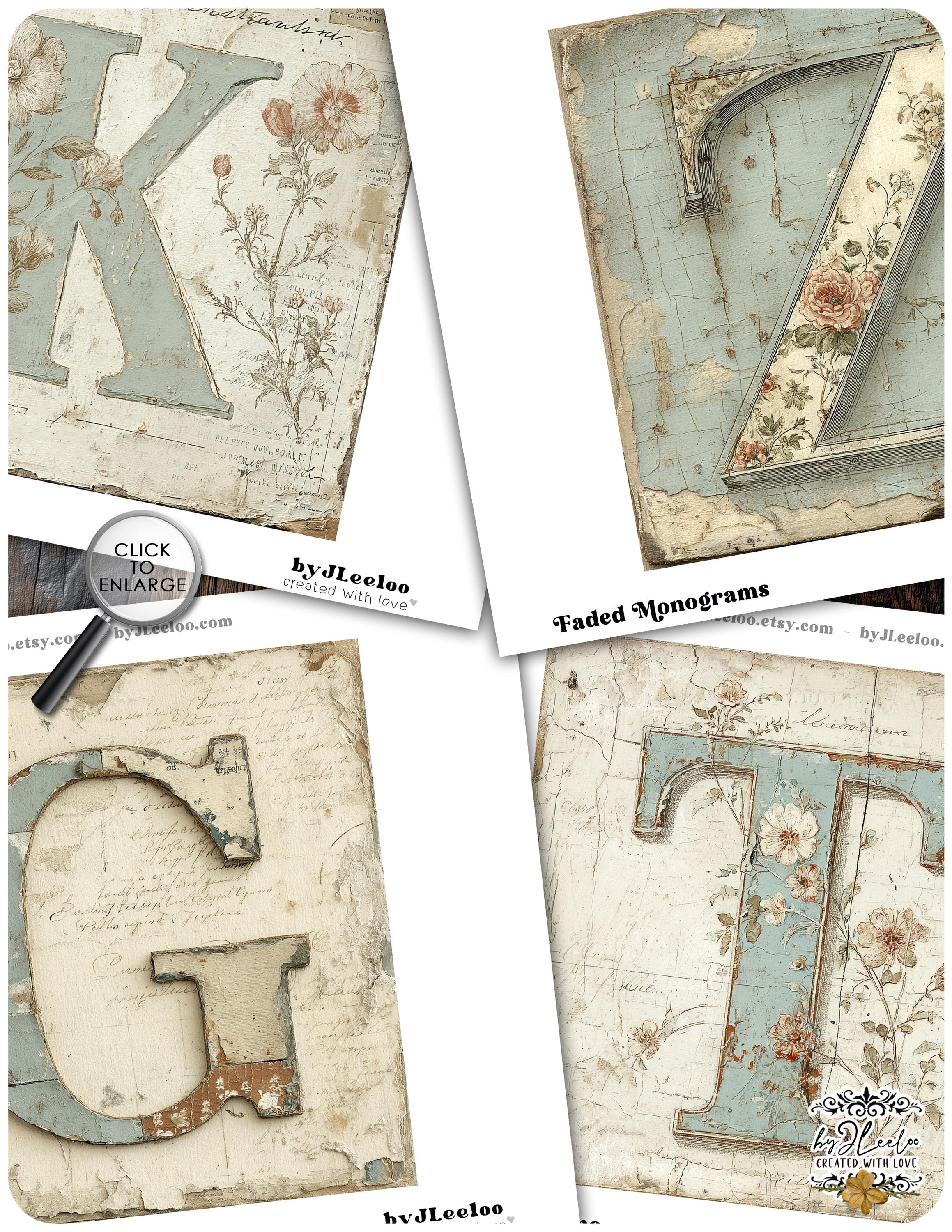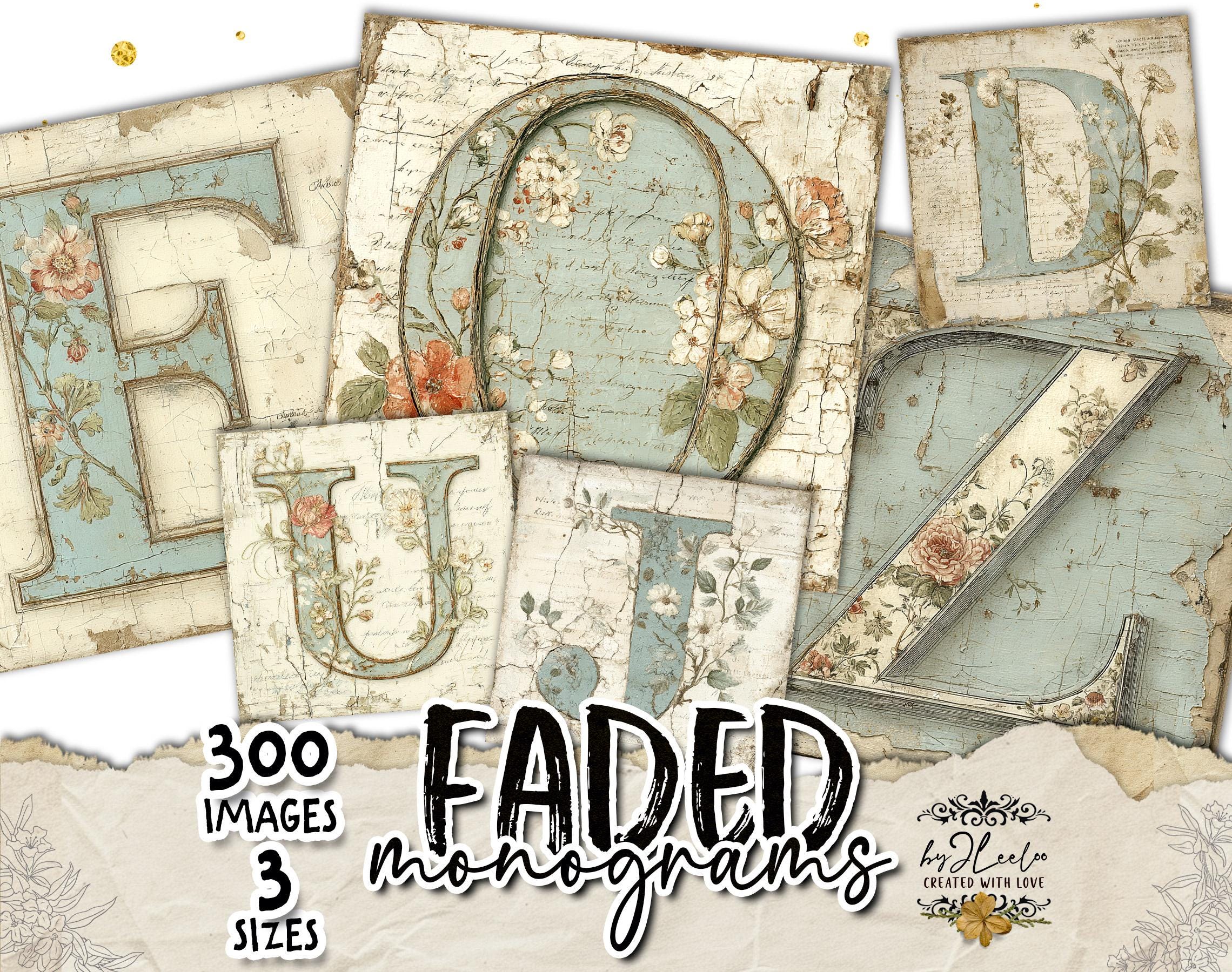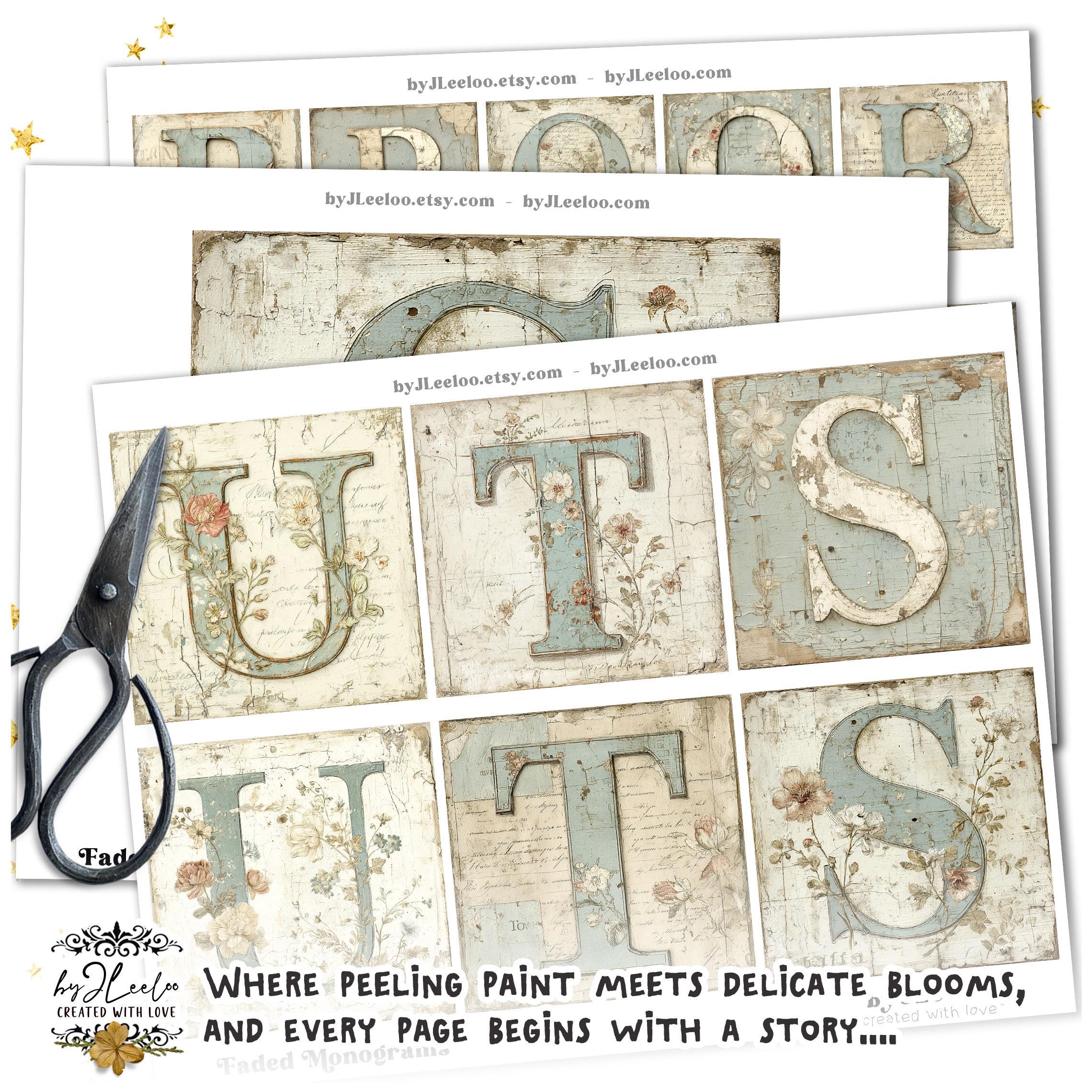 These vintage botanical monogram letters look as if they were lifted from an old French wall — layered with faded paint, handwritten script, and delicate hand-drawn florals.