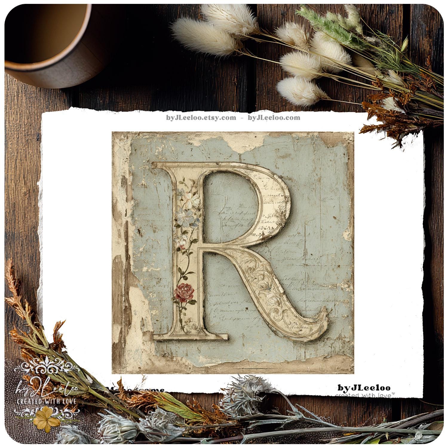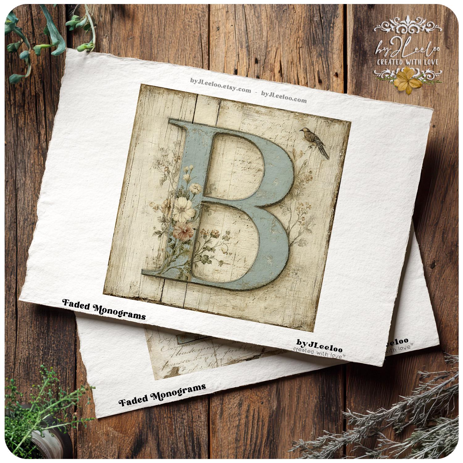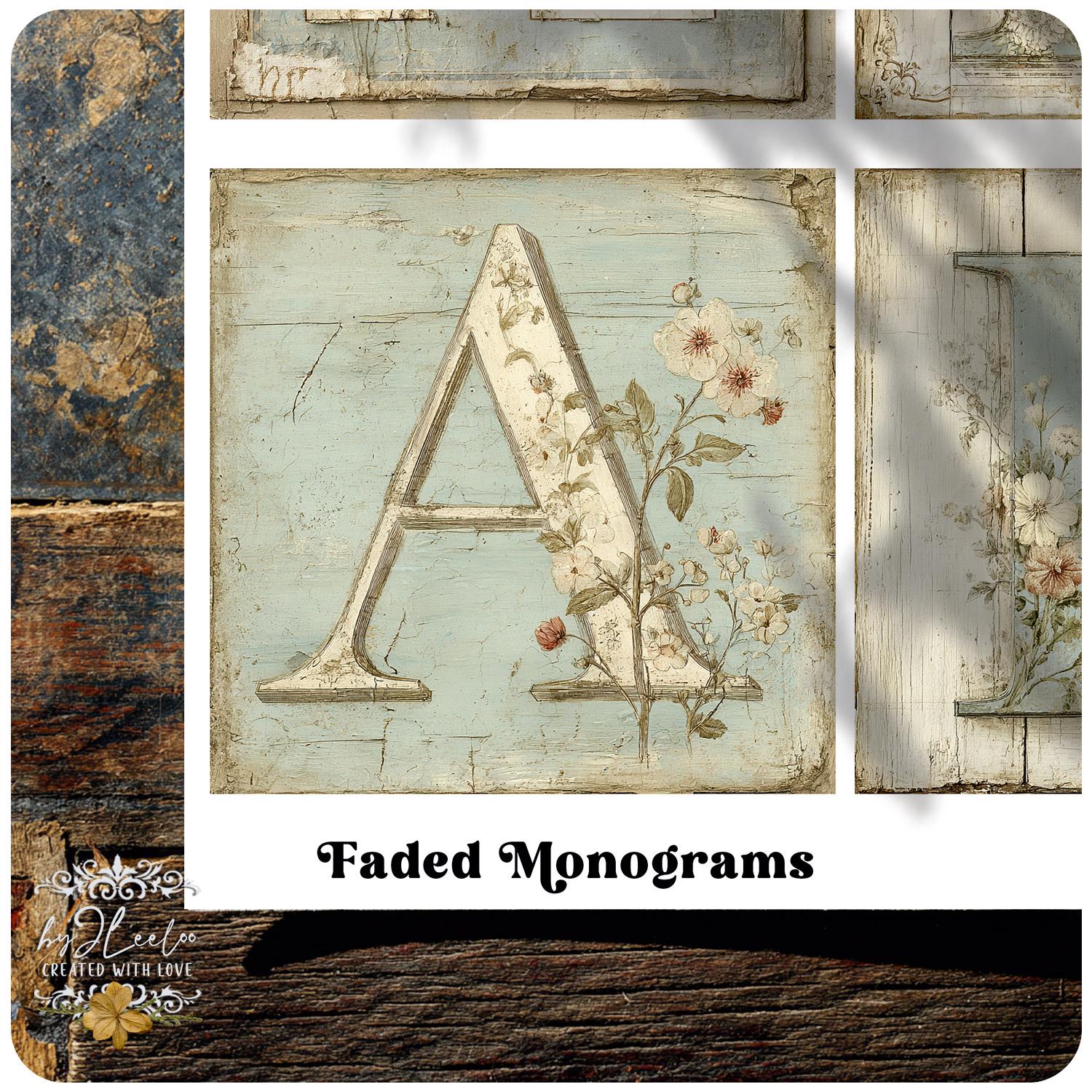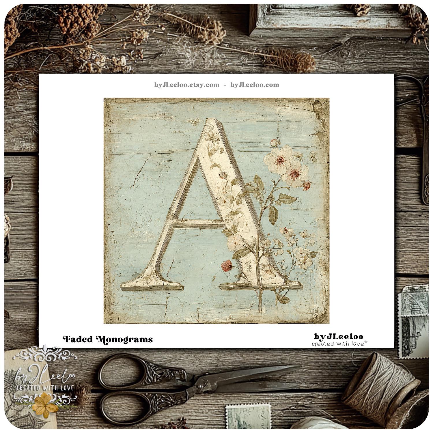 These vintage botanical monogram letters look as if they were lifted from an old French wall — layered with faded paint, handwritten script, and delicate hand-drawn florals.