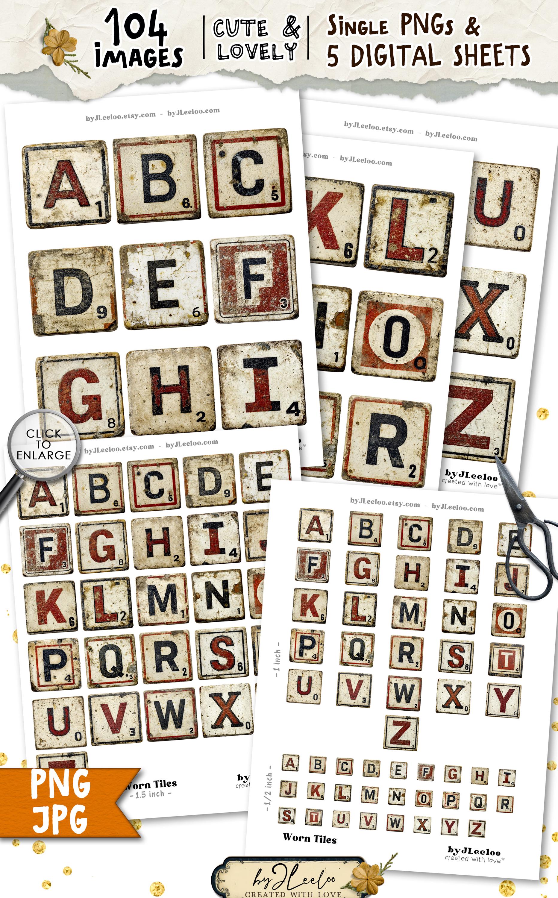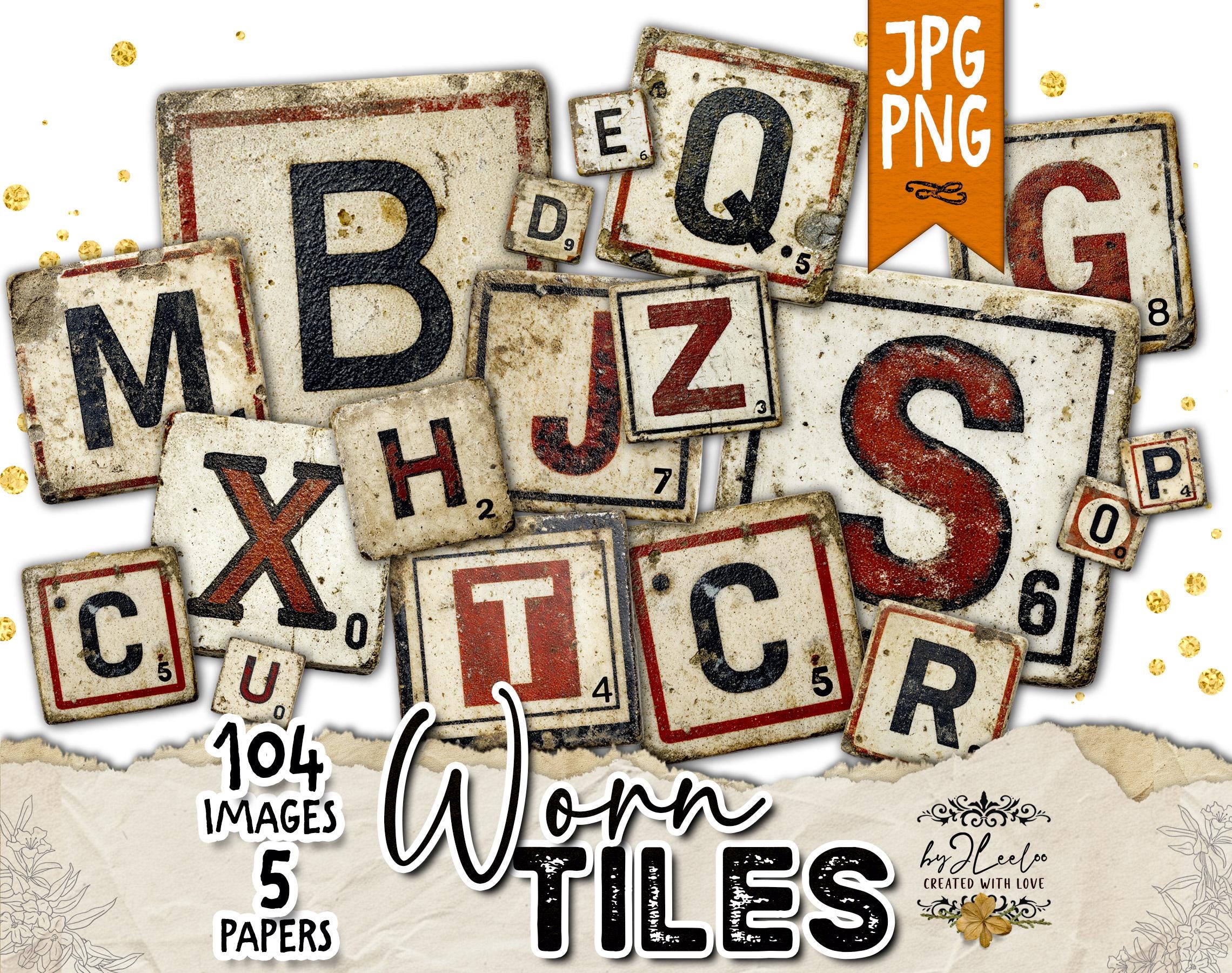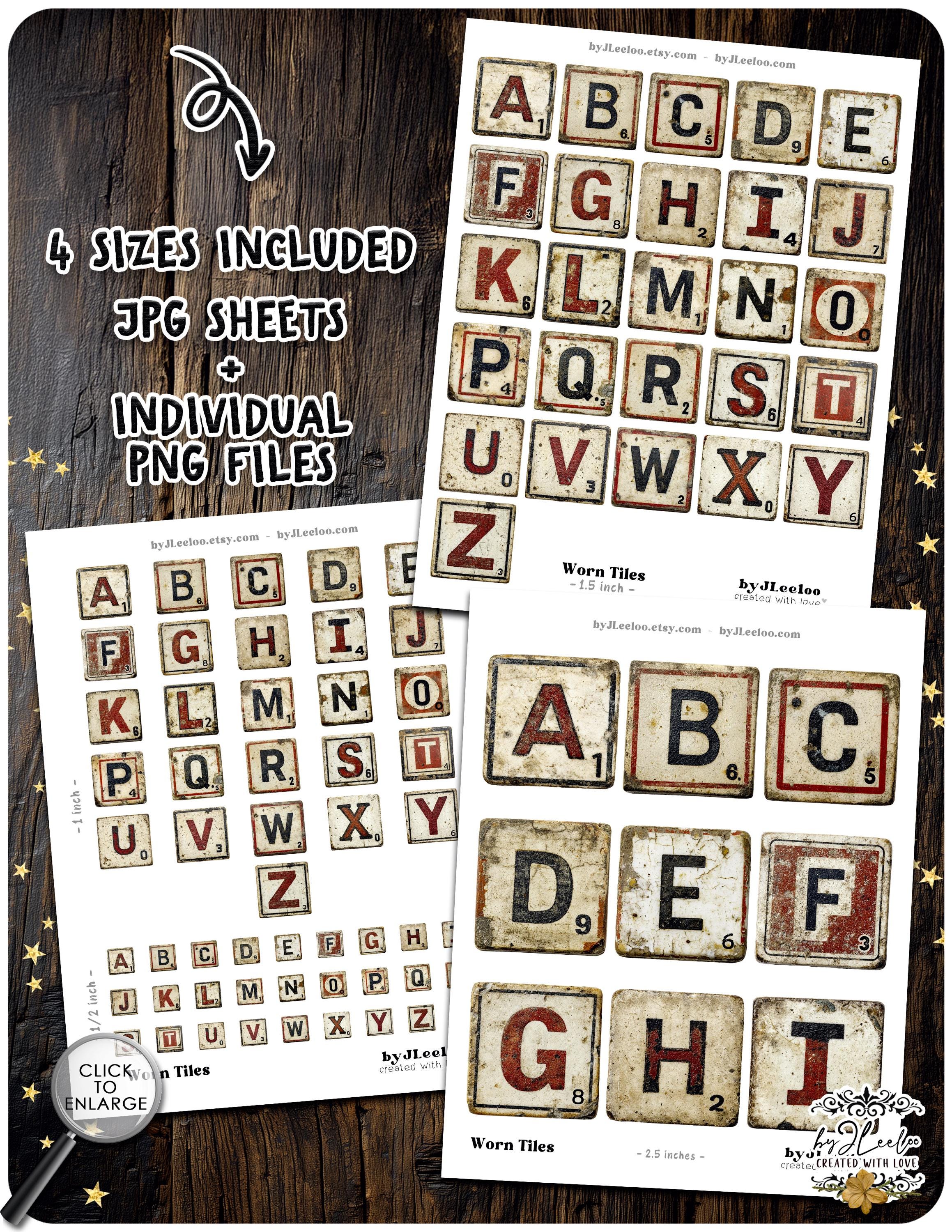 Worn Tiles is a full vintage-inspired letter tile alphabet set designed to look aged, imperfect, and beautifully timeworn.