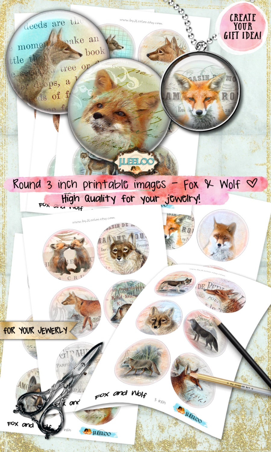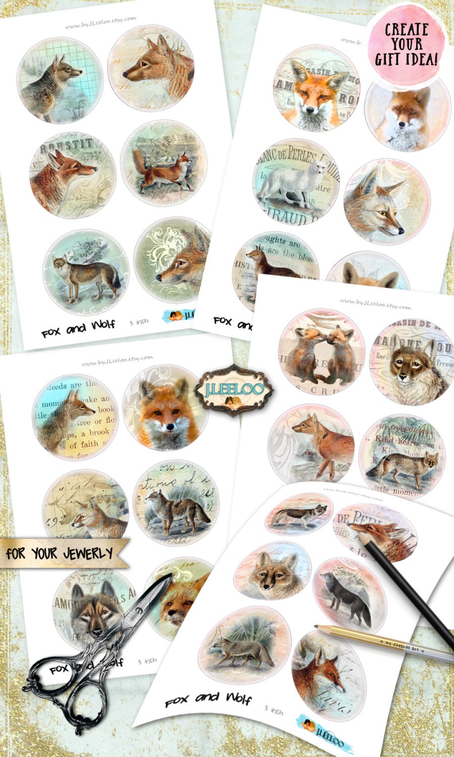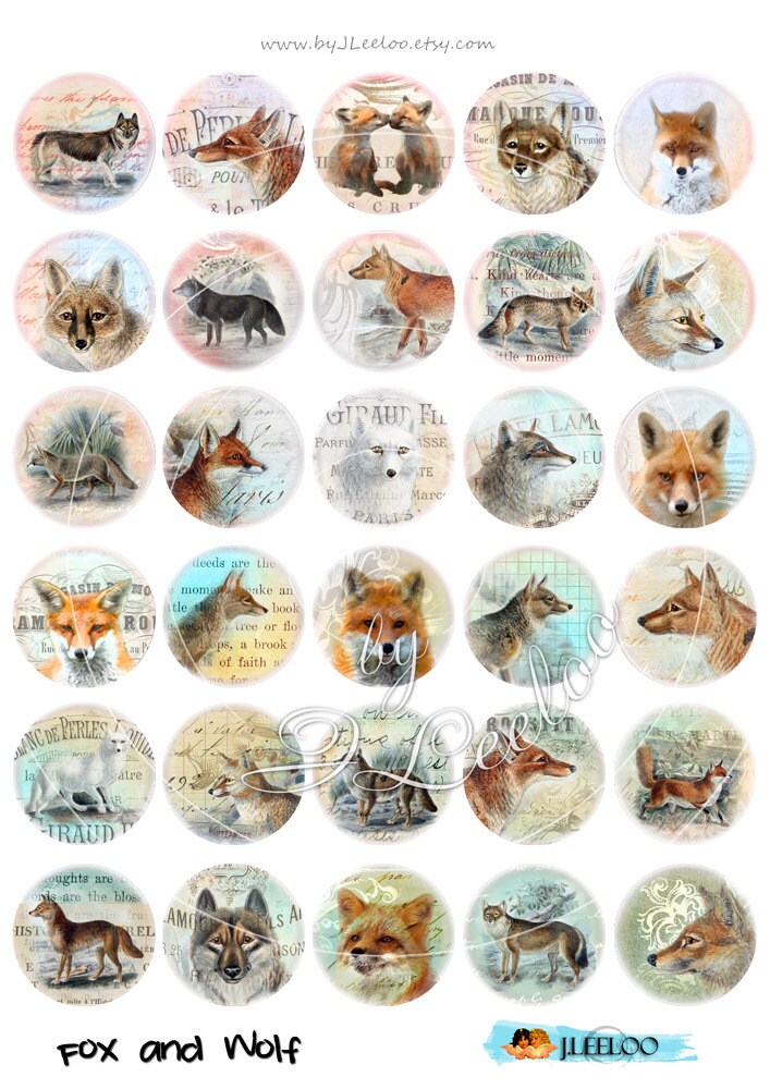 FOX AND WOLF - Instant download printable - digital collage sheets - circle images for your crafting project - magnets, glass cabochons, jewelry, resin pendants, hang tags, rings, earrings and all your need for your art.