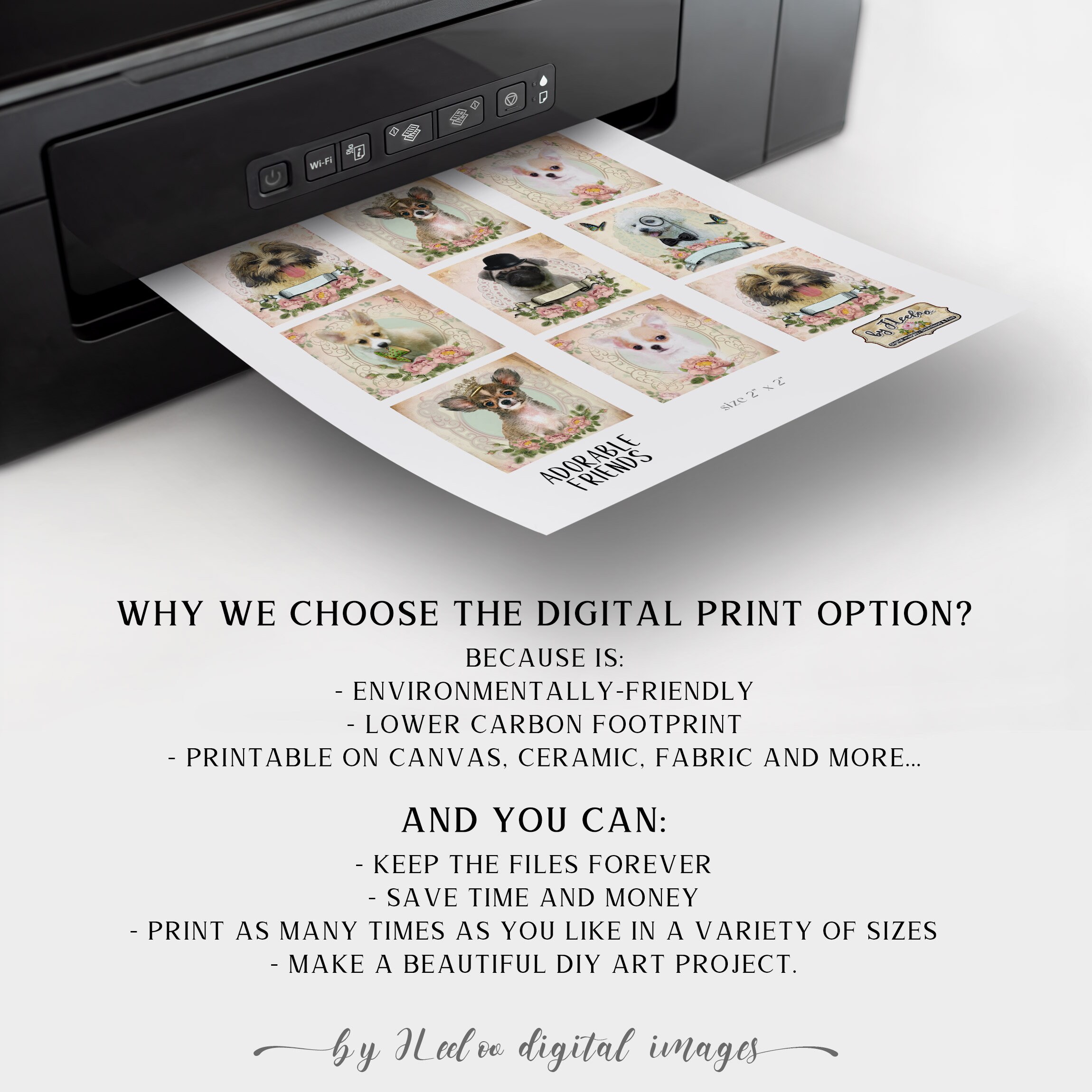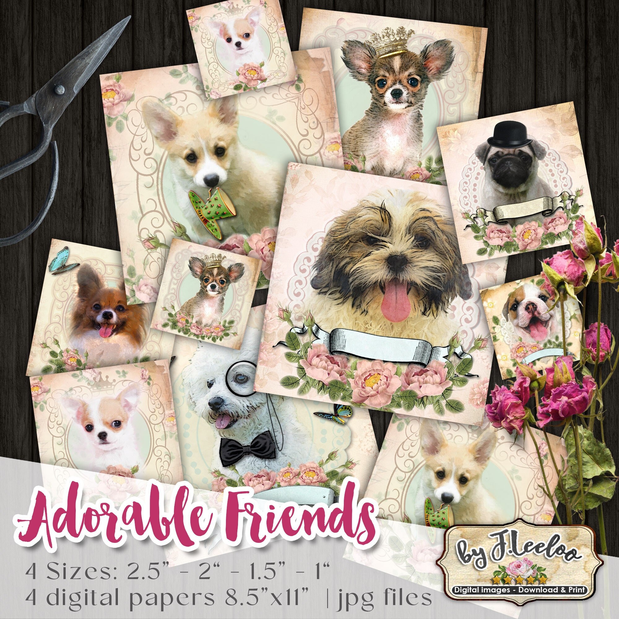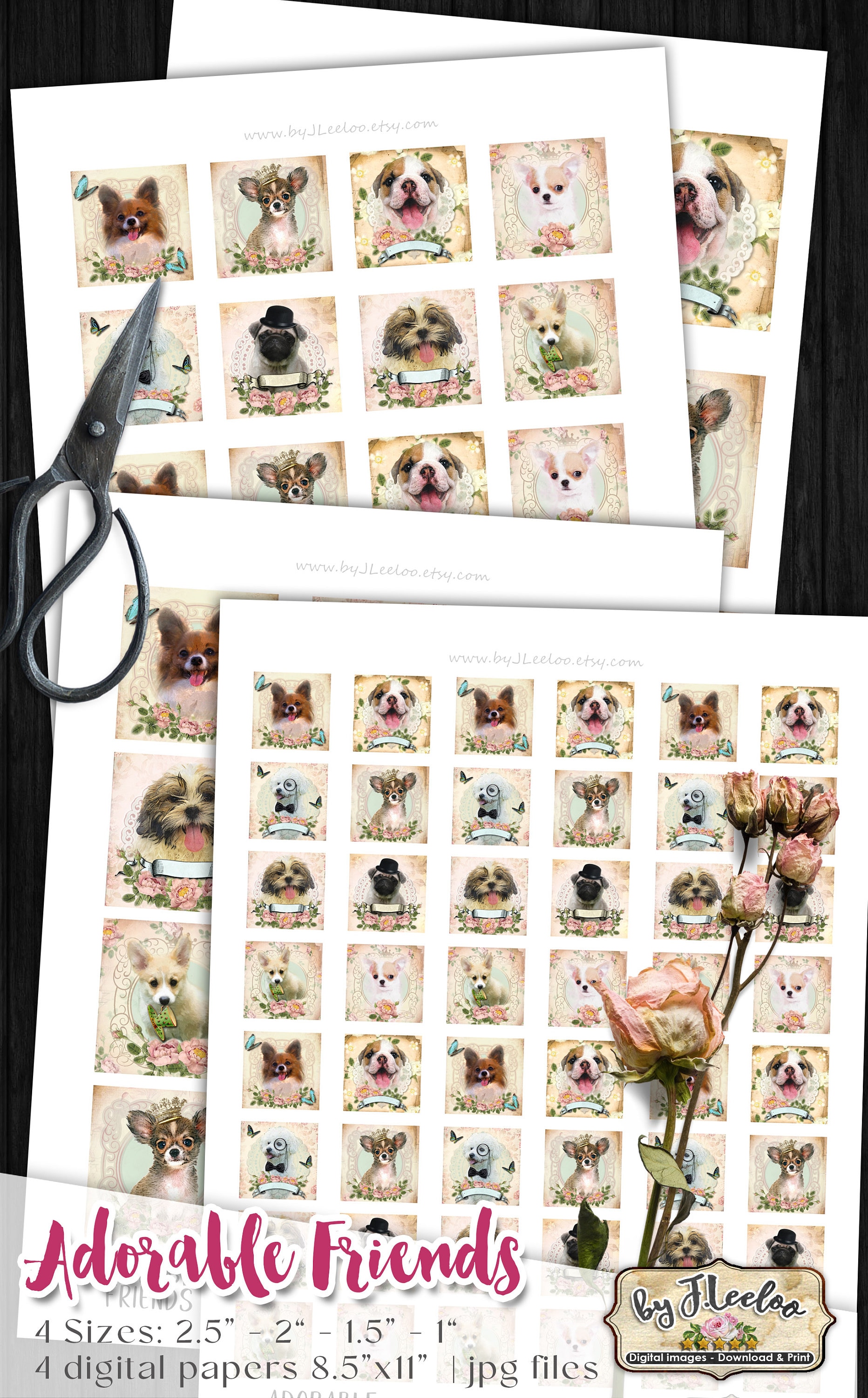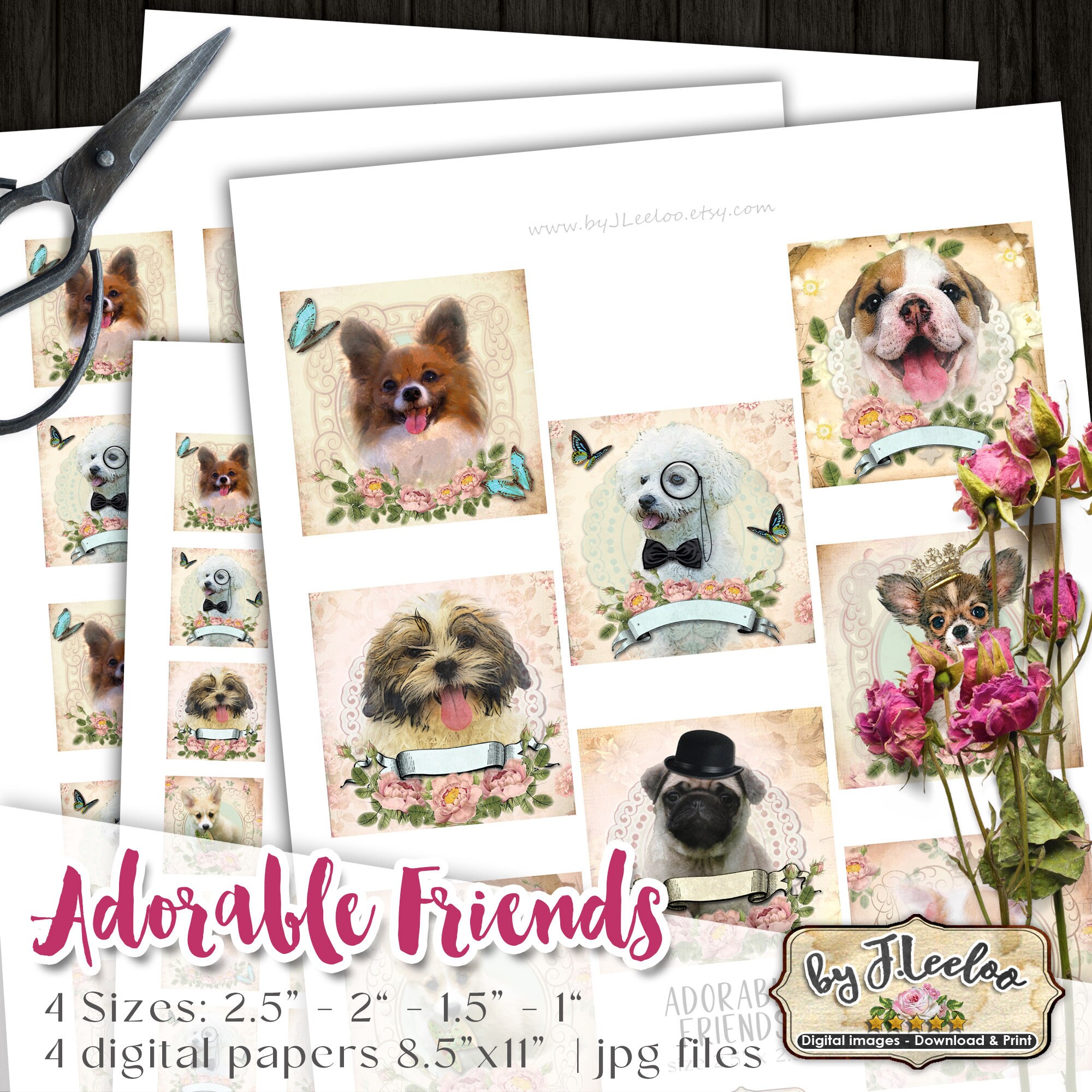 ADORABLE FRIENDS Digital collage sheets - square images instant download ready to print for thank you cards or hang tags, your jewelry making, resin pendants, rings, earrings and button, for magnets, stickers, scrapbook and your others craft project.