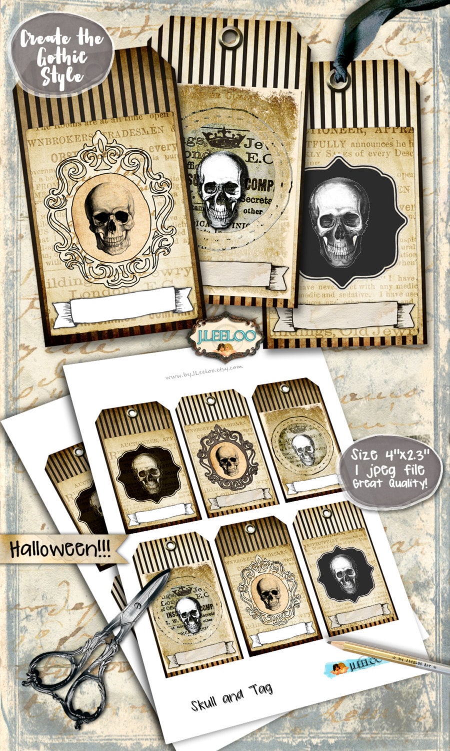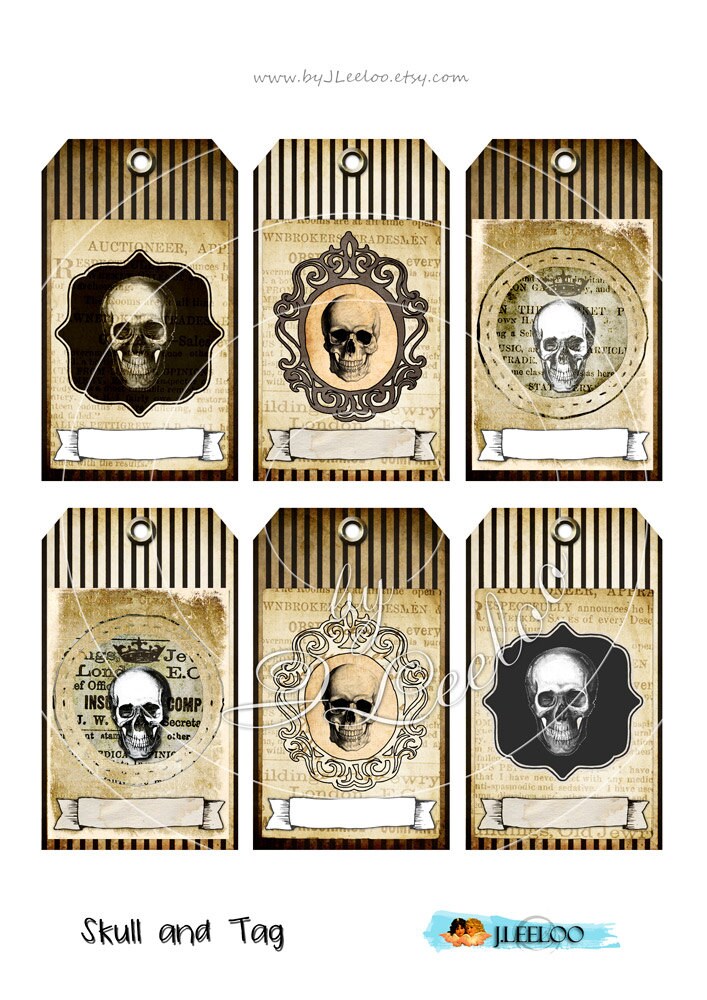 SKULL AND TAG - Digital collage sheets halloween and steampunk : download and print for hang tags, labels, scrapbook, jewelry holders, cards, and your others craft project.