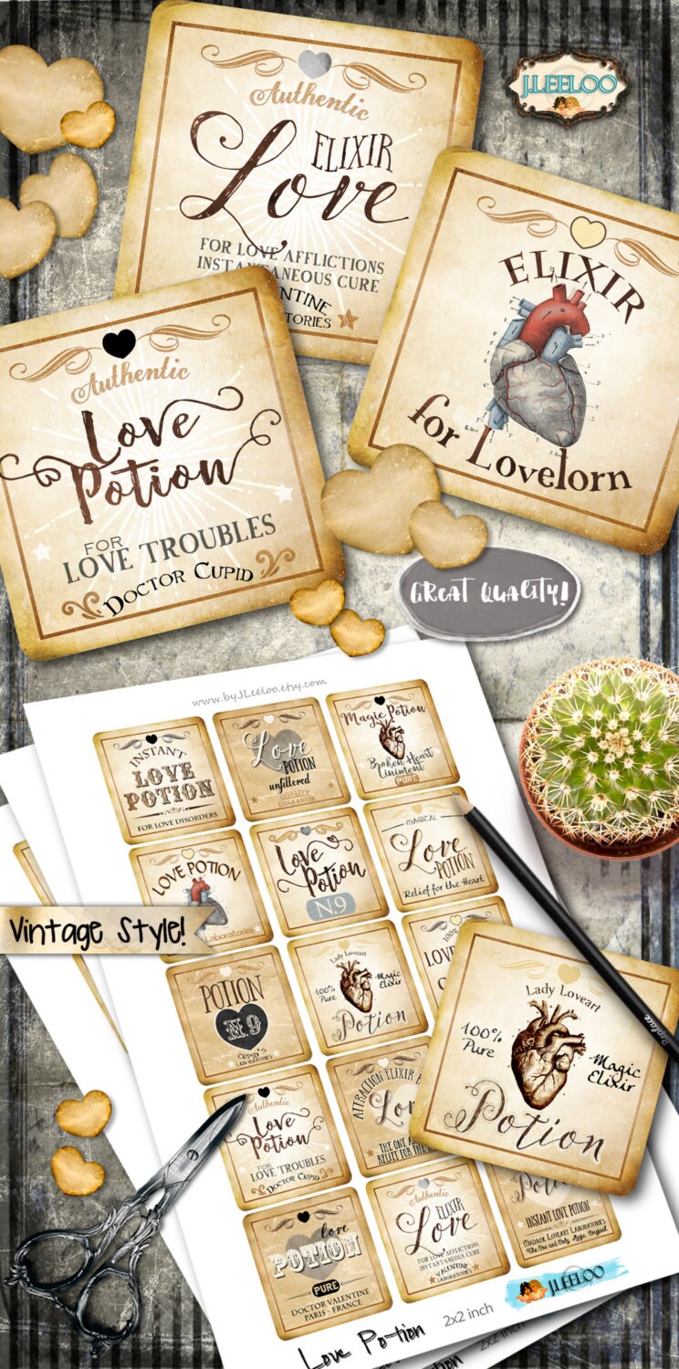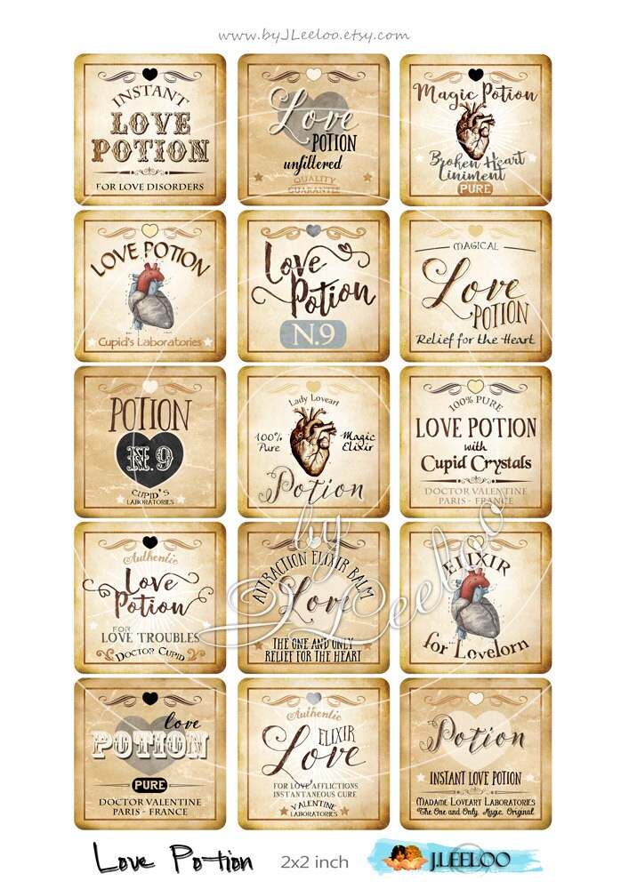 LOVE POTION Instant Download - Digital collage sheet - Square valentine printable steampunk heart for apothecary jar labels, jewelry, glass cabochons, paper goods, cards, bottle caps, stickers, hang tags and all your artwork.