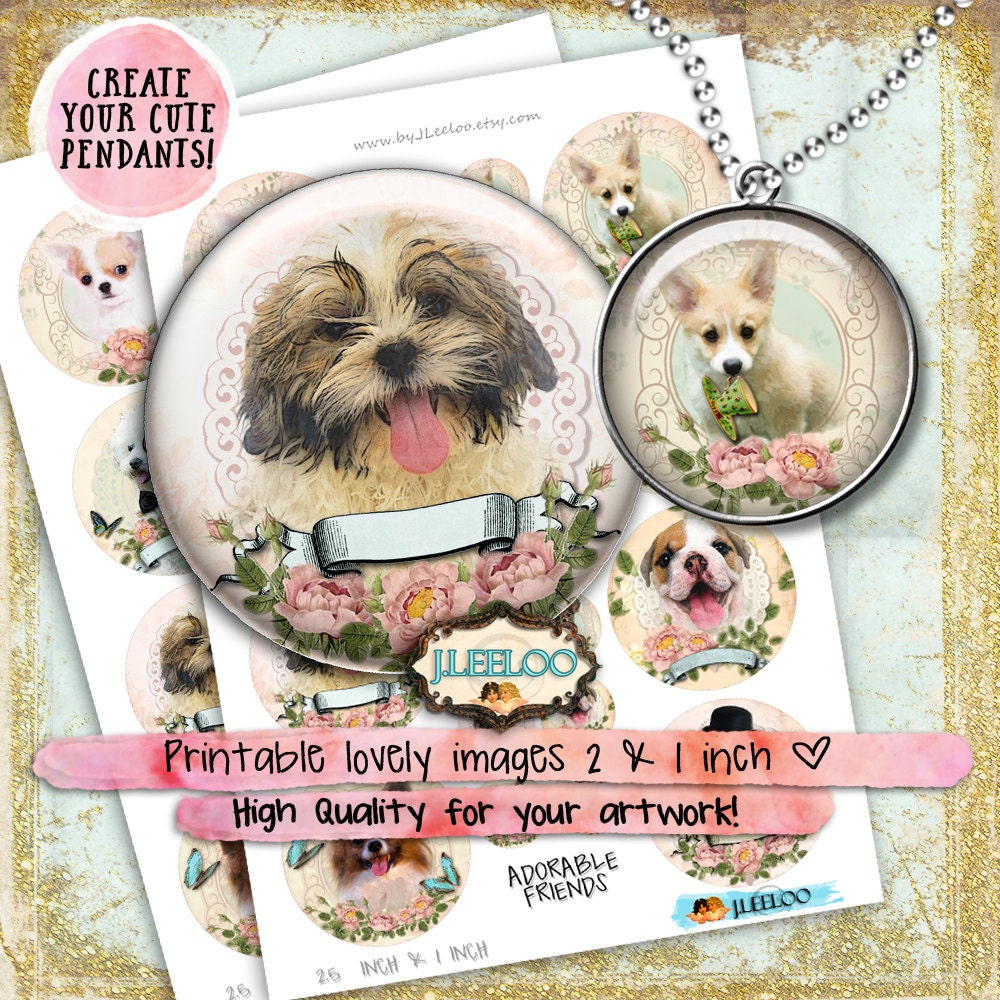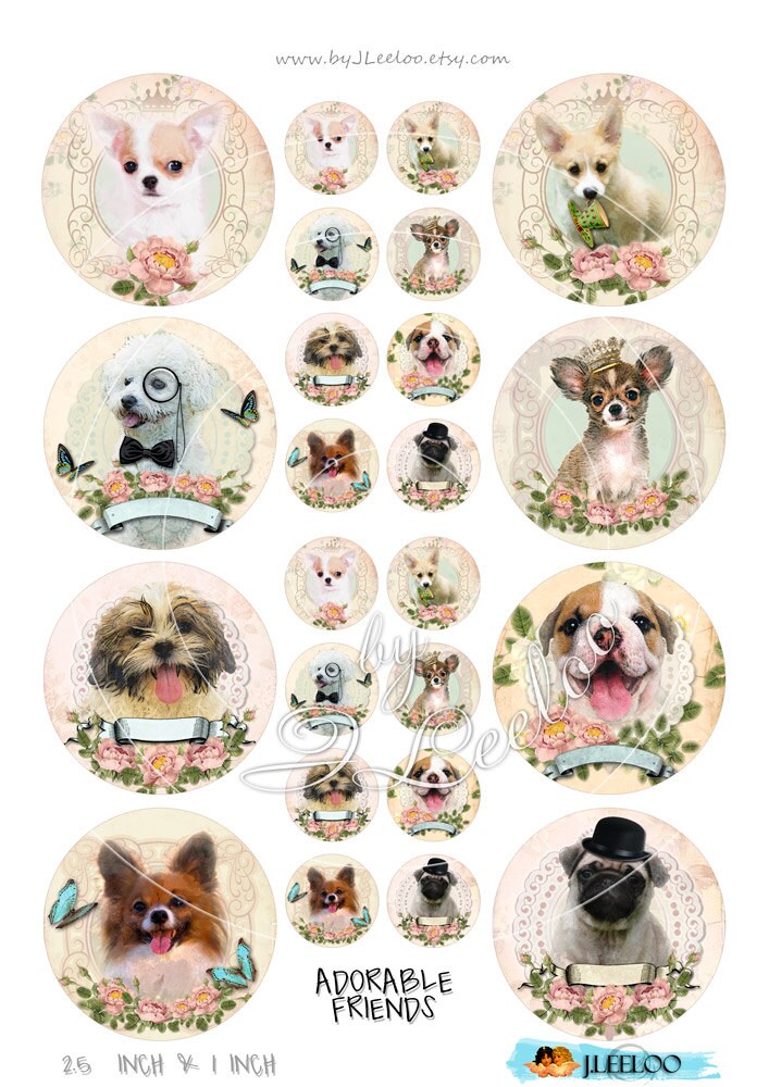 ADORABLE FRIENDS Digital collage sheets - round images instant download ready to print for thank you cards or hang tags, your jewelry making, resin pendants, rings, earrings and button, for magnets, stickers, scrapbook and your others craft project.
