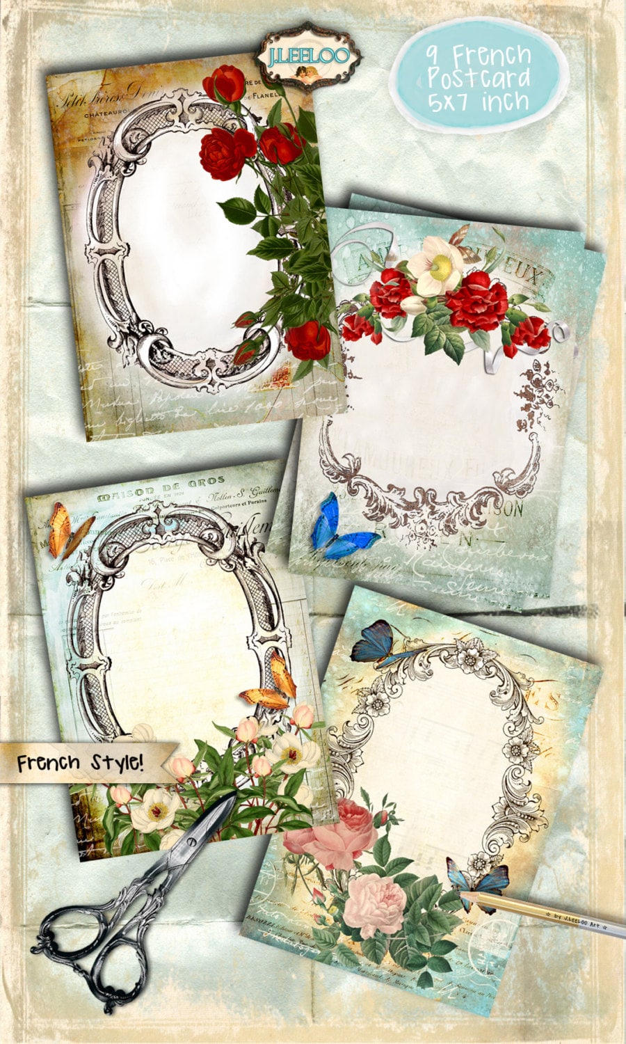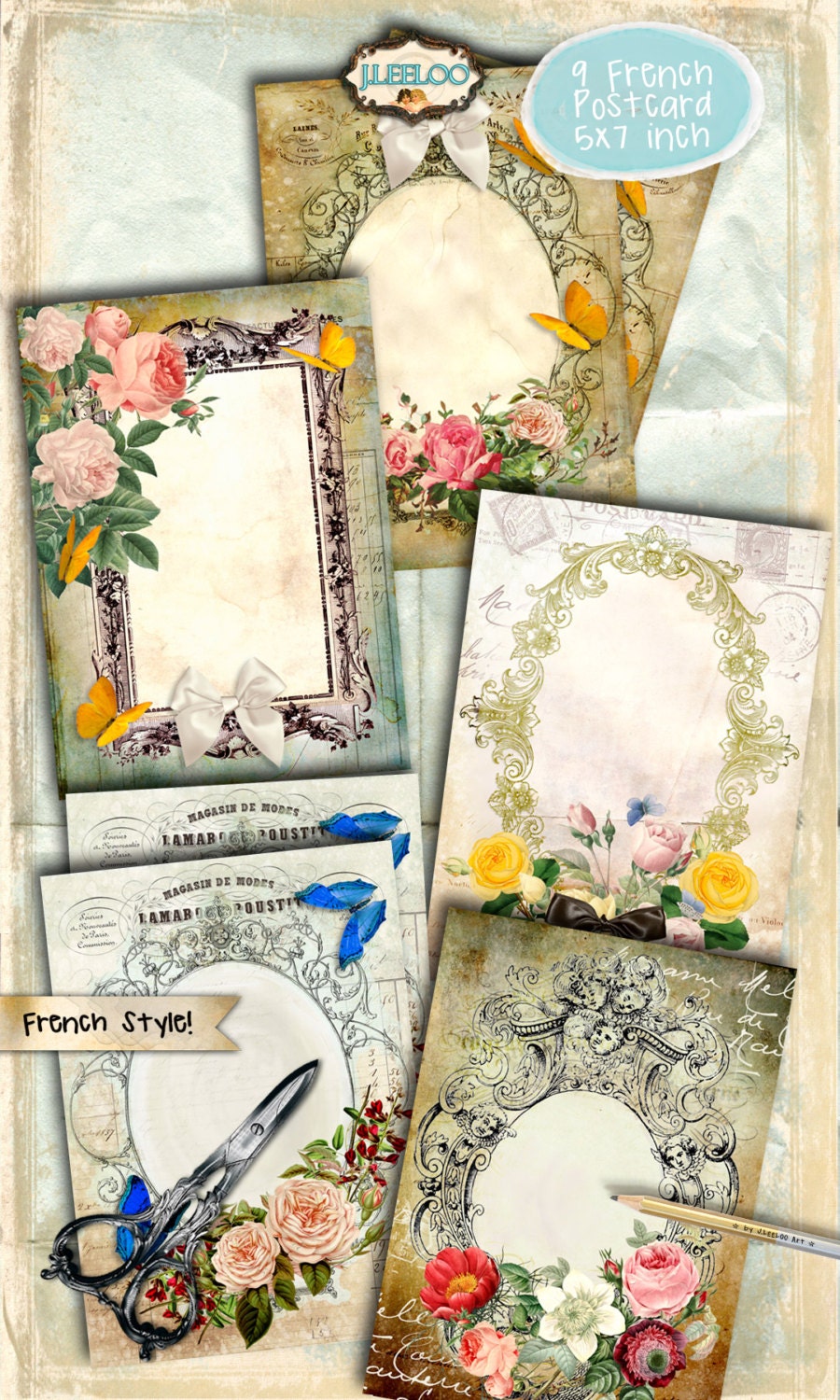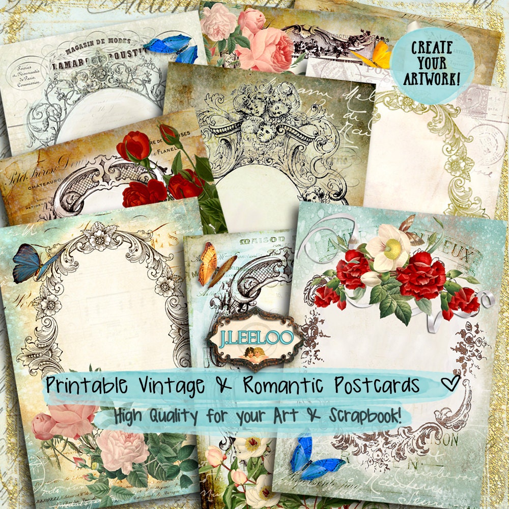 FRENCH POSTCARD Digital collage sheet - vintage paper greeting card Victorian style digital papers: images for your diary, artwork, postcards, hang tags, invitations, greeting cards, annuncements, scrapbook, backing cards.... all for your crafting project!