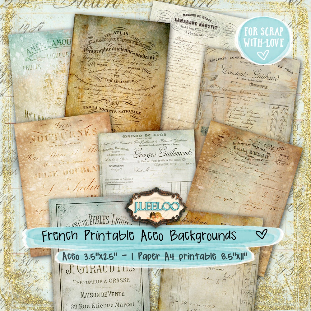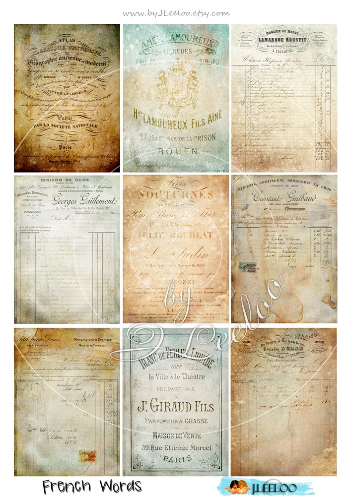 FRENCH WORDS aceo background digital collage sheet - Digital papers: images for your artwork, postcards, hang tags, invitations, greeting cards, annuncements, scrapbook, backing cards.... all for your crafting project!