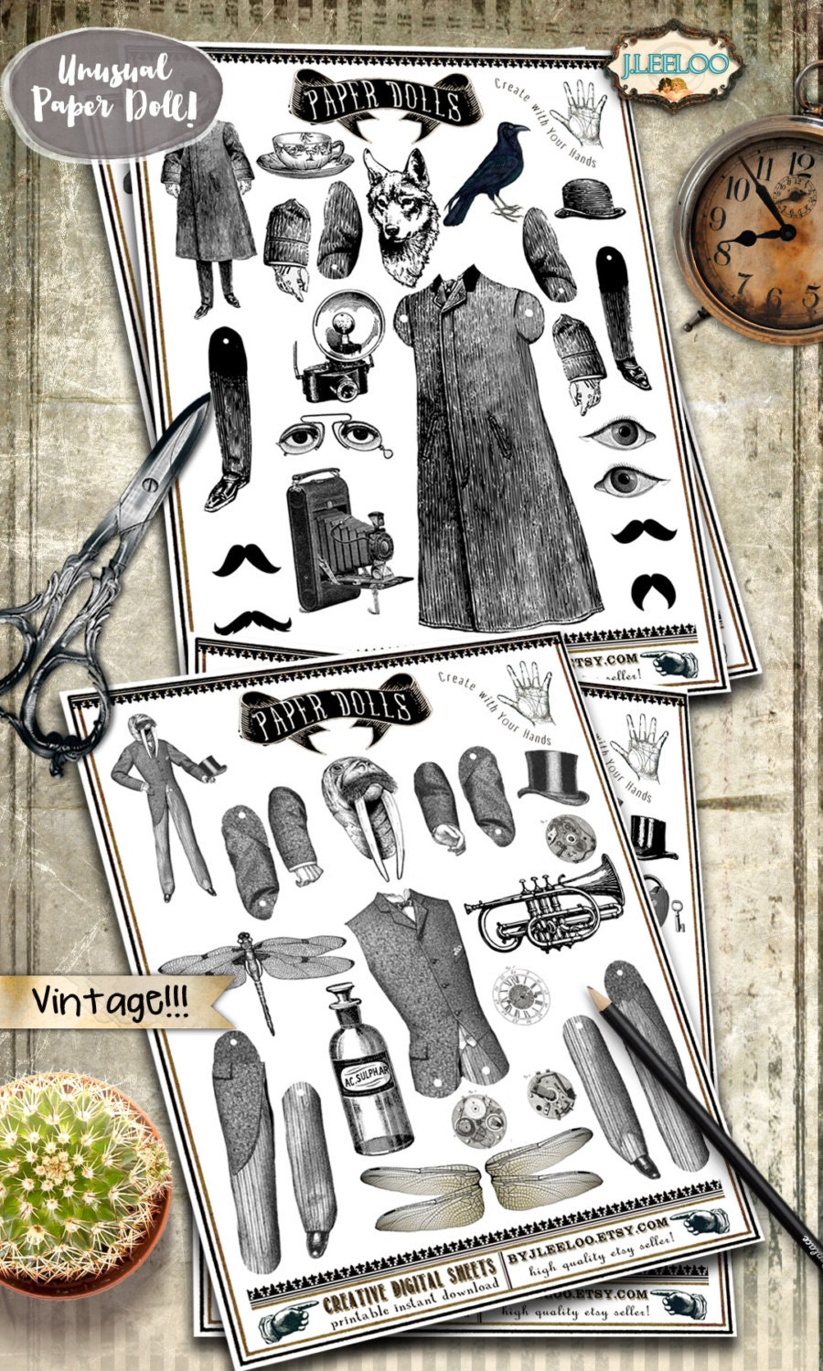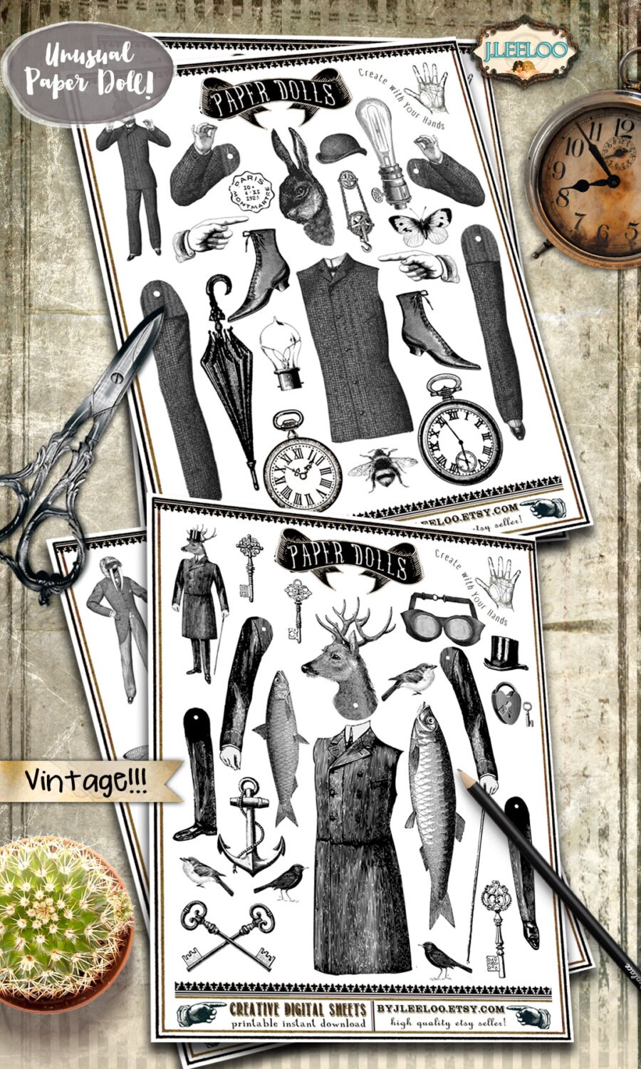 Digital collage sheet doll - Digital paper: printable paper doll for your artwork and crafting project - Altered art, steampunk, scrpbook, vintage project etc... free your imagination!