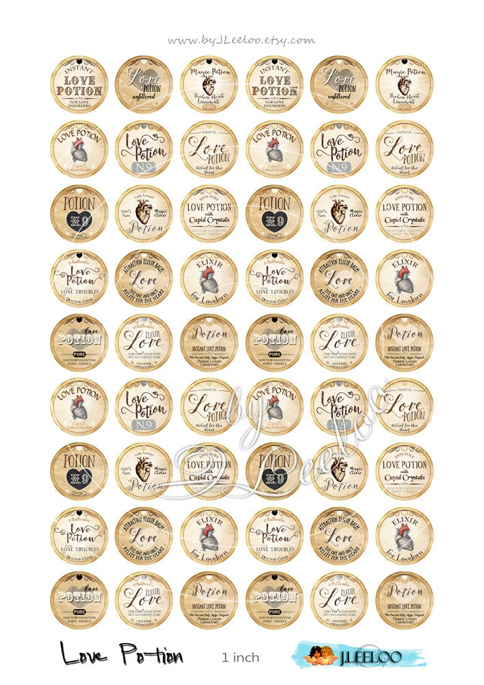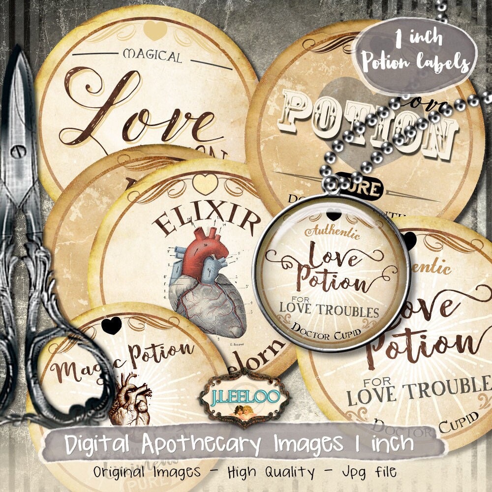 LOVE POTION Instant Download - Digital collage sheet - Circle printable steampunk heart for apothecary jar labels, jewelry, glass cabochons, paper goods, cards, bottle caps, stickers, hang tags and all your artwork.
